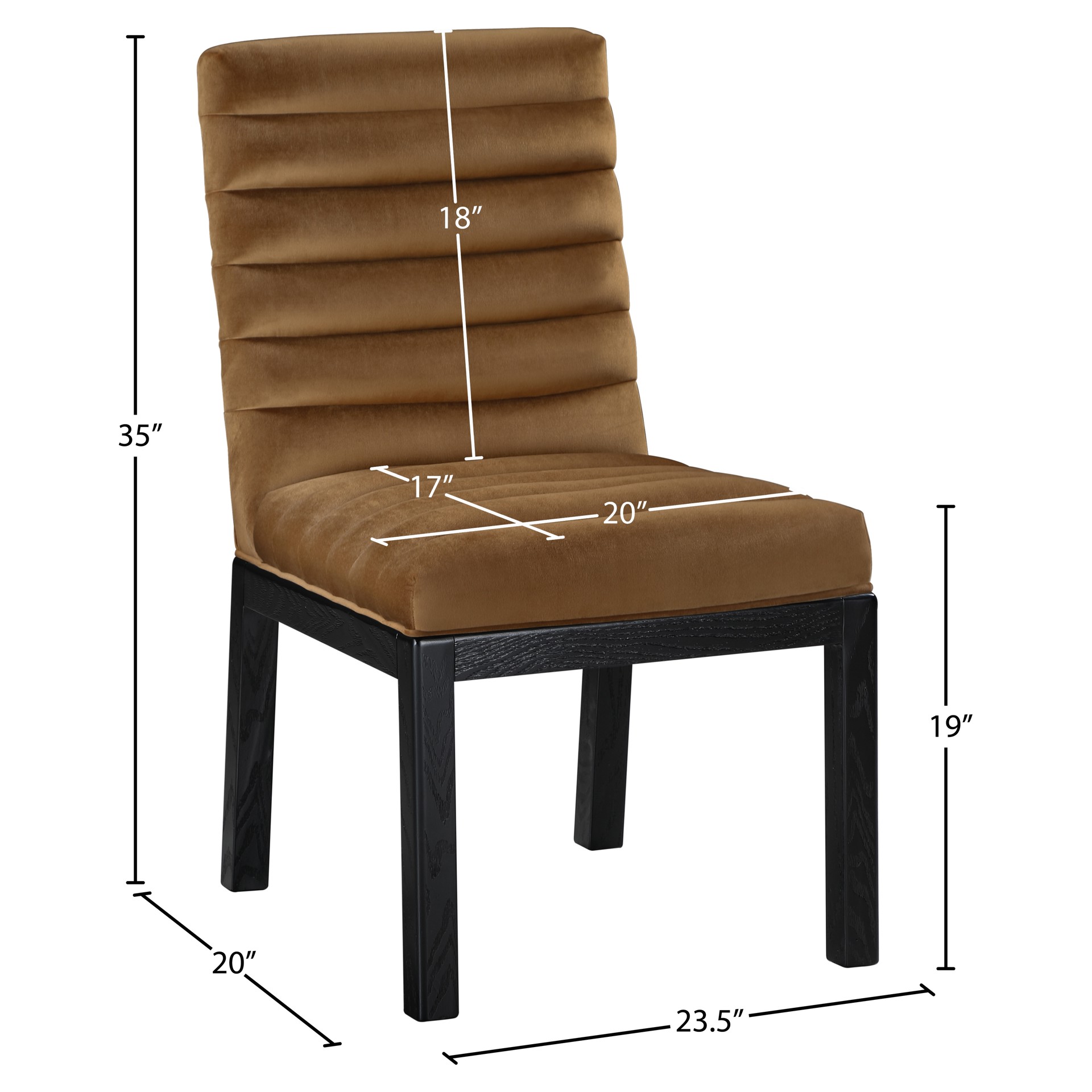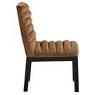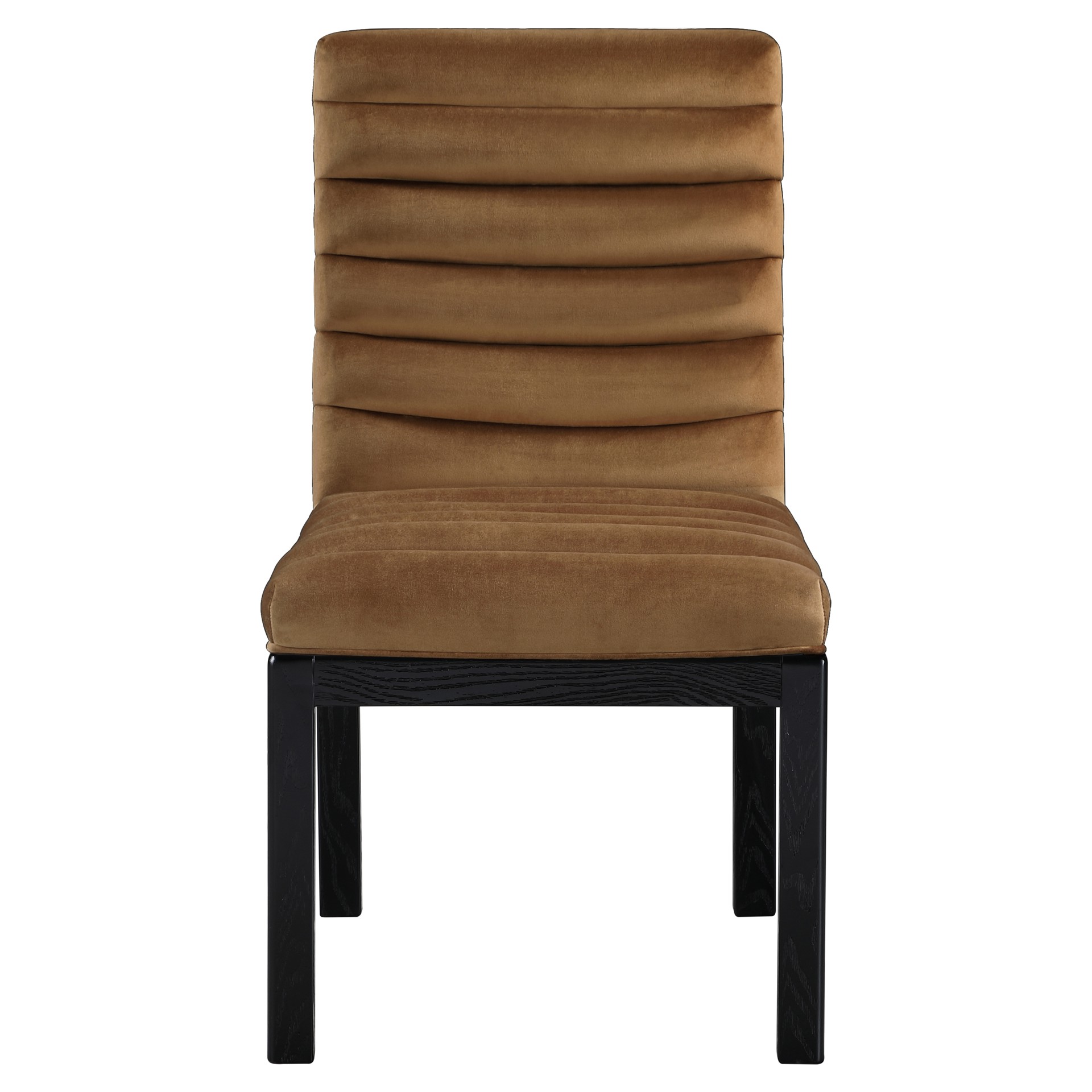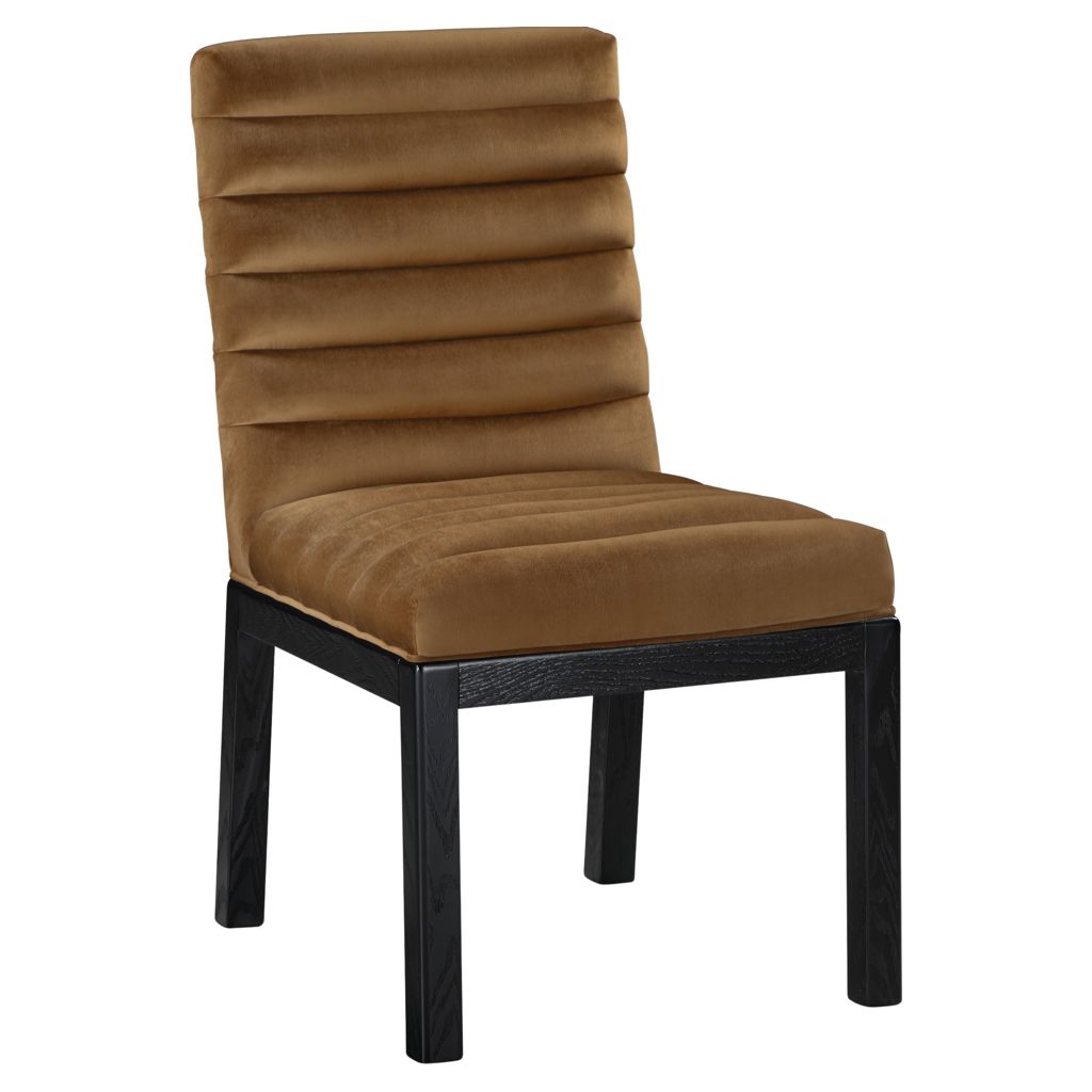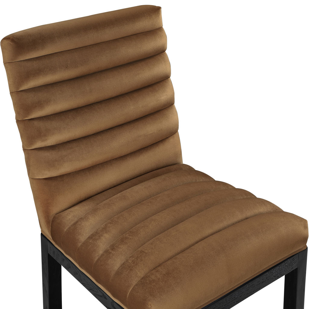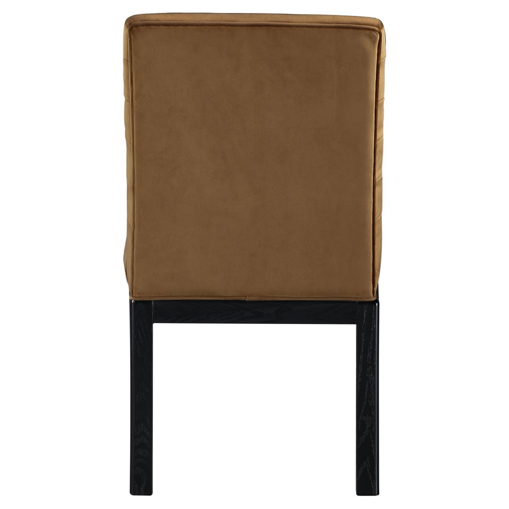 Transform your dining area with the Evelyn dining chair, featuring luxurious velvet upholstery. Supported by rich black solid ash wood legs and detailed with deep channel tufting, this chair exudes both durability and opulence.