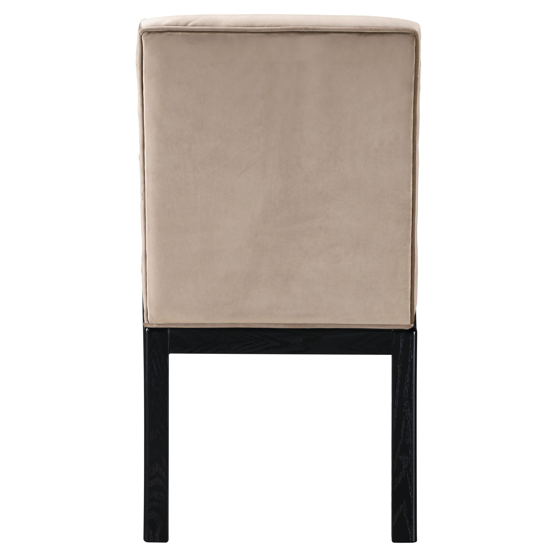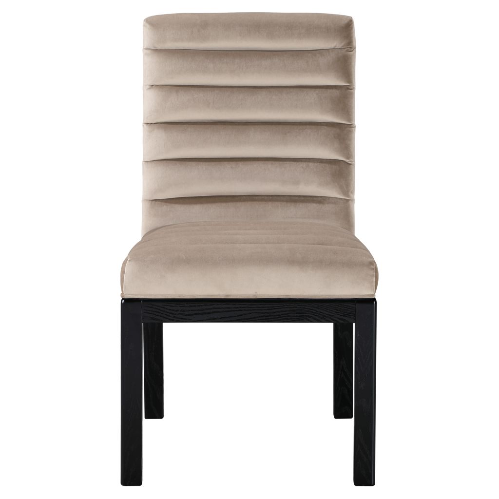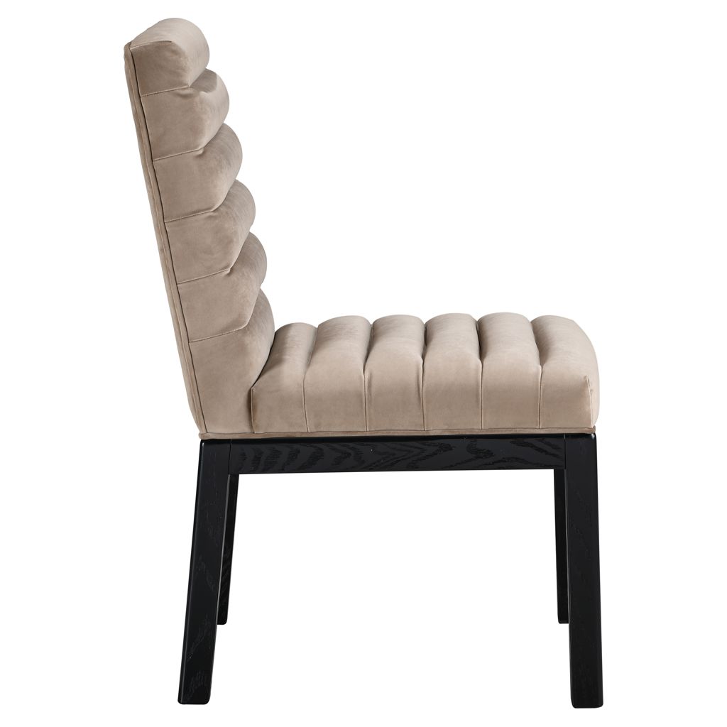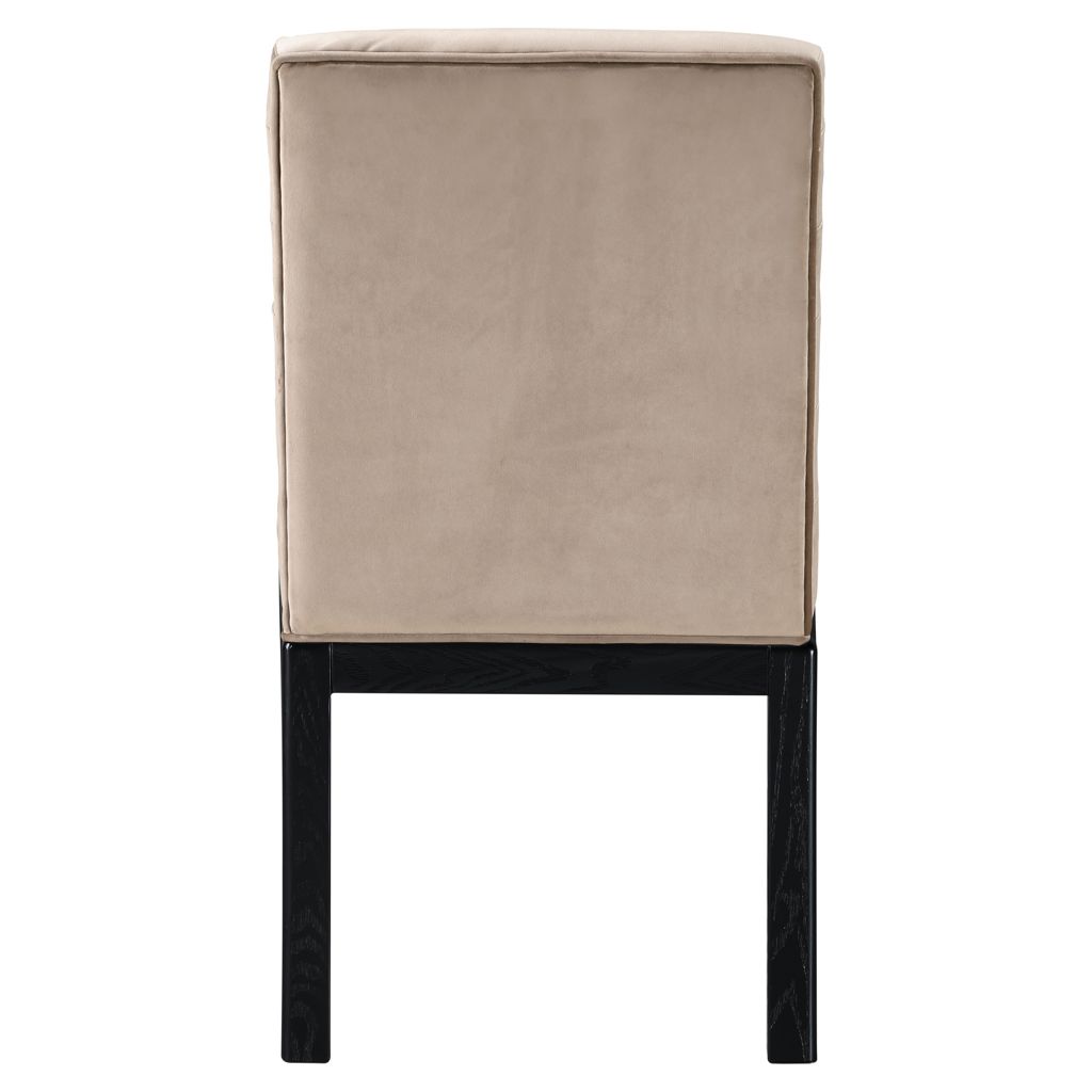 Transform your dining area with the Evelyn dining chair, featuring luxurious velvet upholstery. Supported by rich black solid ash wood legs and detailed with deep channel tufting, this chair exudes both durability and opulence.