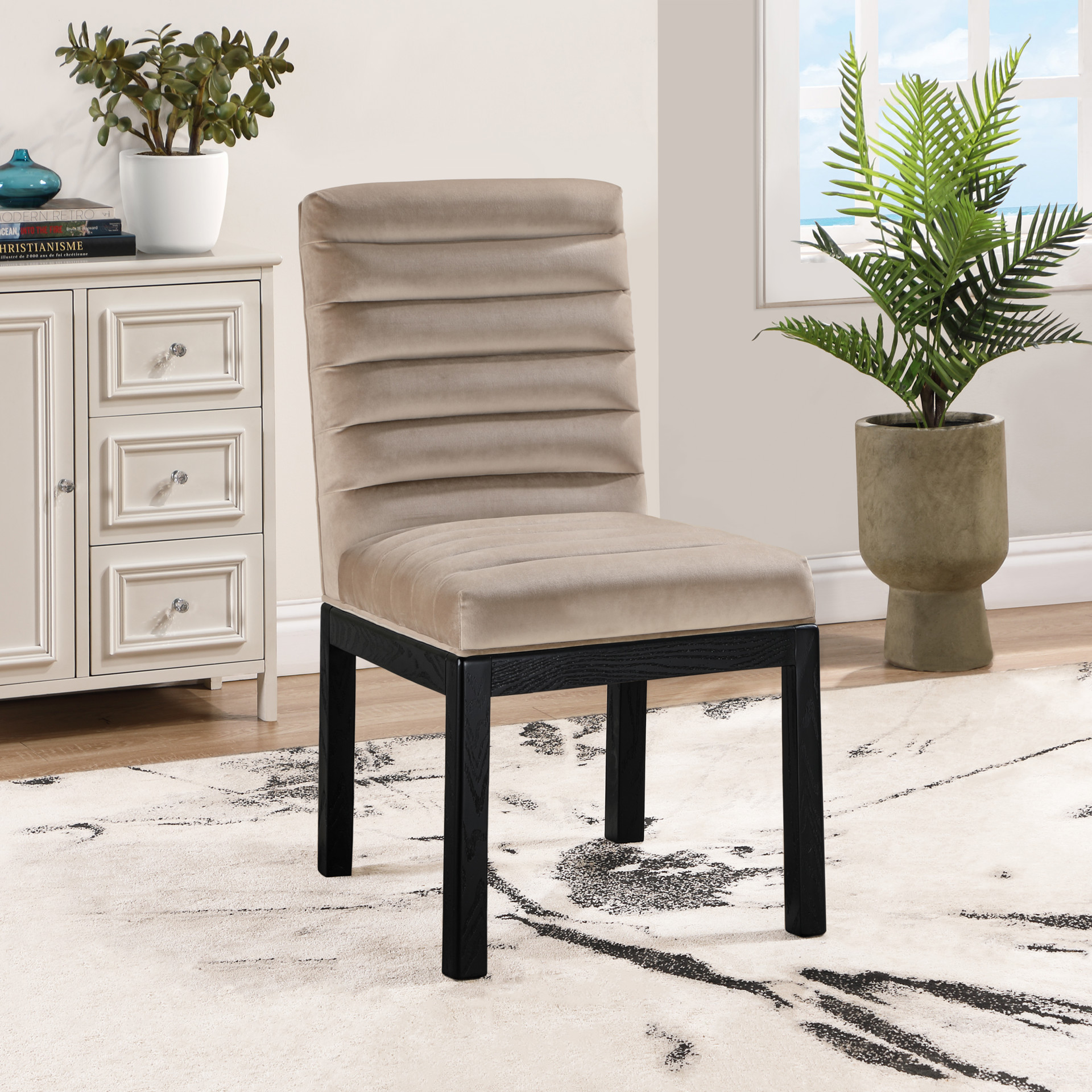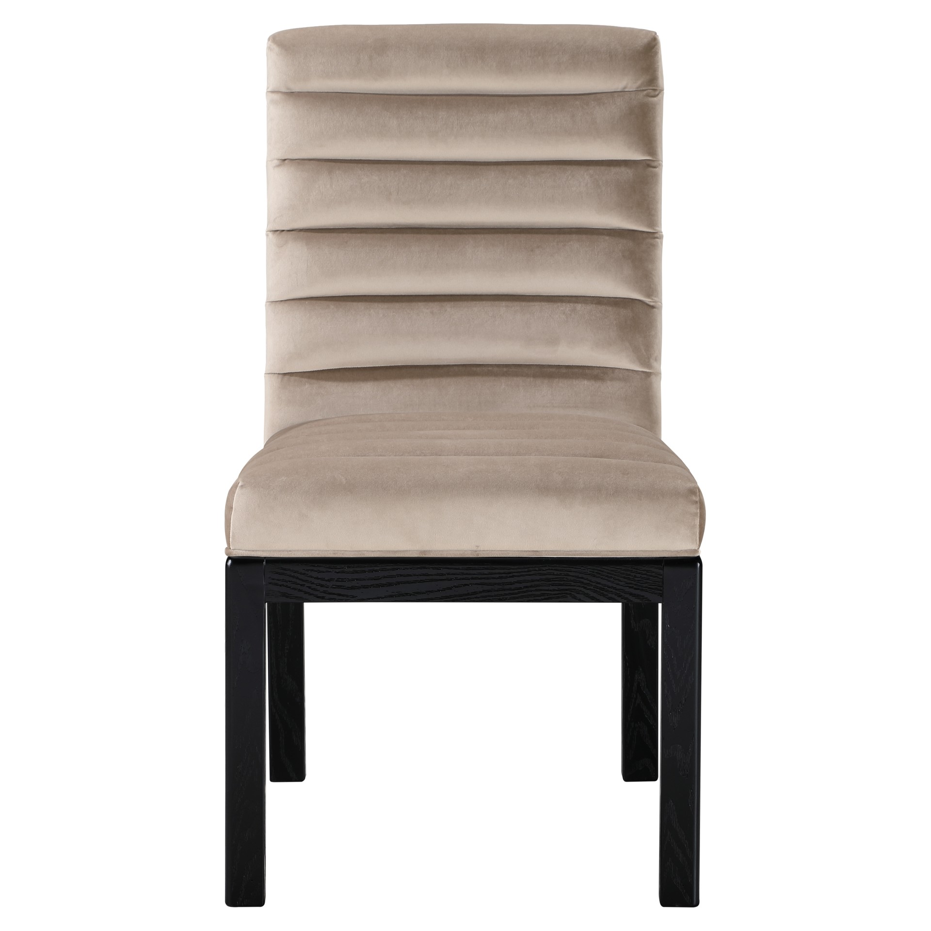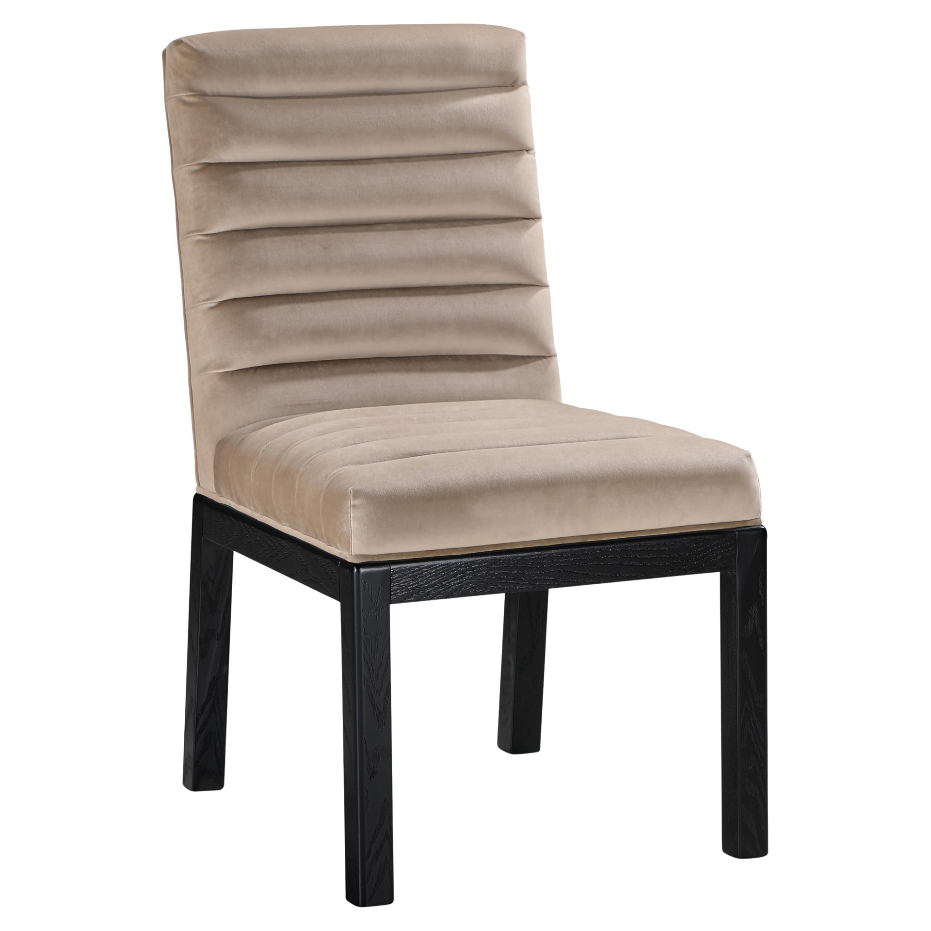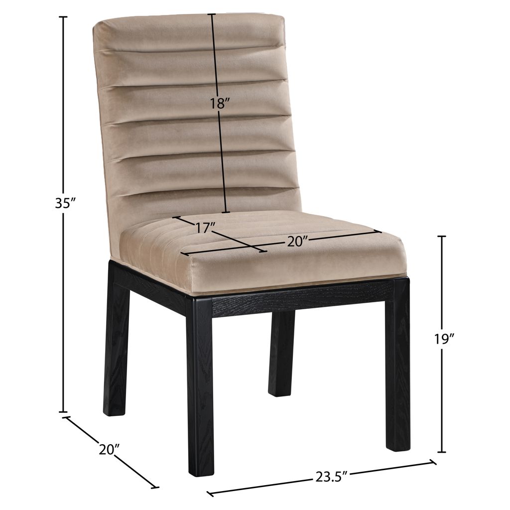 Transform your dining area with the Evelyn dining chair, featuring luxurious velvet upholstery. Supported by rich black solid ash wood legs and detailed with deep channel tufting, this chair exudes both durability and opulence.