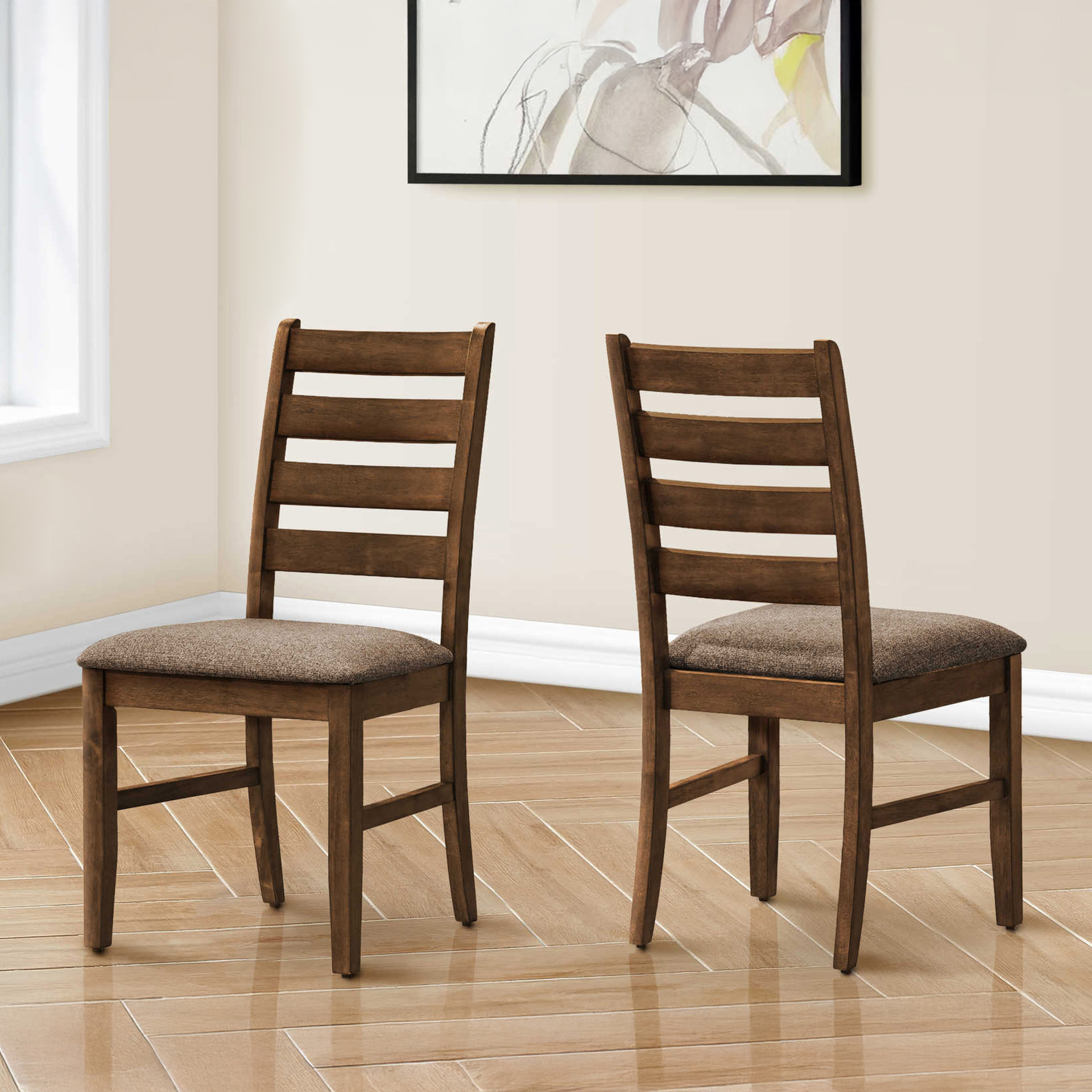The ladder back design brings solid back support while adding a touch of fashionable style to your dining room or kitchen. With a 38" height, these transitional style side chairs are the perfect addition for a chic dining table (sold separately).