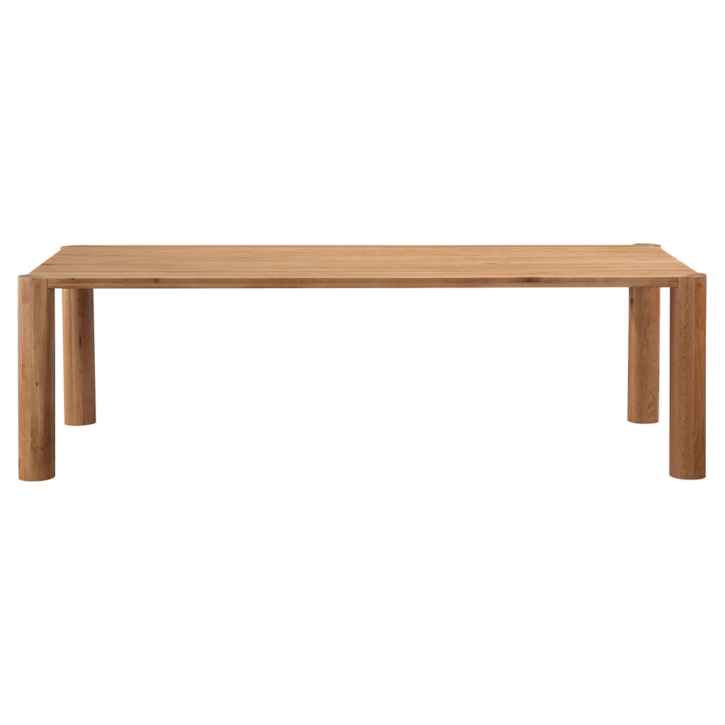 The Post dining table leaves it up to you to arrange its legs as you wish. Available in two sizes, this new table series was designed to allow each leg rod to attach on or off its corners, a 90 degree rotation, for a distinguished and majestic look. A natural beauty in solid natural oak with a semi-gloss finish, this dining table showcases the beautiful grain patterns and shades of oak.