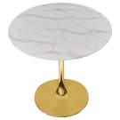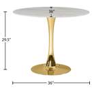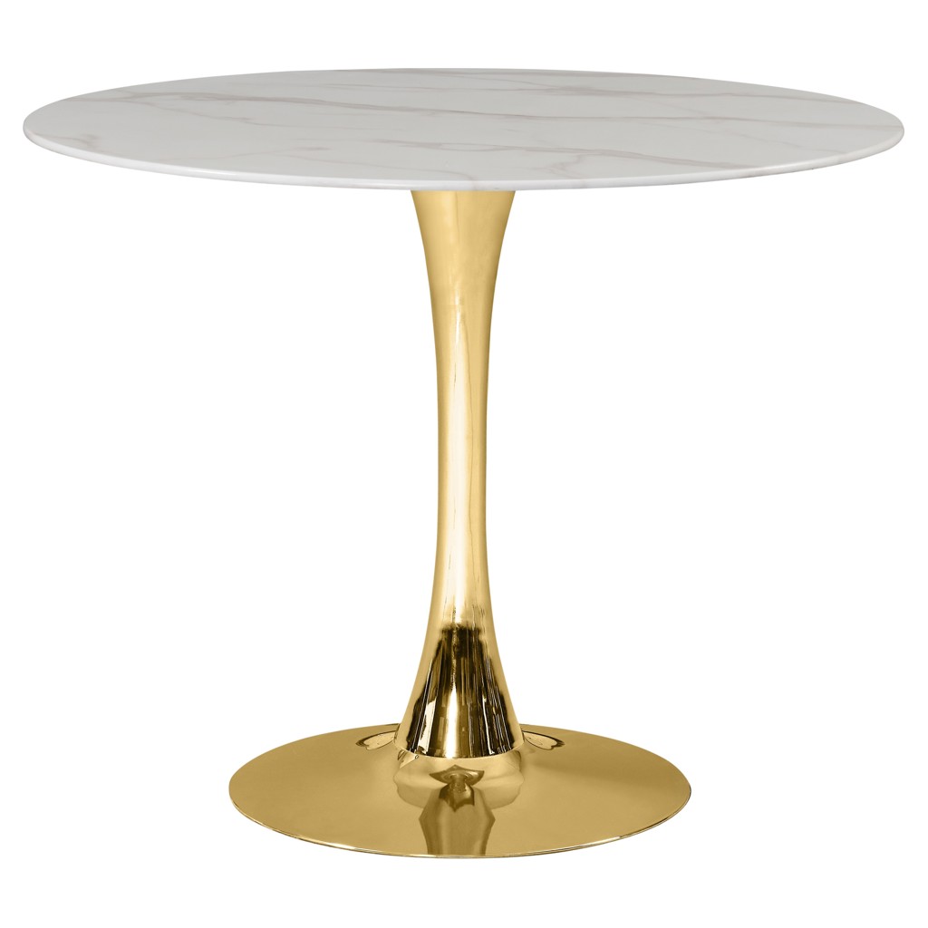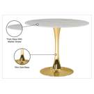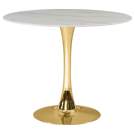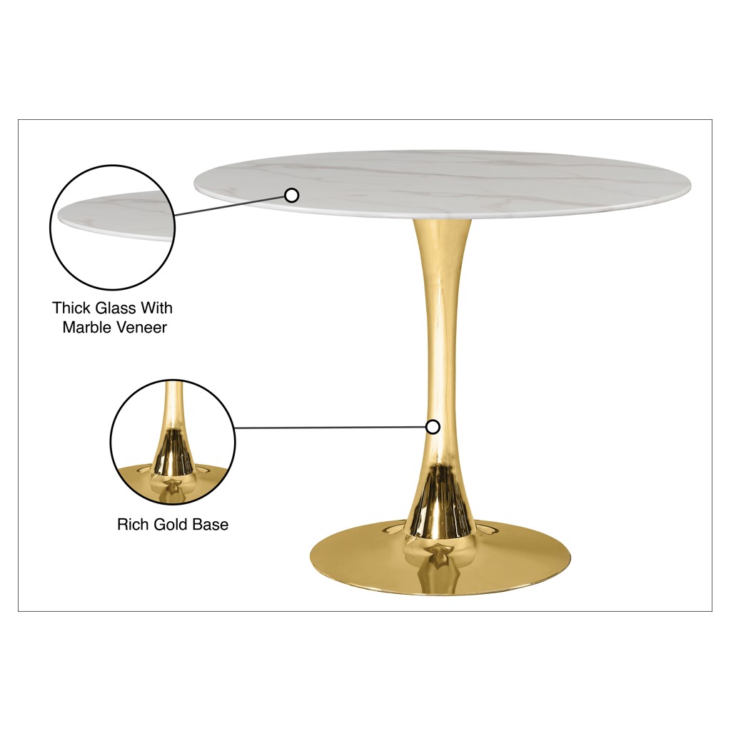 The tabletop is made of 10MM thick glass with a glamorous marble veneer. A shiny gold pedestal base adds to the appeal of this gorgeous piece, and lets it fit into smaller spaces comfortably.