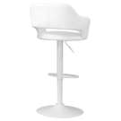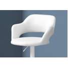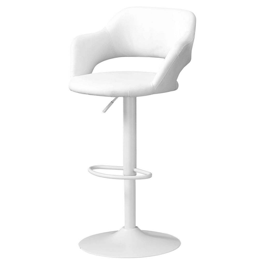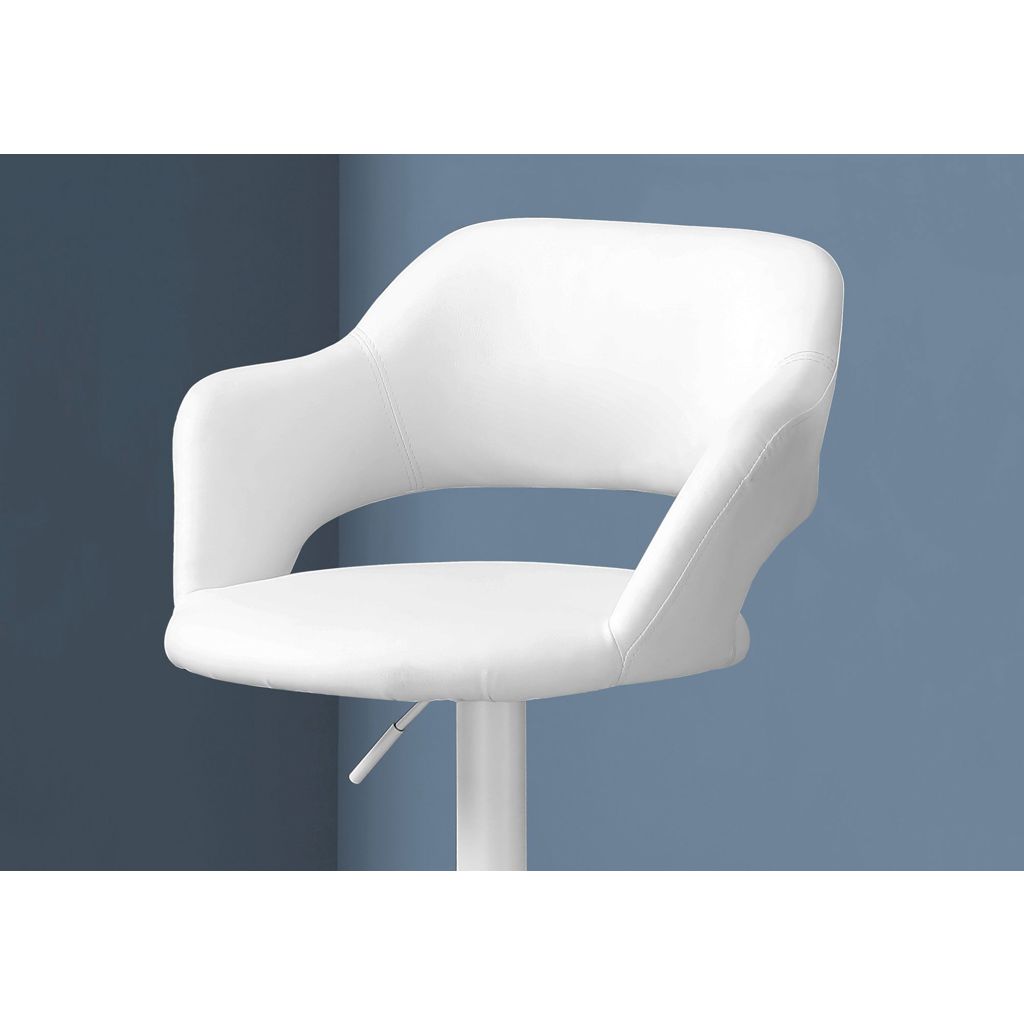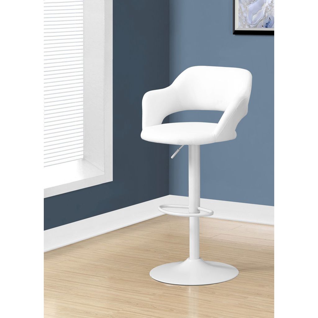 Enhanced by an ergonomically curved backrest design, the white faux leather seat is generously padded and also features a footrest on the matching white metal base for added comfort.