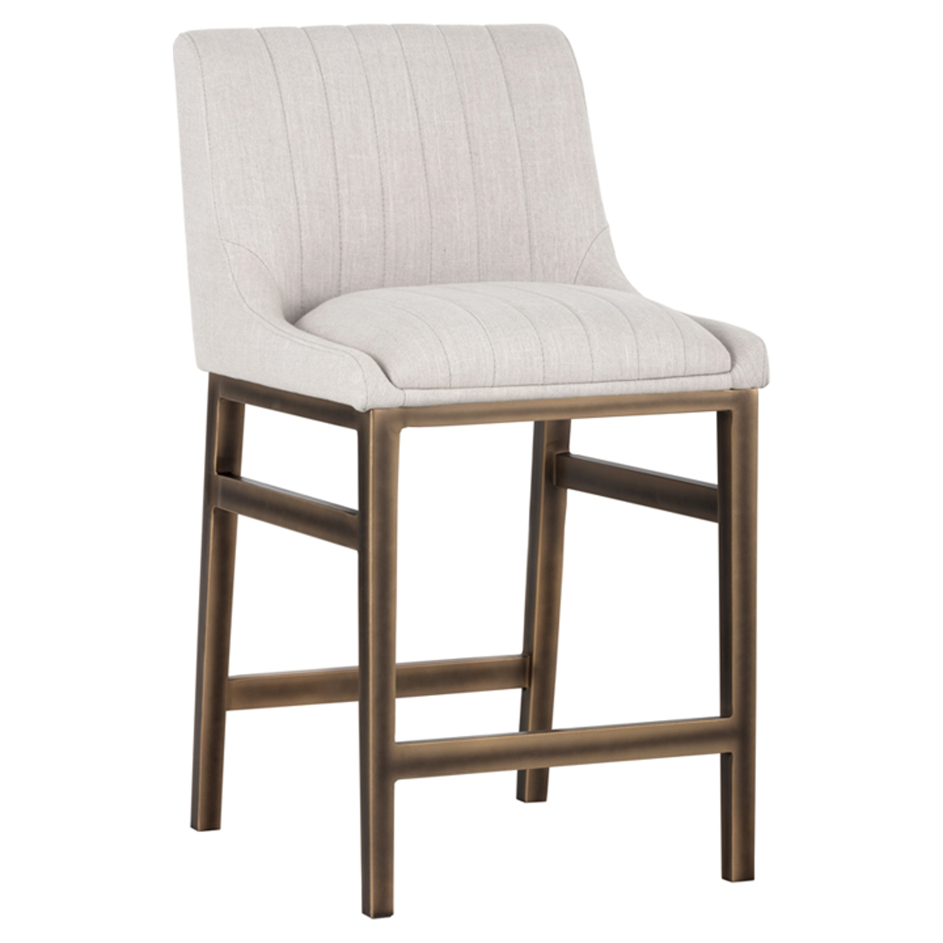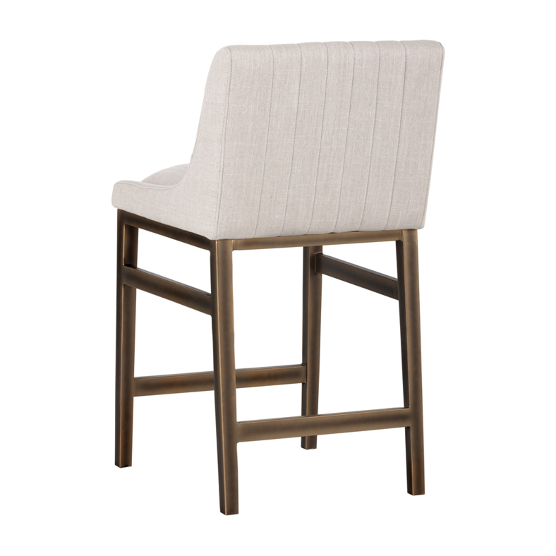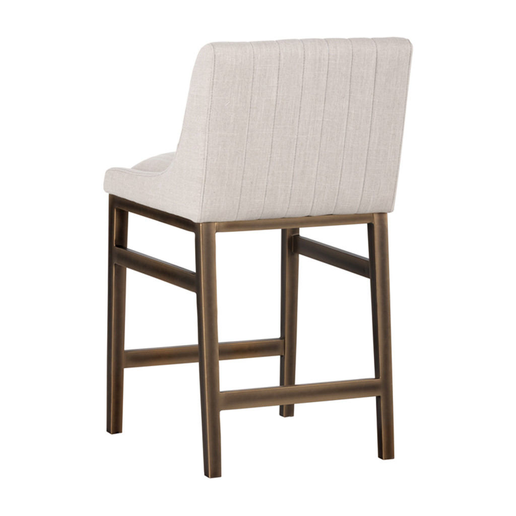 An urban designed stool featuring bold vertical channel tufting on the seat and back in beige-linen fabric or our masculine vintage black, cognac and blue faux leather. Finished with a rustic bronze steel frame and stretchers. Great for residential and commercial placements.