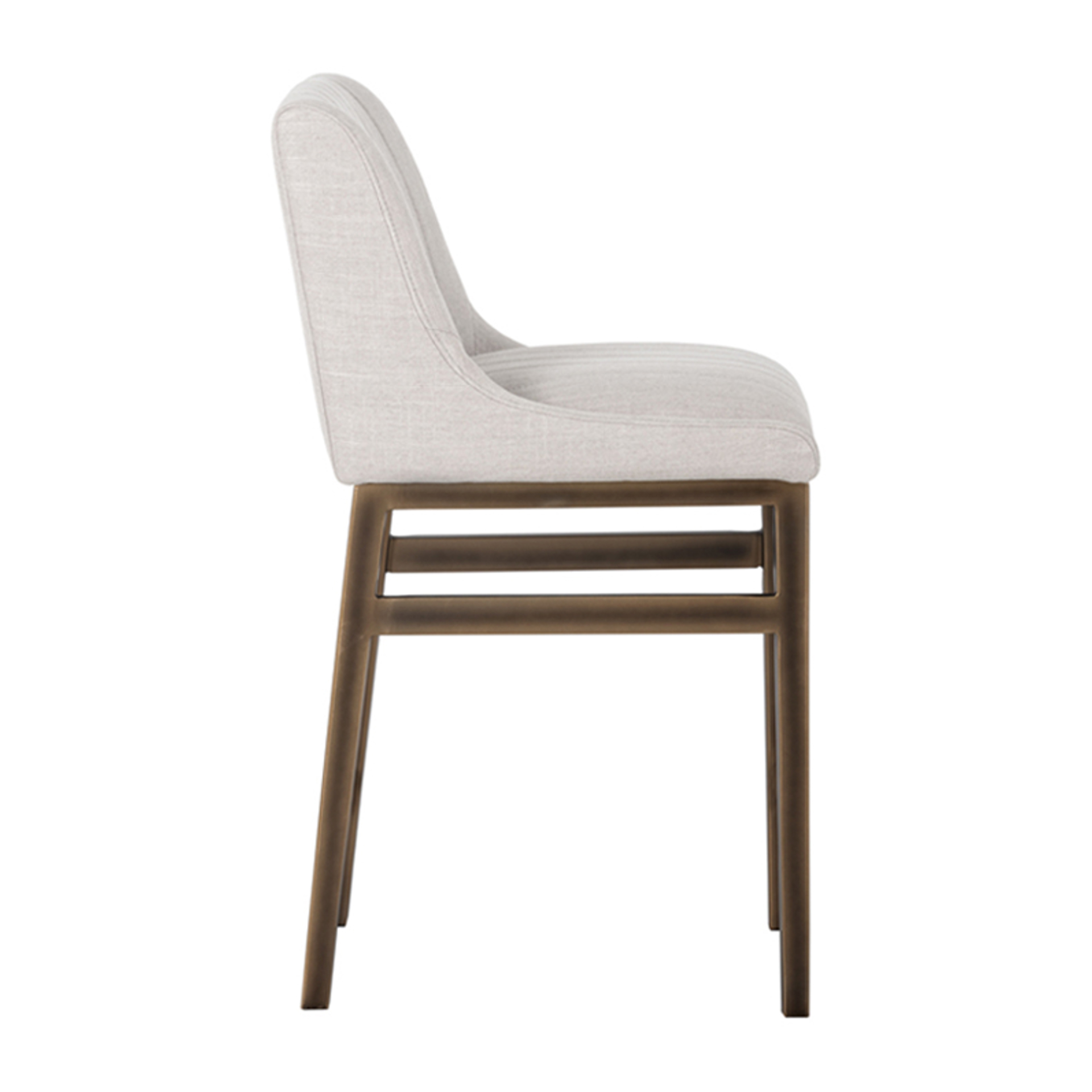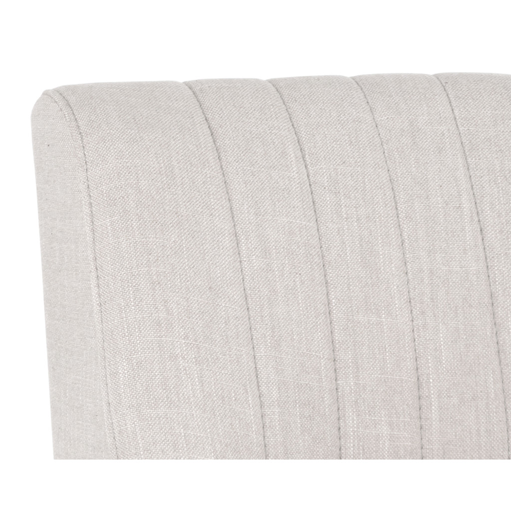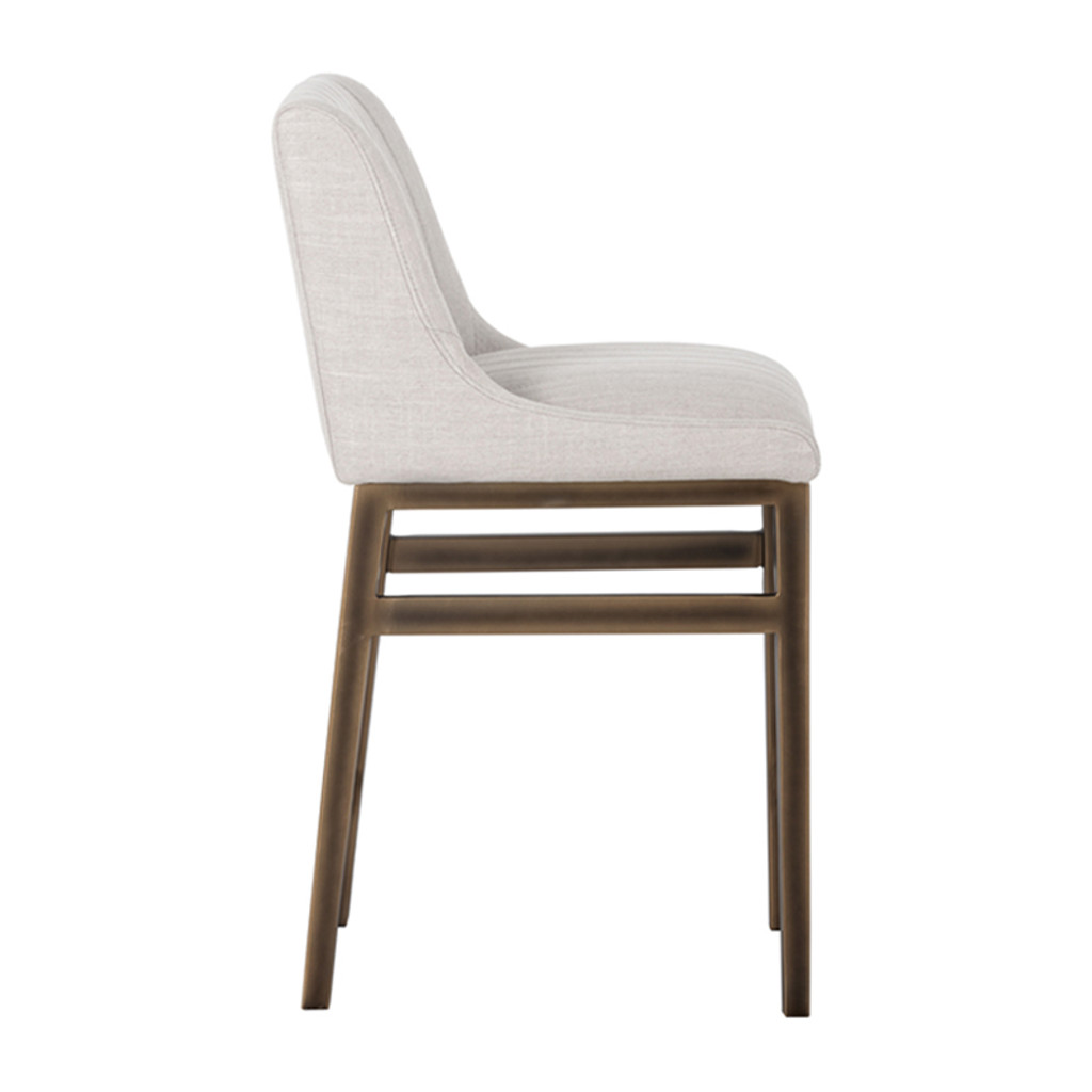 An urban designed stool featuring bold vertical channel tufting on the seat and back in beige-linen fabric or our masculine vintage black, cognac and blue faux leather. Finished with a rustic bronze steel frame and stretchers. Great for residential and commercial placements.