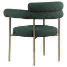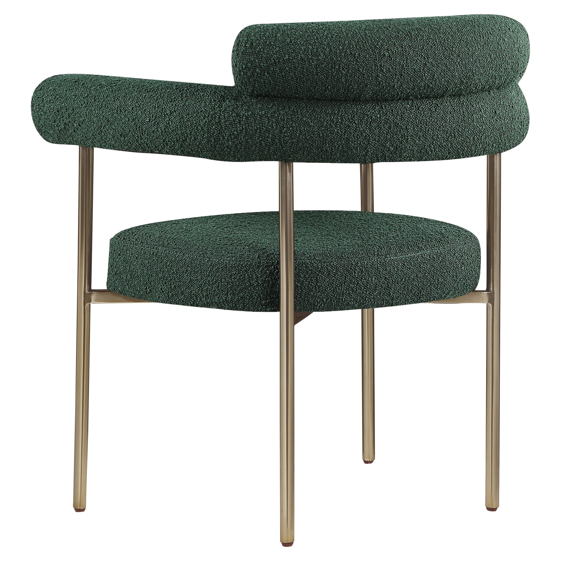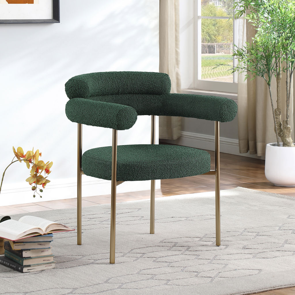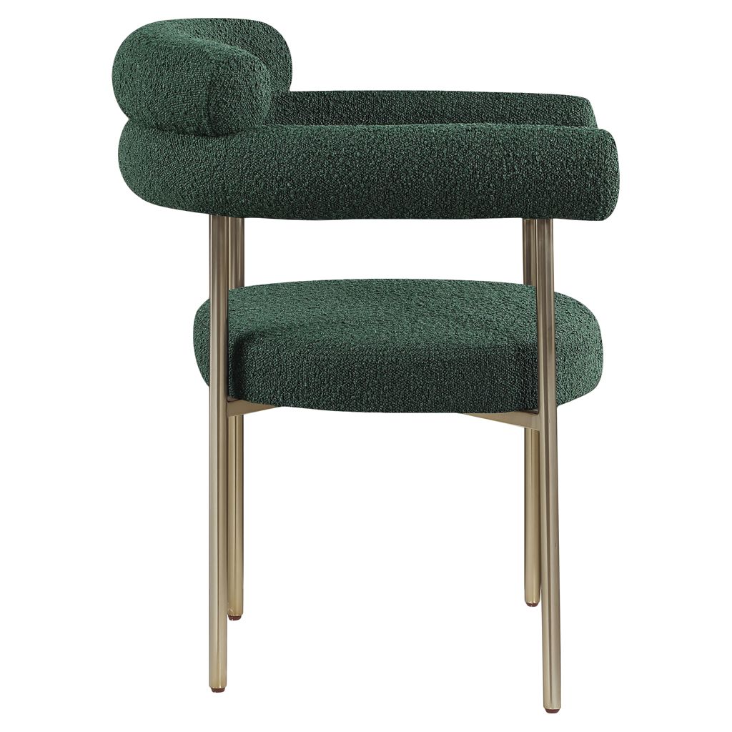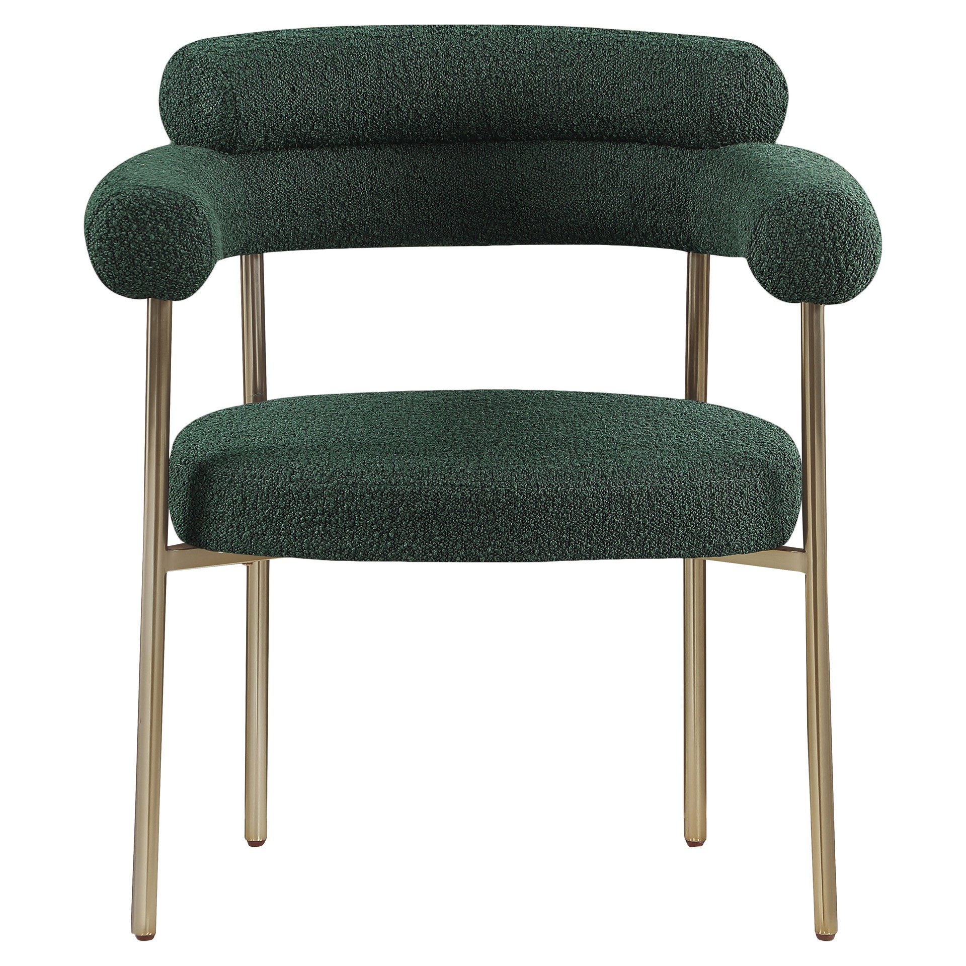 A thickly padded soft green boucle fabric seat lends this chair a sleek, upscale look while ensuring its ongoing performance and beauty.