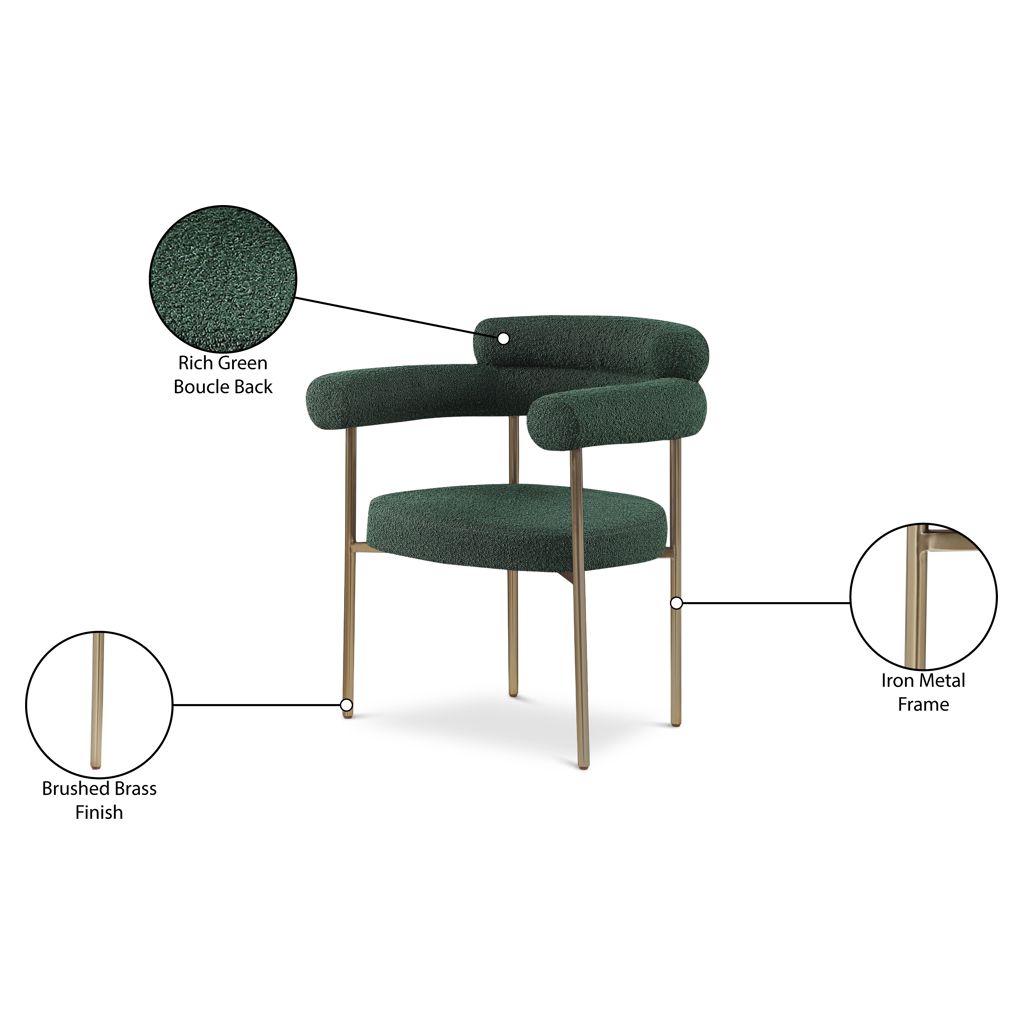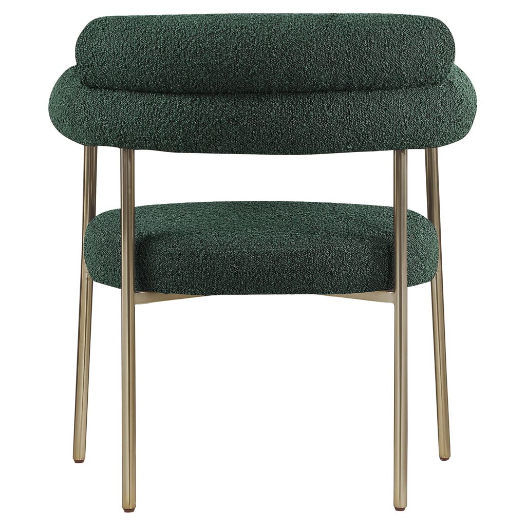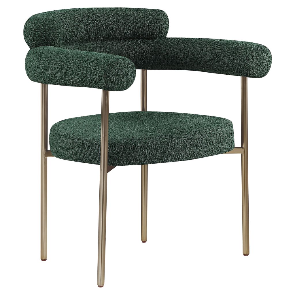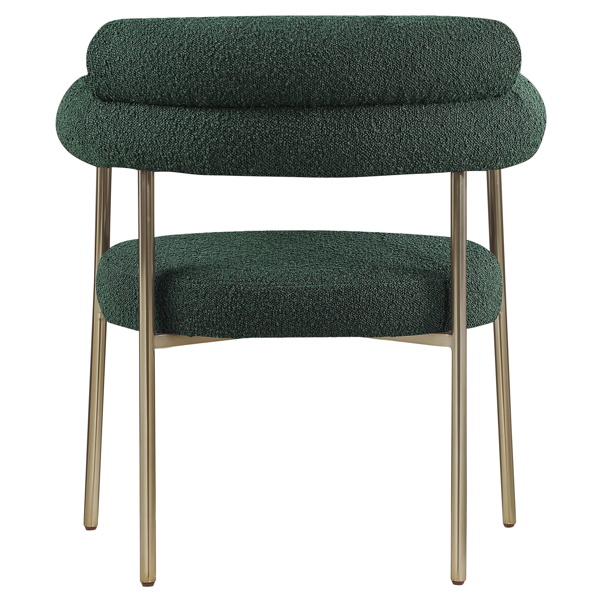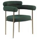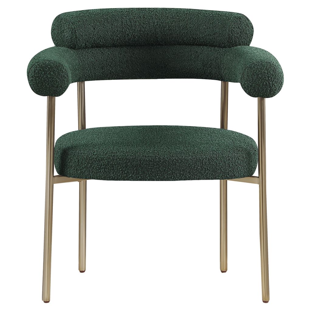 A thickly padded soft green boucle fabric seat lends this chair a sleek, upscale look while ensuring its ongoing performance and beauty.