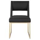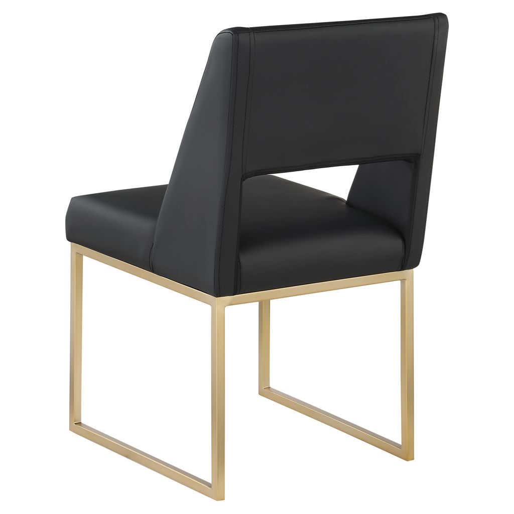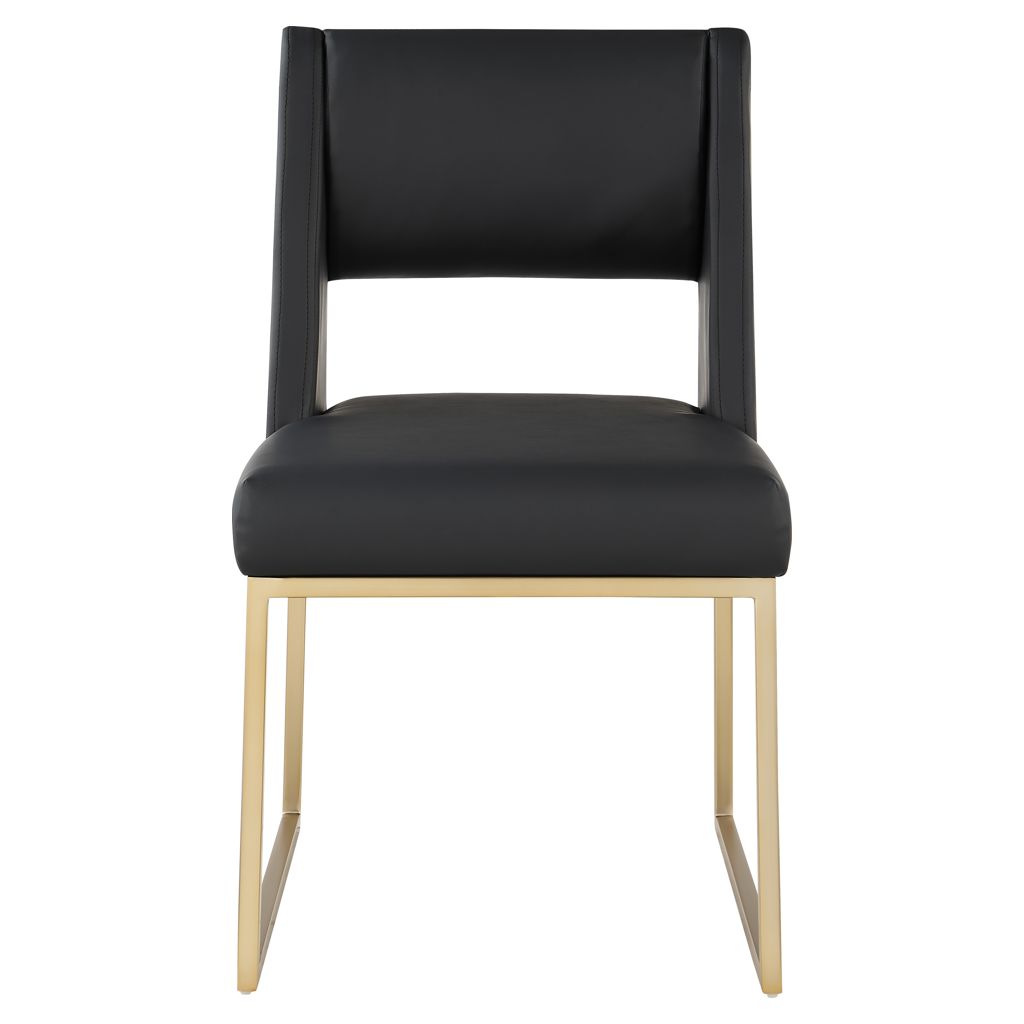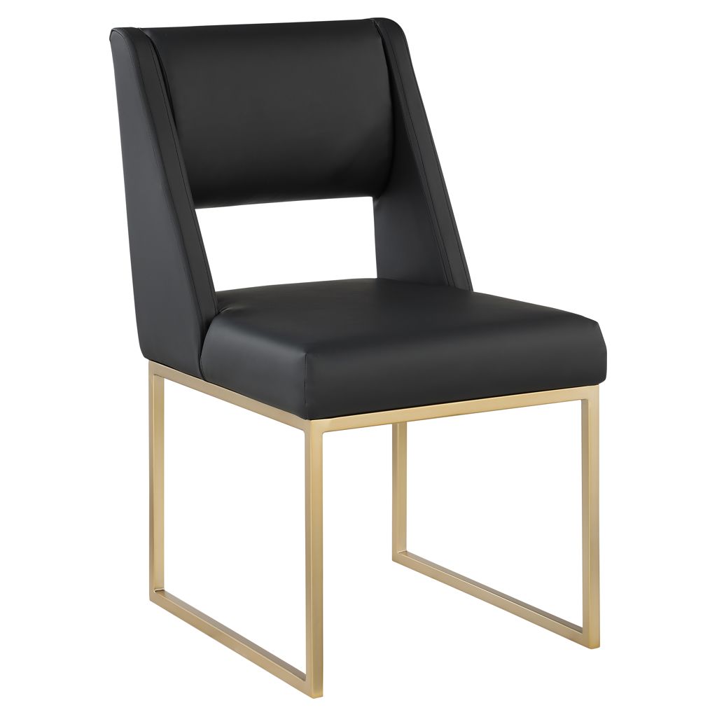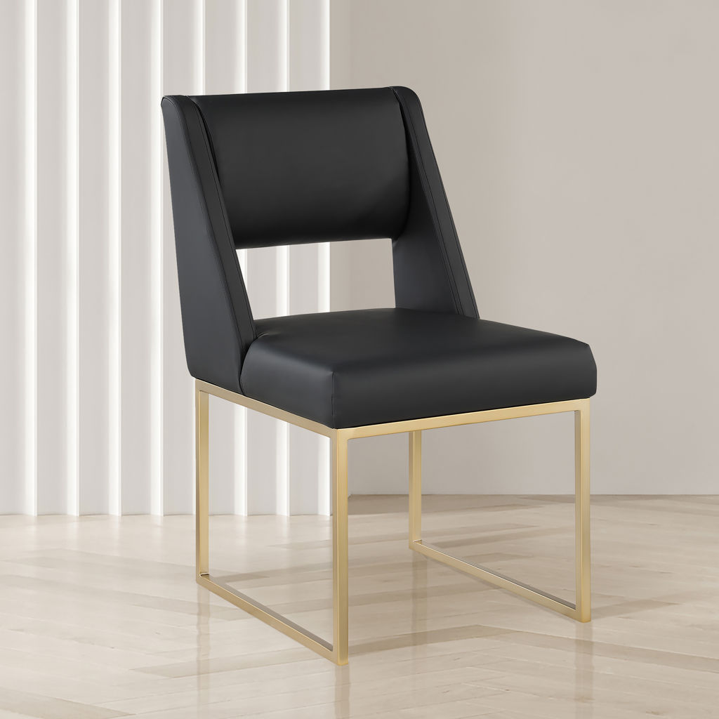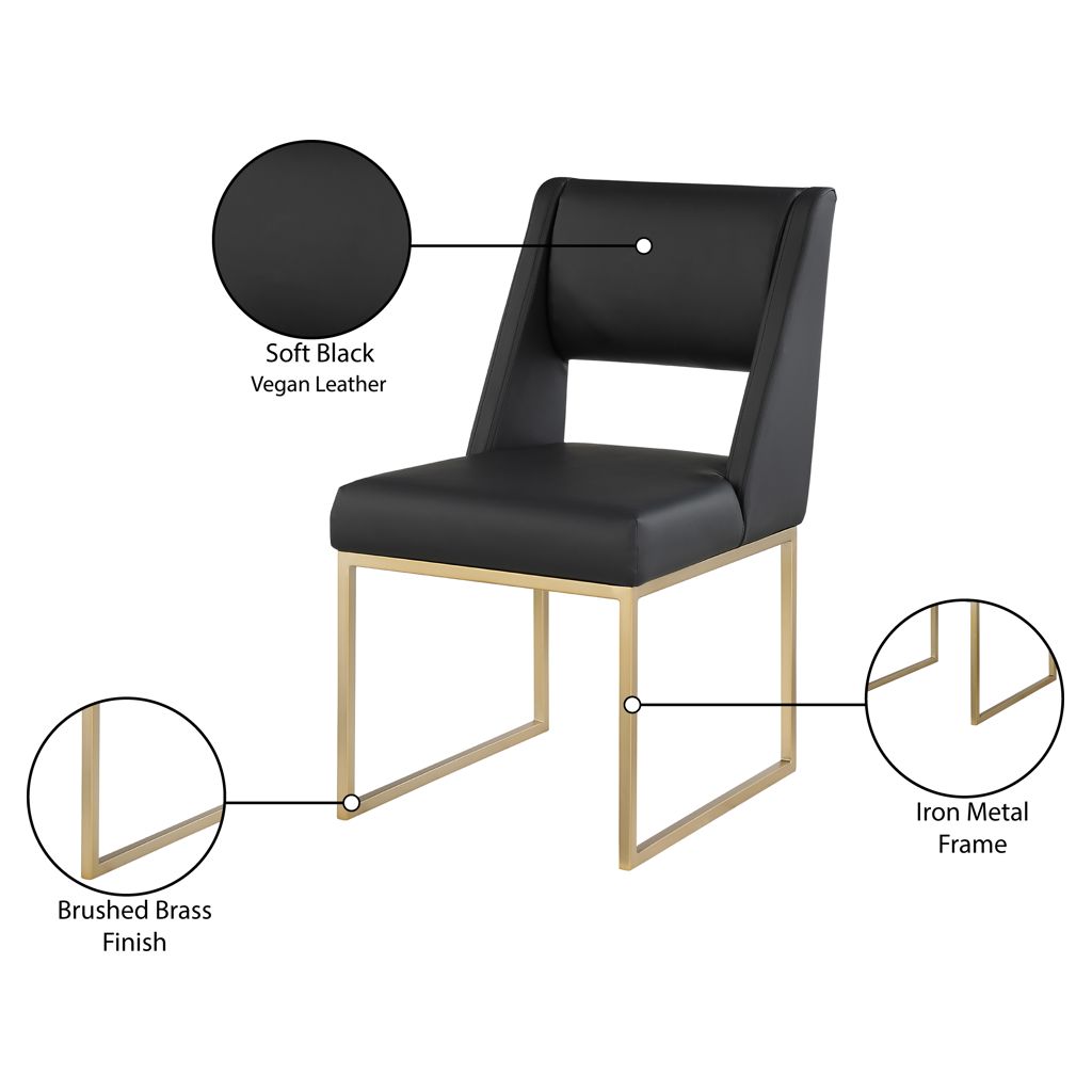 Get comfy at your dinner table with this Jayce black faux leather dining chair. Its soft black faux leather upholstery offers a comfortable place to sit, while its brushed brass iron base provides stability and durability.