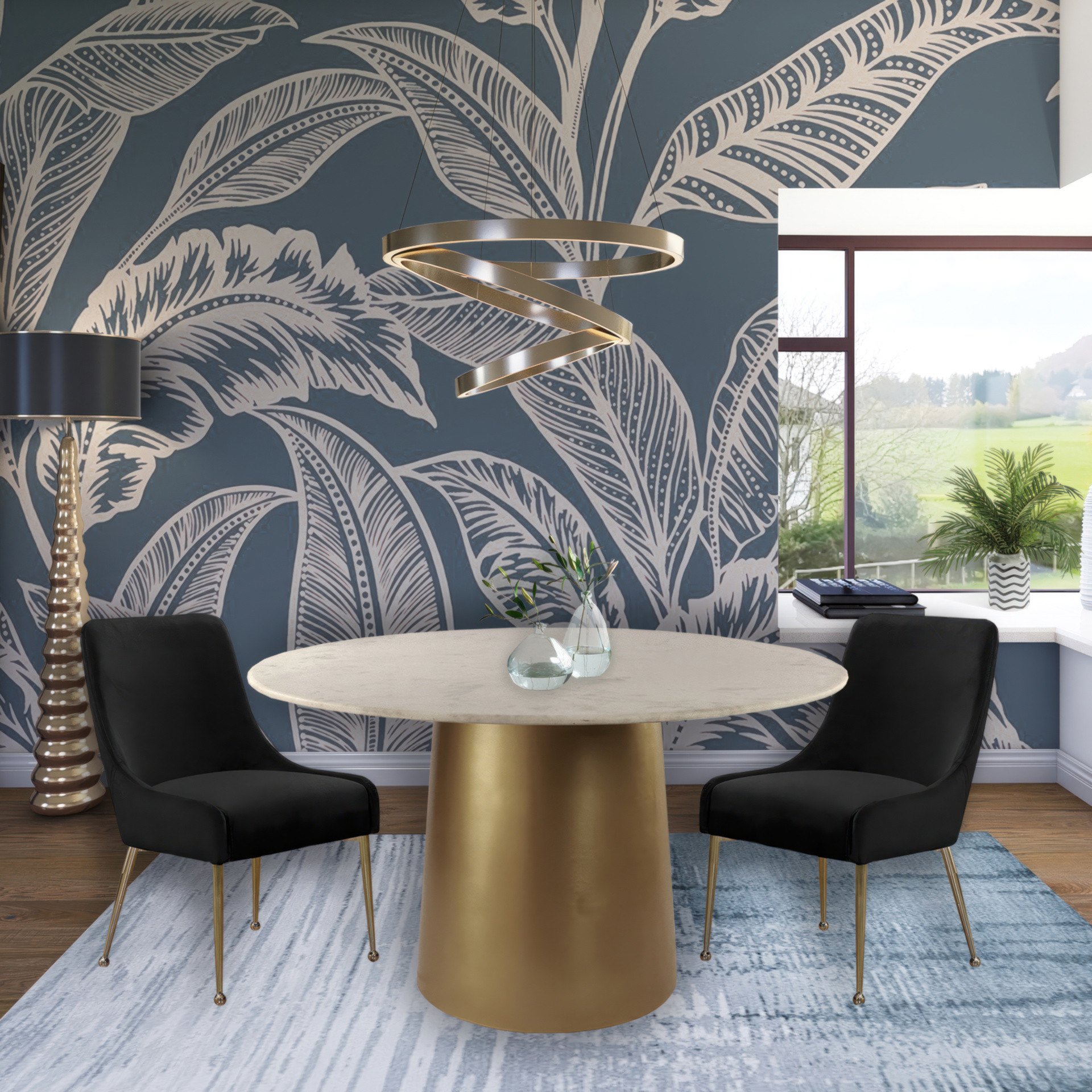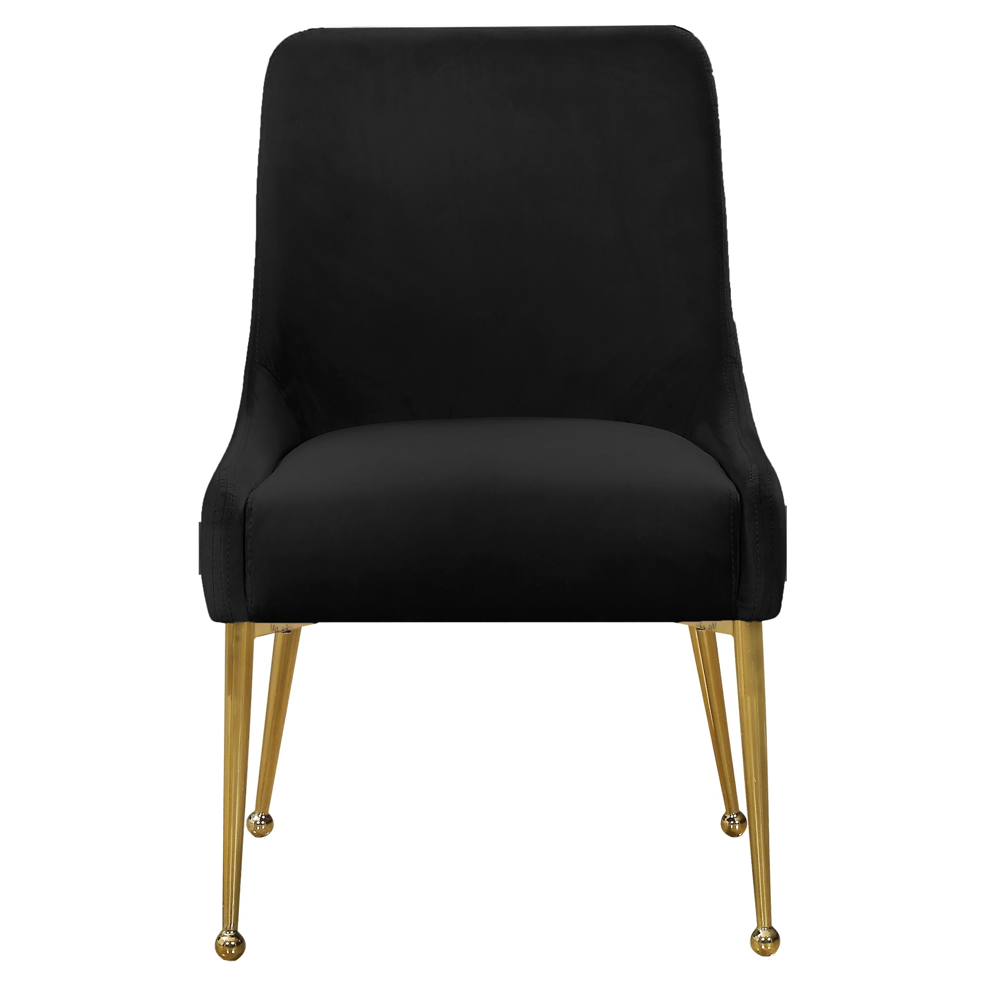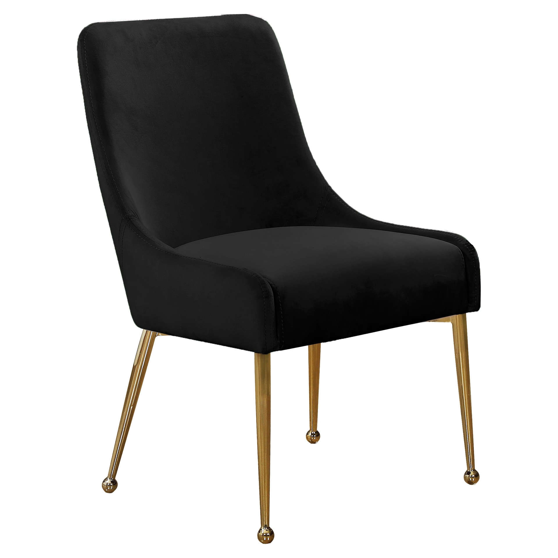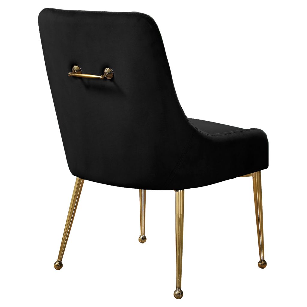 The polished gold legs have a ball design for added visual oomph, and a matching handle on the back adds an elegant detail while also providing an easy way to slide the chairs in and out from your choice of table.