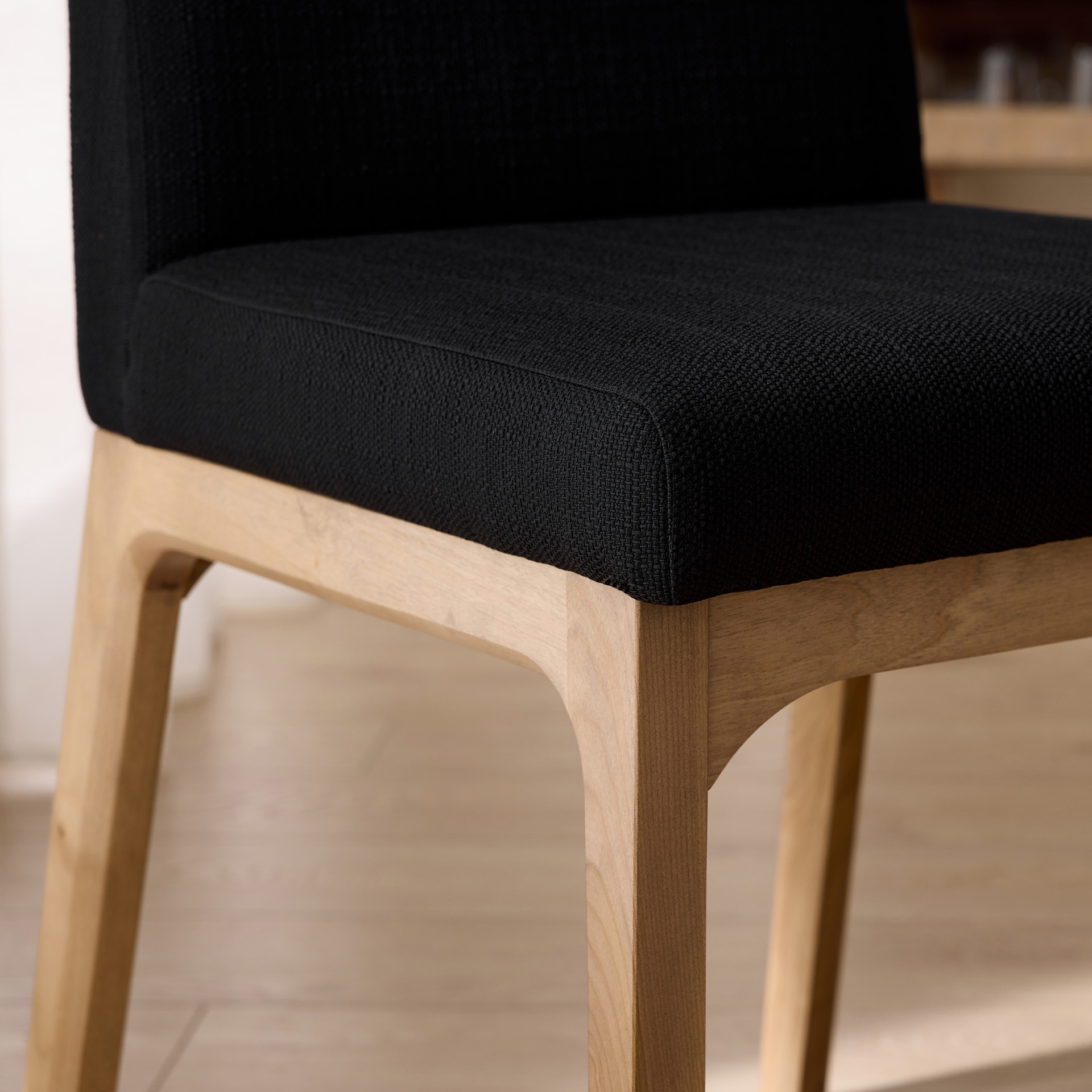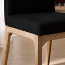 Designed to stand the test of time, this chair blends sturdiness with aesthetic appeal. Its clean lines and refined finish fit seamlessly into any décor, from classic to contemporary. The harmonious contrast between the dark fabric and light wood creates a striking visual effect that is sure to impress your guests.