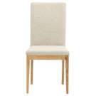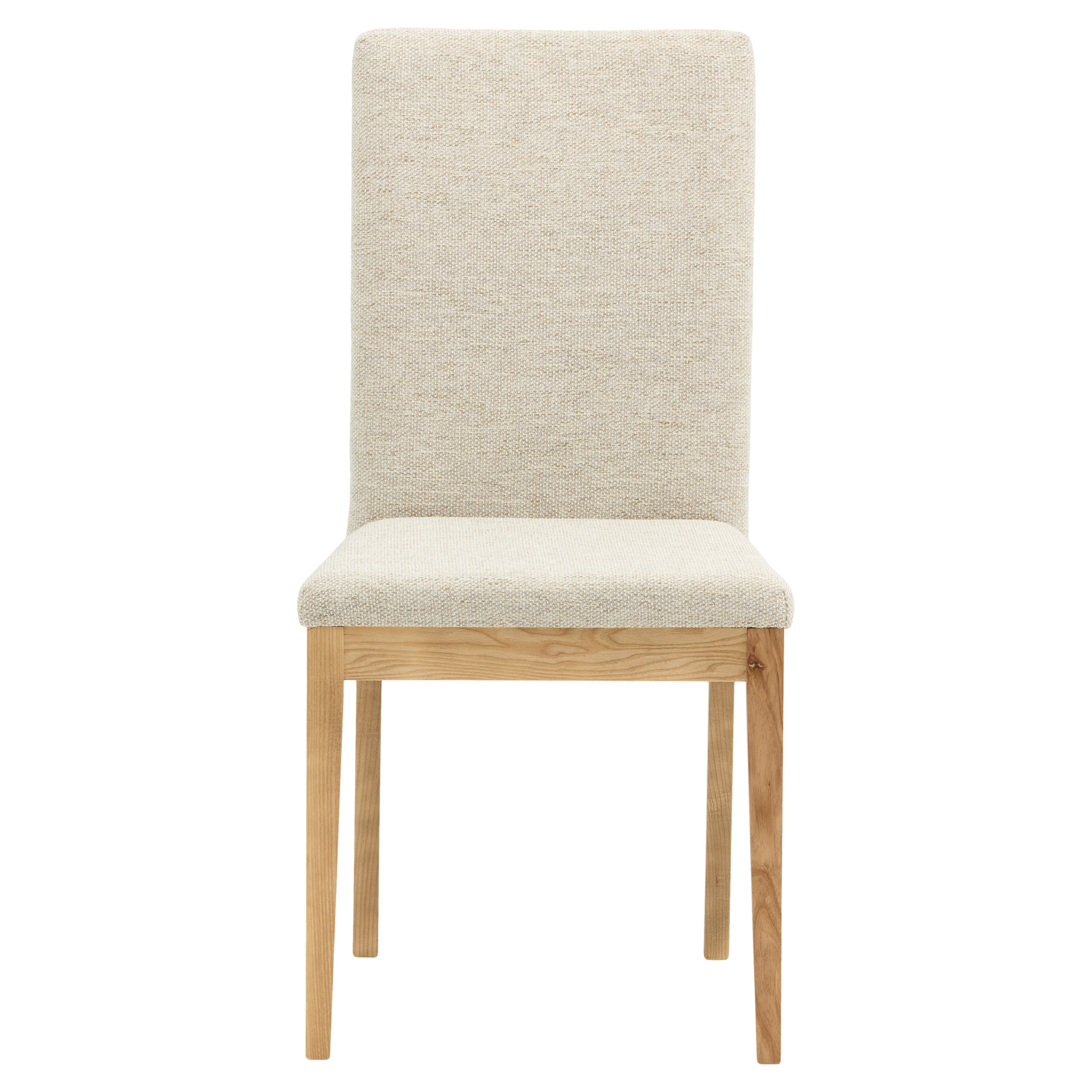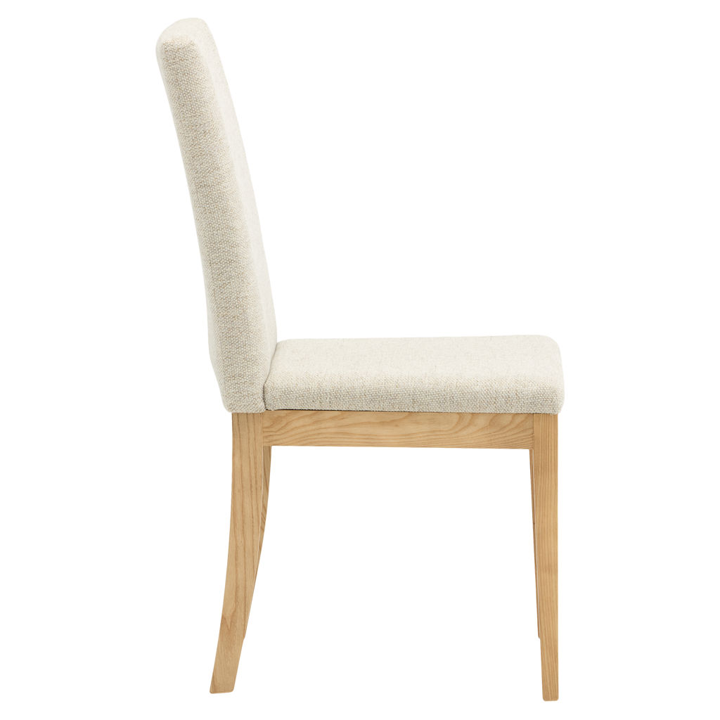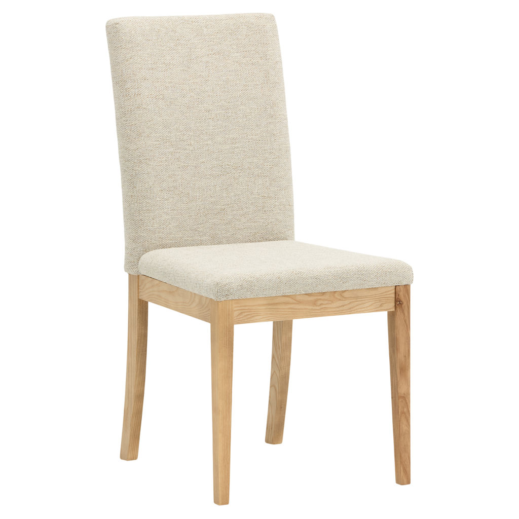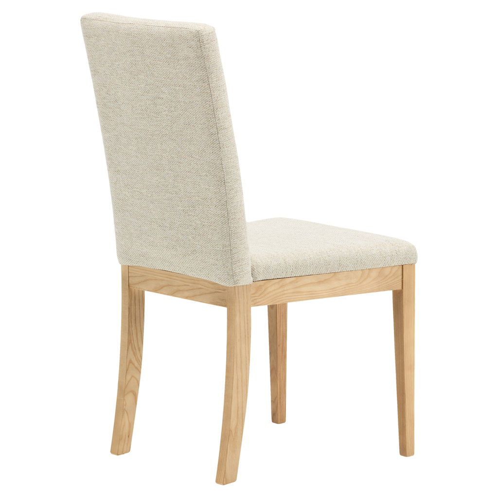 The upholstered seat and backrest, dressed in soft, elegant greige fabric, offer superior comfort for your meals or moments of relaxation.