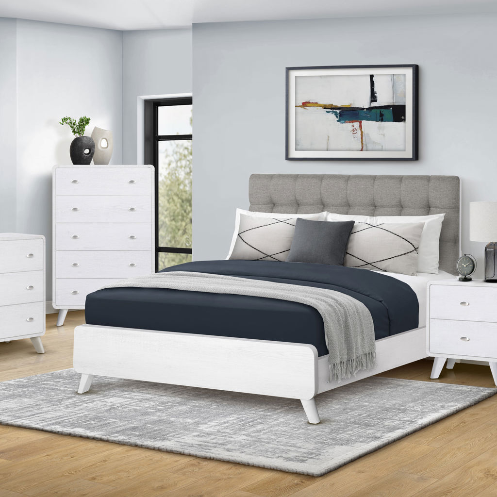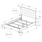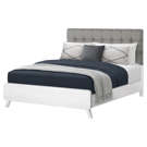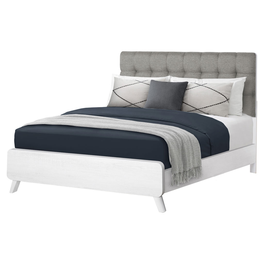 The engineered wood frame in a chic white oak finish creates a sophisticated contrast with the luxurious tufted grey fabric upholstered headboard, making it a striking focal point in any bedroom.