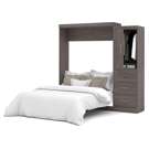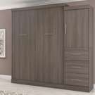 The Murphy bed is designed to accommodate most standard queen-size mattresses (8 to 12 inches or 20.3 to 30.5 cm thick; 45 to 90 lbs or 20.4 to 40.8 kg; 60 x 80 inches or 152.4 x 203.2 cm) and can support up to 1000 lbs (453.6 kg) (including mattress weight). When opened, the bed requires 92.1" (233.9 cm) of clearance from the wall. Allow 30" (76.2 cm) to 36" (91.44 cm) of clearance around the open bed. The bed box must be anchored to a wall at least 91.1" (231.4 cm) high.