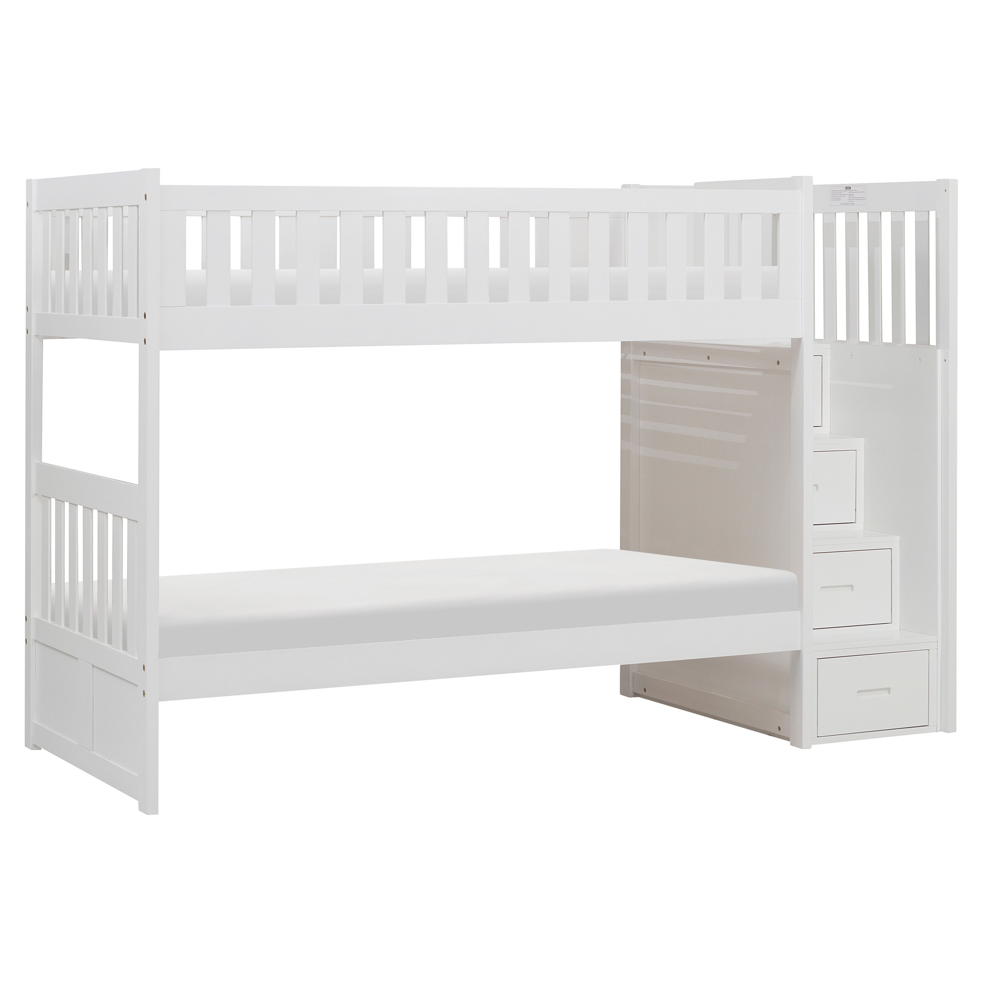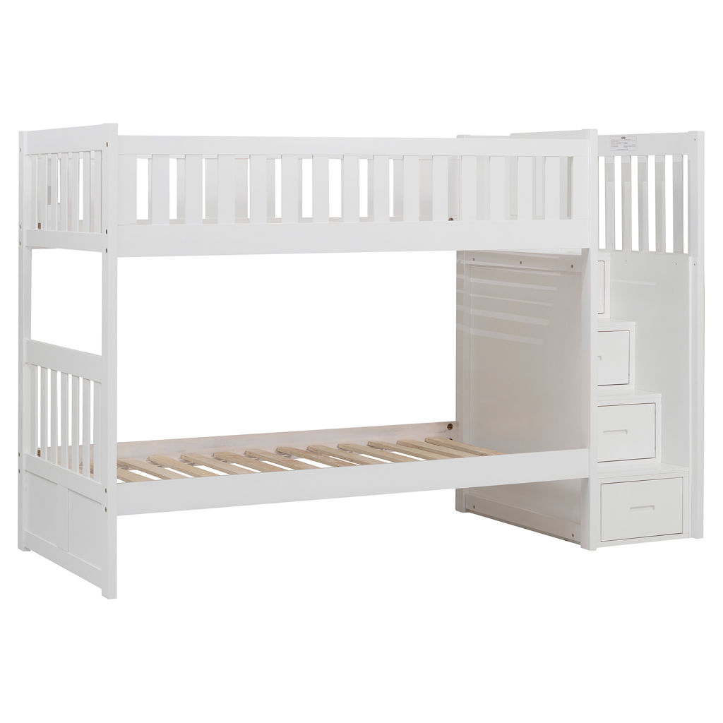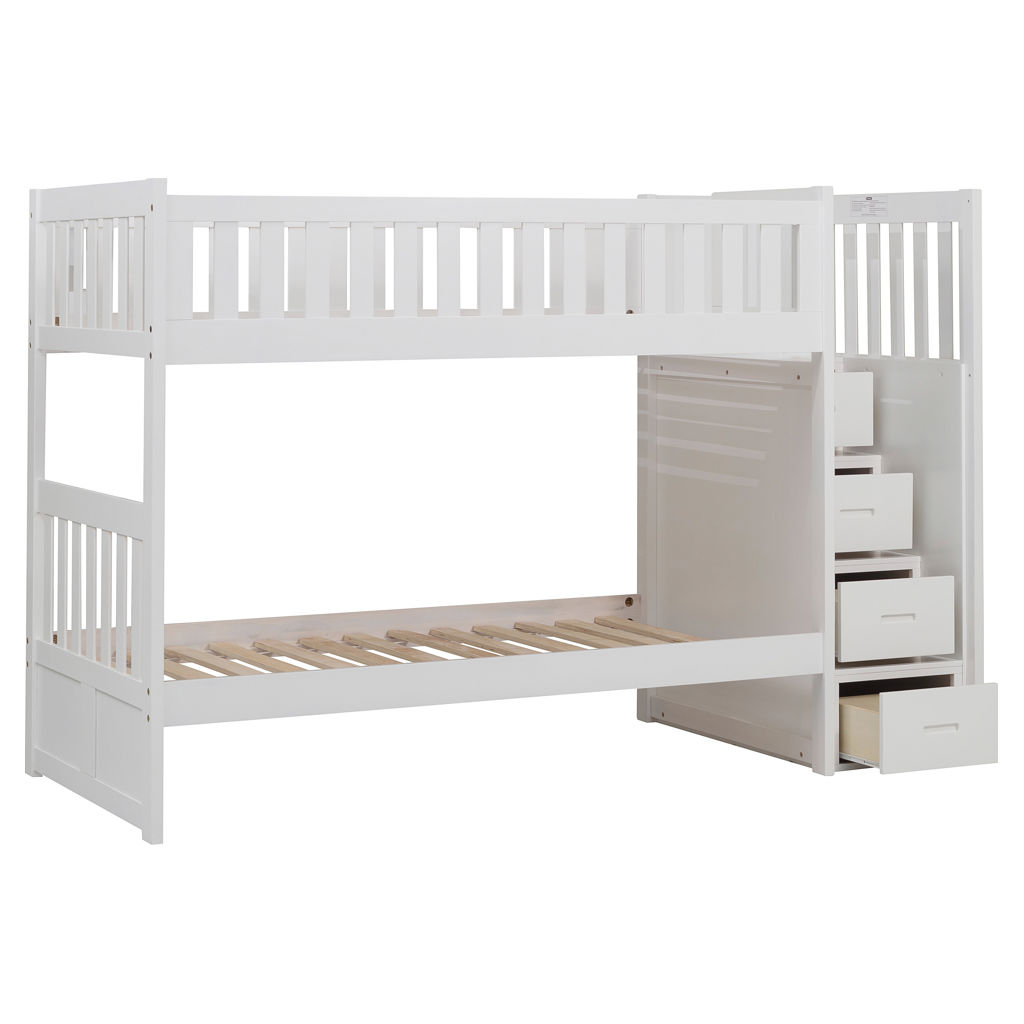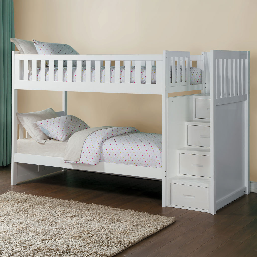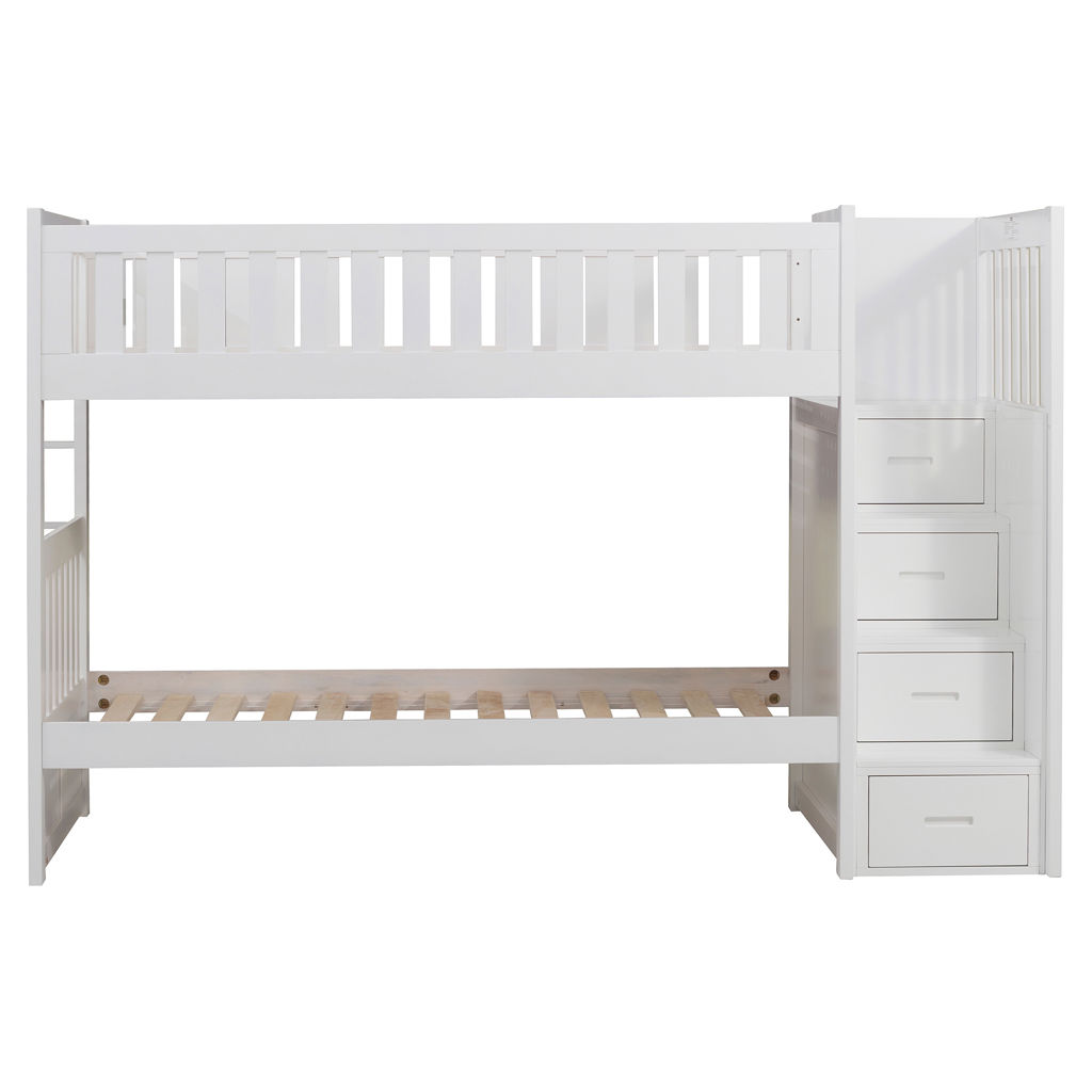 Designed to maximize storage and functionality, this bunk bed features an integrated staircase with built-in drawers, providing safe access to the top bunk while adding extra storage space for clothes, toys, or bedding. Its sturdy construction ensures stability and durability, while the guardrails on the upper bunk provide added safety.