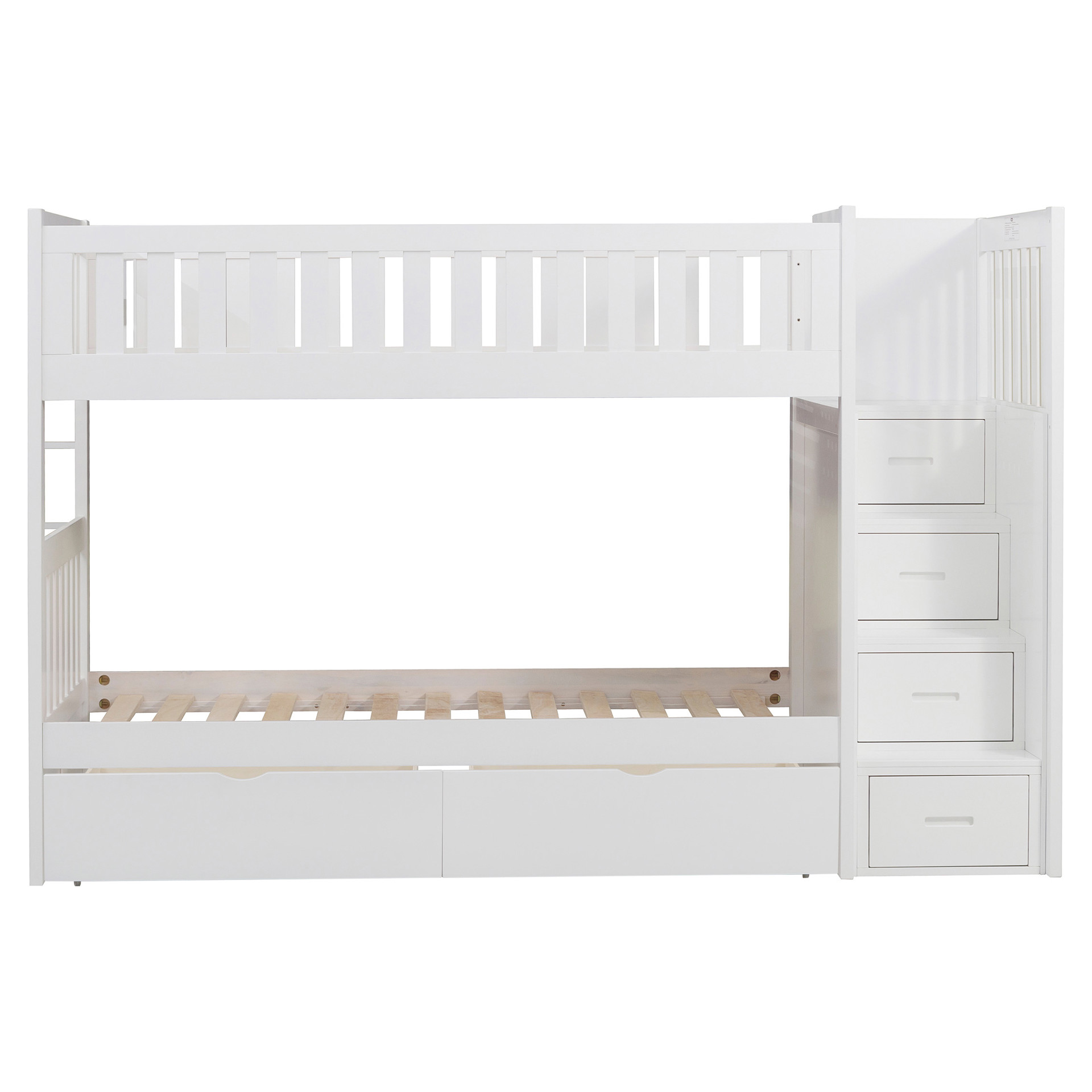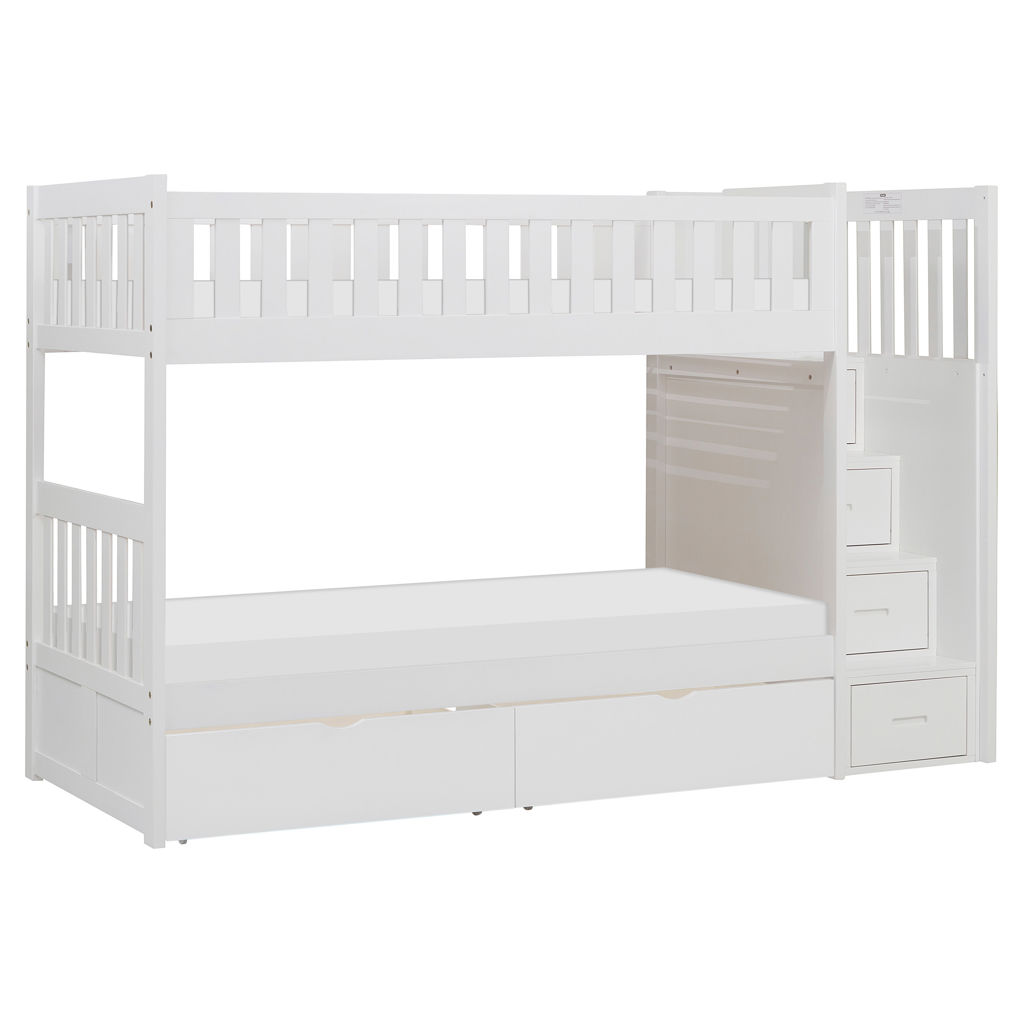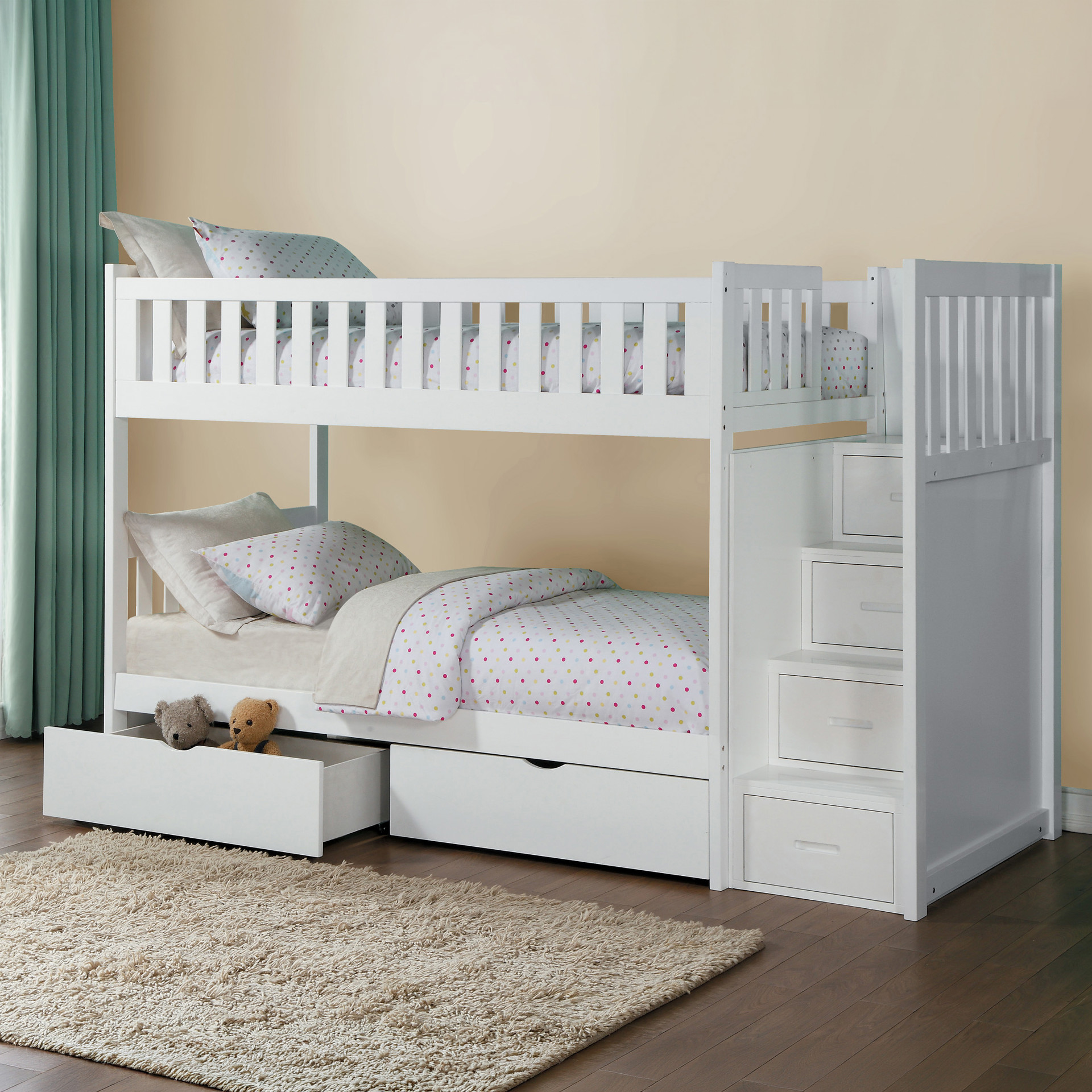 Designed to maximize storage and functionality, this bunk bed features an integrated staircase with built-in drawers, providing safe access to the top bunk while adding convenient storage for clothing, toys or bedding.