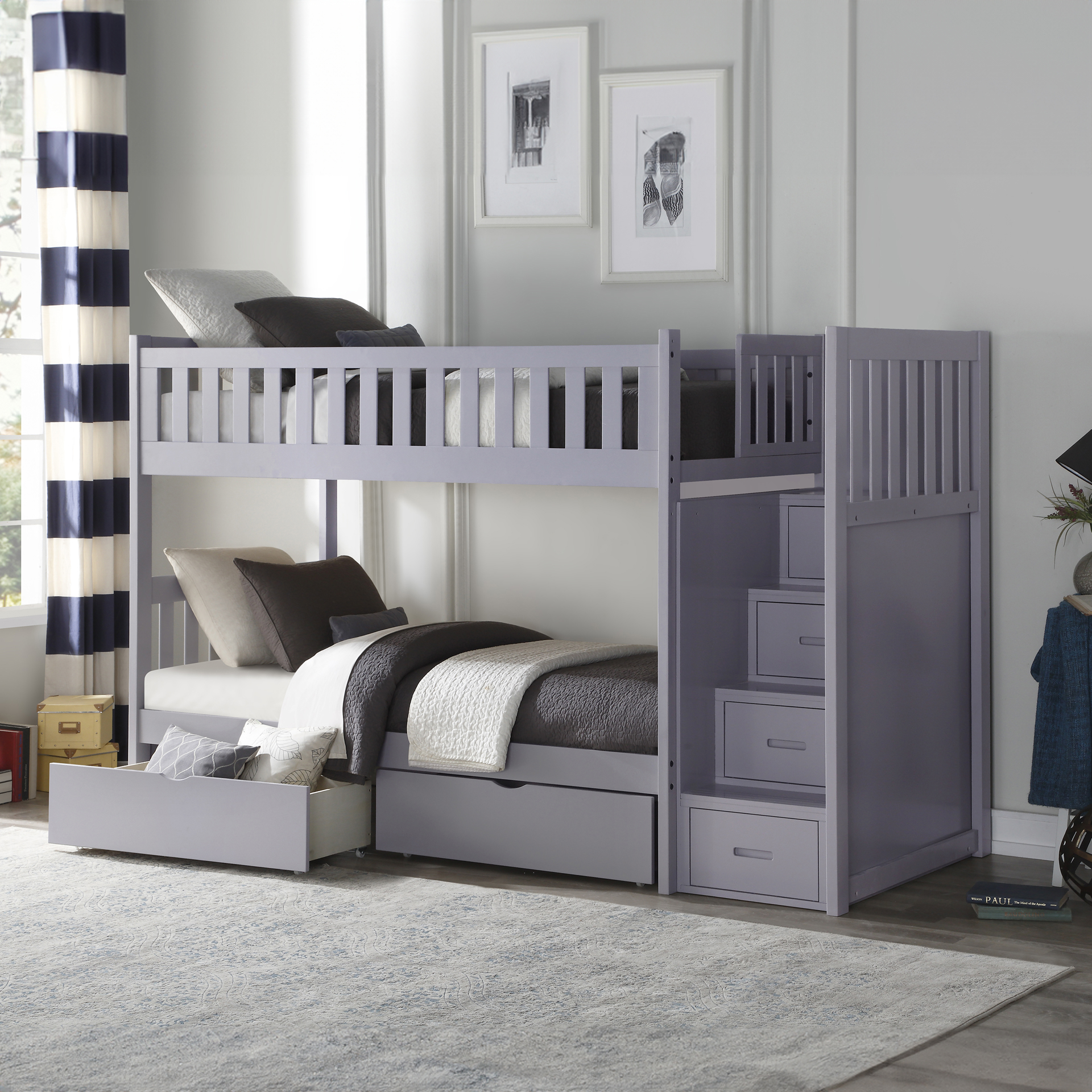 Maximizing sleep space is achieved with the stylish Orion Collection. This transitional twin over twin reversible storage stairstep bunkbed is featured in a gray finish making it an appropriate choice for a number of youth bedroom settings.