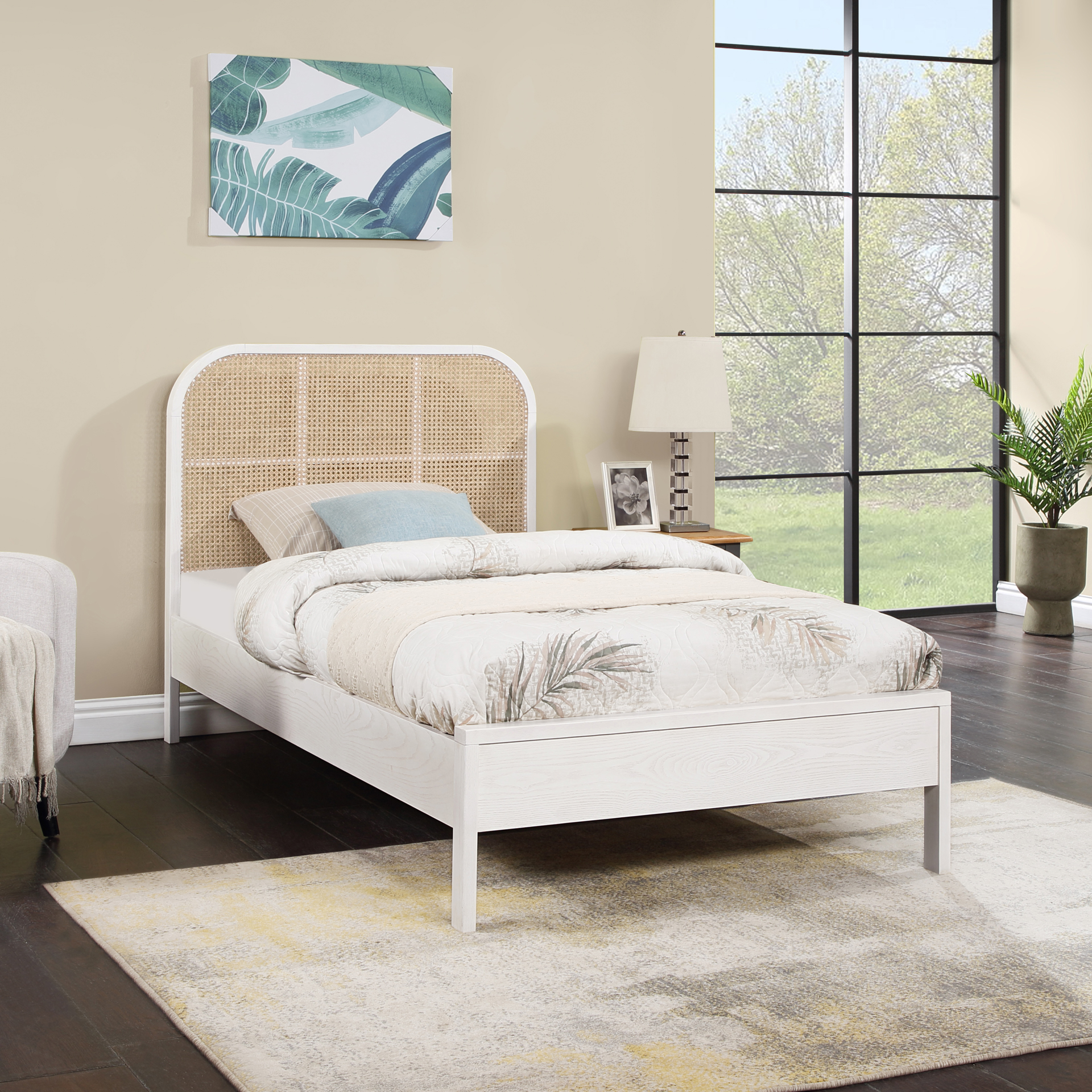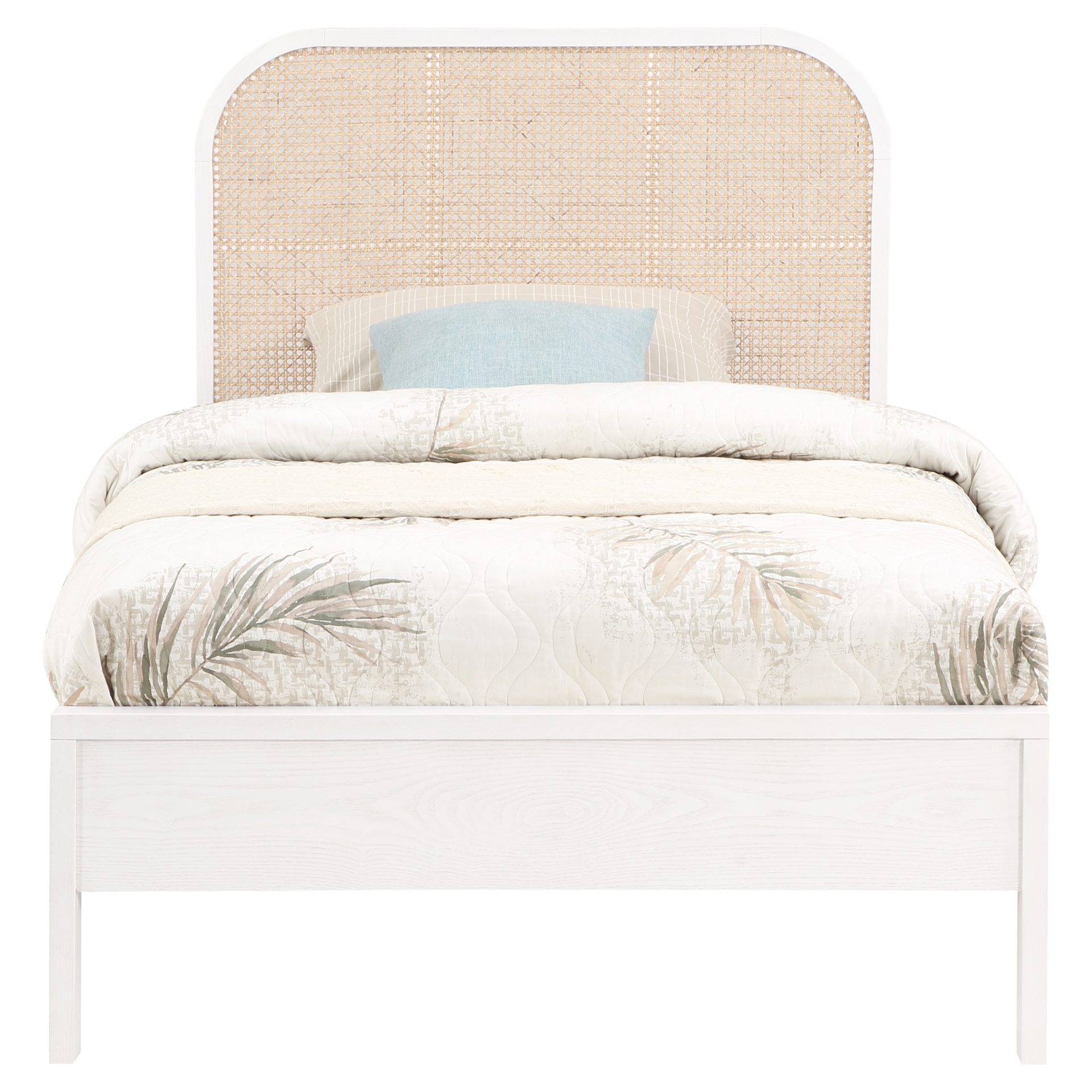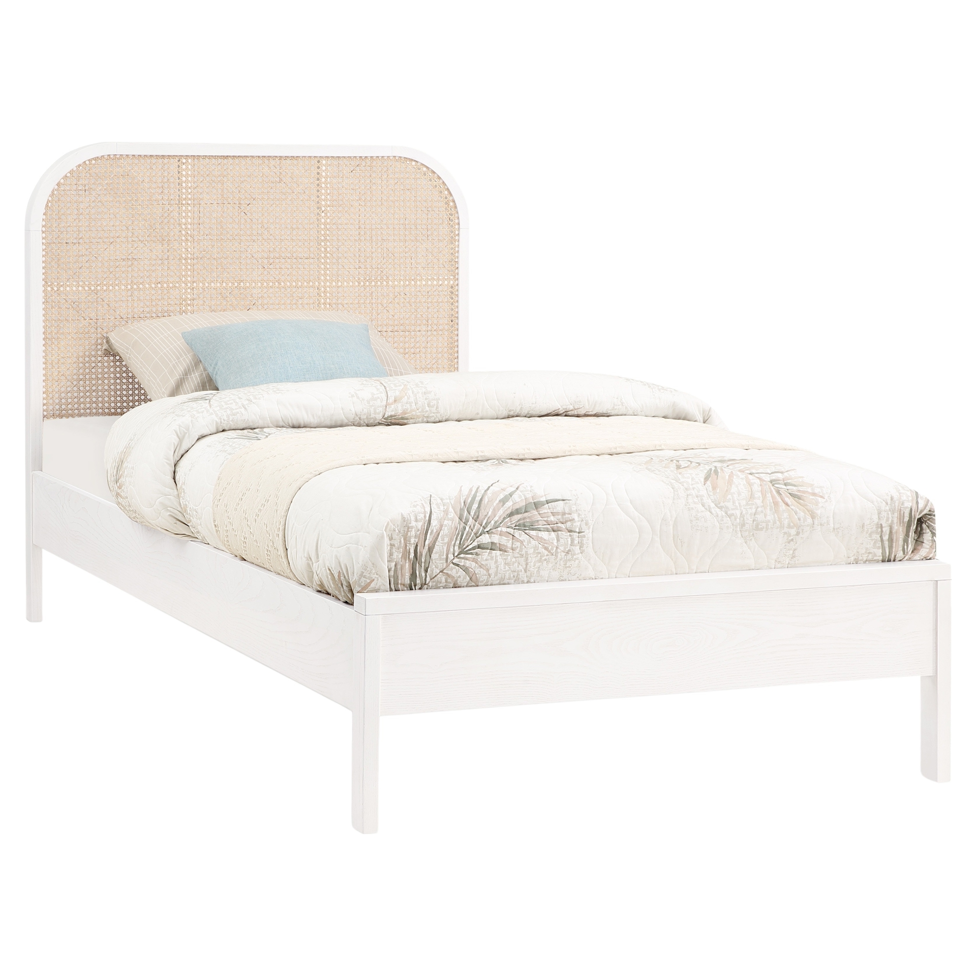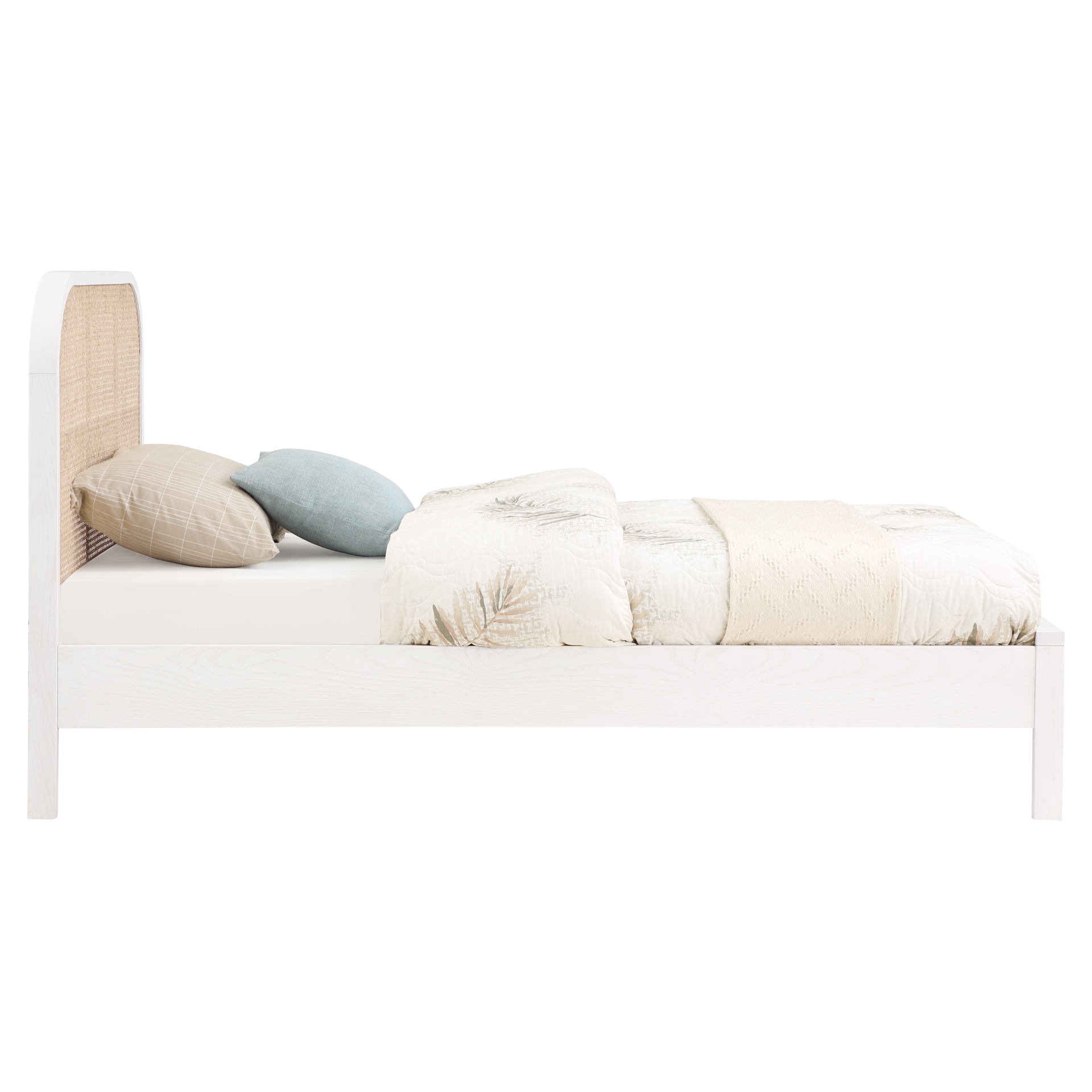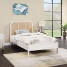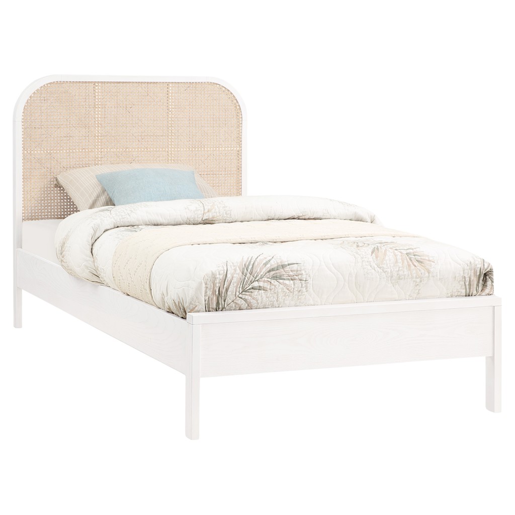 The rich white finish on ash veneer lends it a beautiful aesthetic while the natural cane insert on the headboard adds a hard-to-miss contrast that drives home the bed's elegance and sophistication.