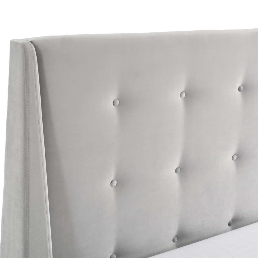 Combining contemporary angles with classic buttoning, this double bed projects an aura of modern luxury, highlighted by the refinement of its light grey velvet upholstery. It brings a touch of elegance to a trendy decor.