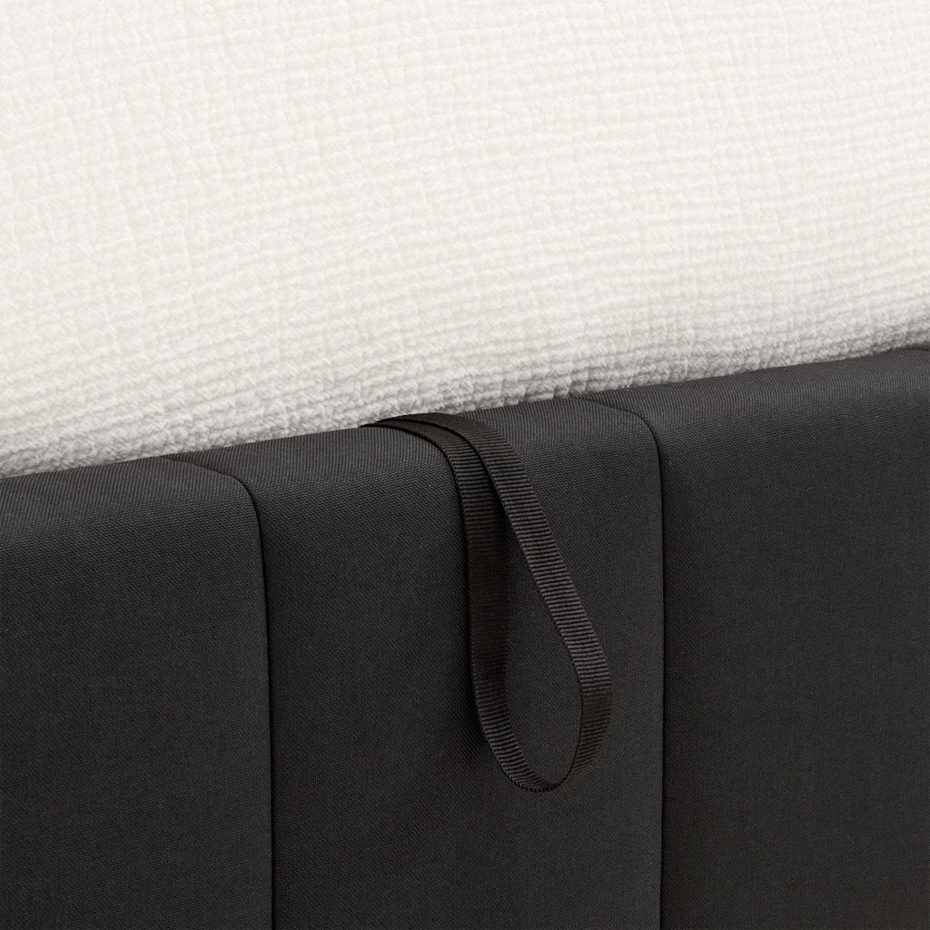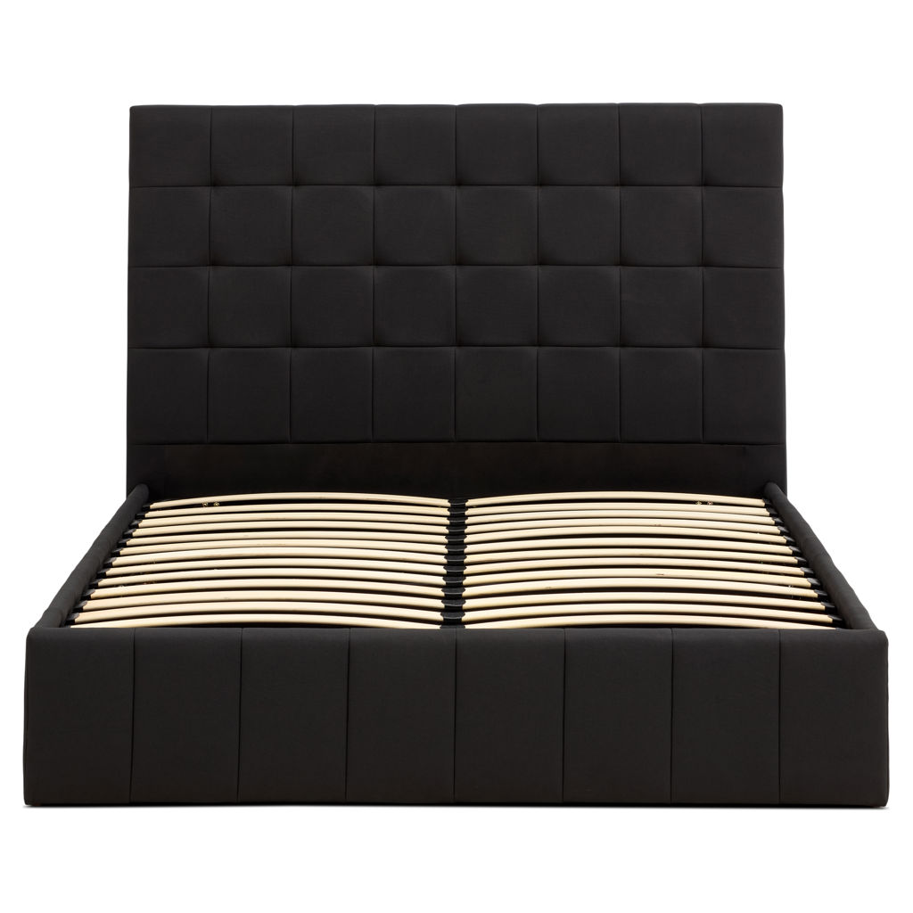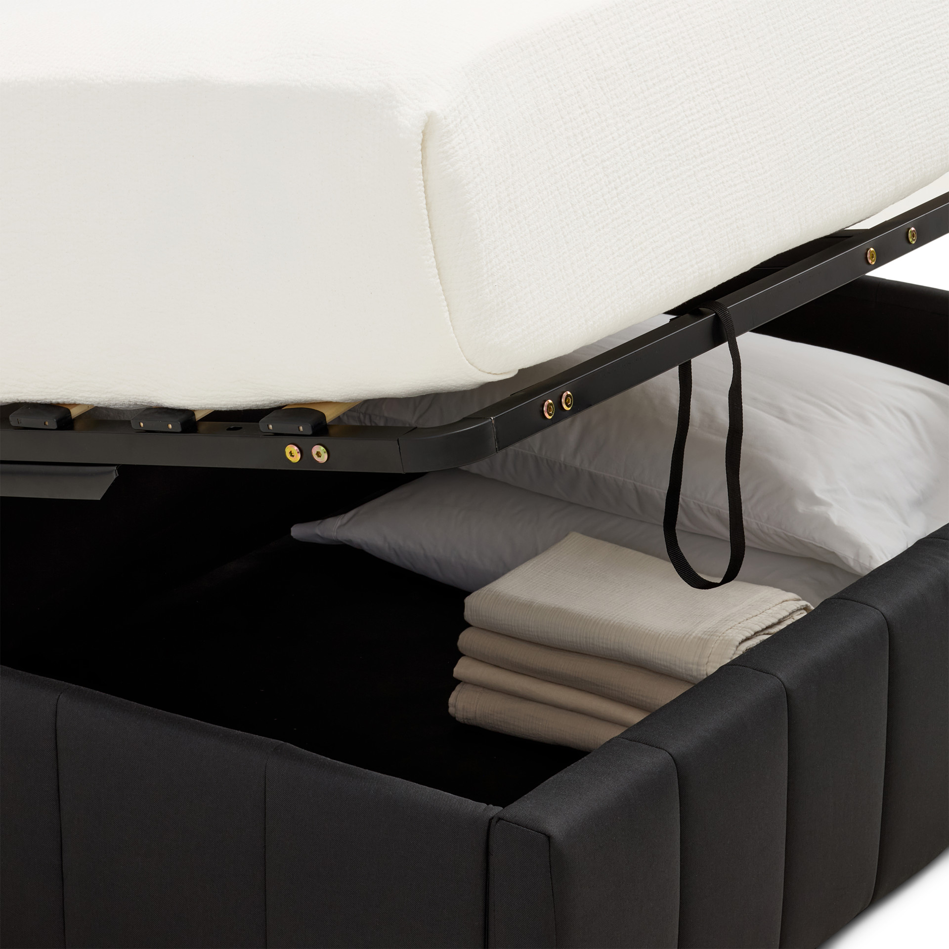 Under the mattress, you'll find a spacious, hydraulic-lift storage compartment, perfect for effortlessly optimizing space. Store comforters, pillows or out-of-season clothes discreetly.