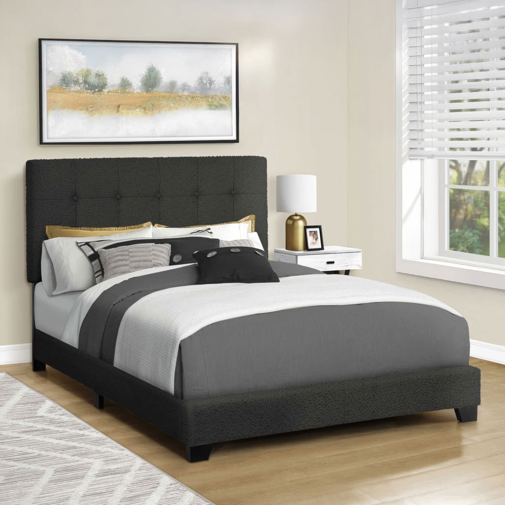 Create a sanctuary with fashionable style in your bedroom starting with this chic and trendy full size bed frame in a black boucle fabric and plastic, black block feet. This transitional style upholstered bed is designed with a classic, button-tufted padded headboard where you can lean back for comfortable support.
