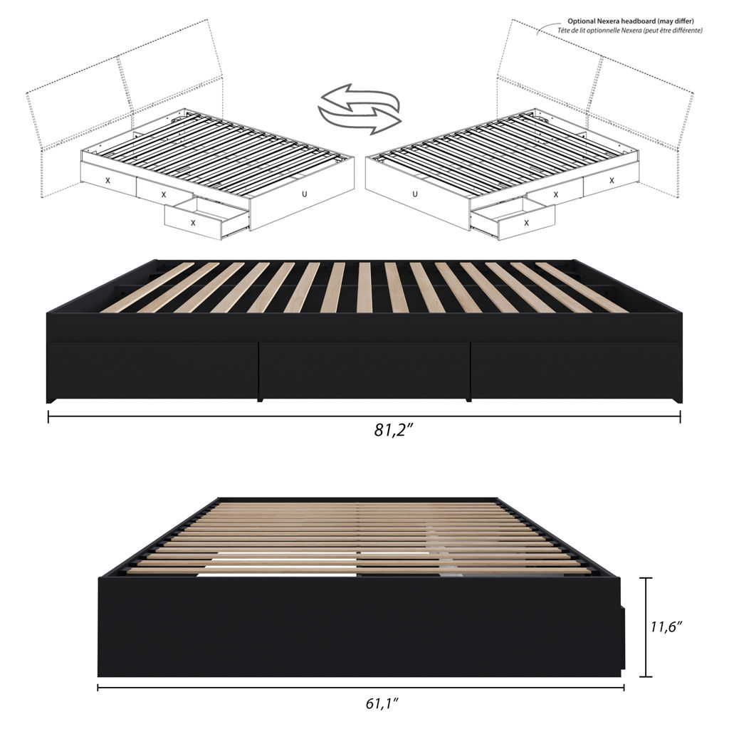 The Nexera queen storage bed can be paired with one of Nexera’s queen headboards to create a complete bed with plenty of storage.