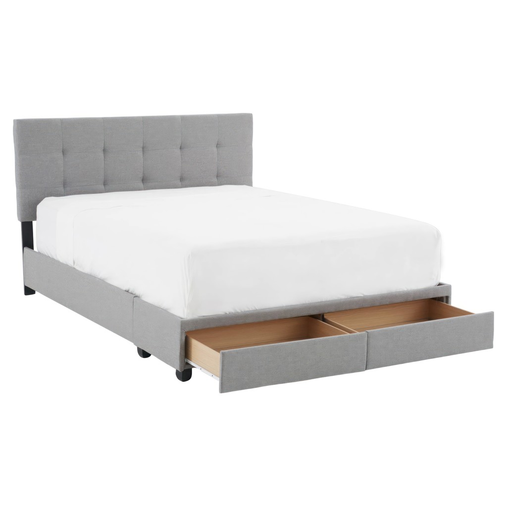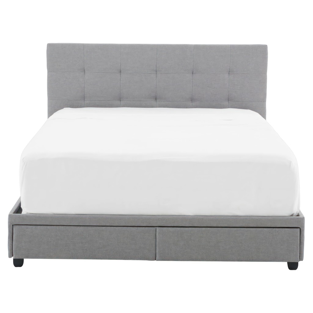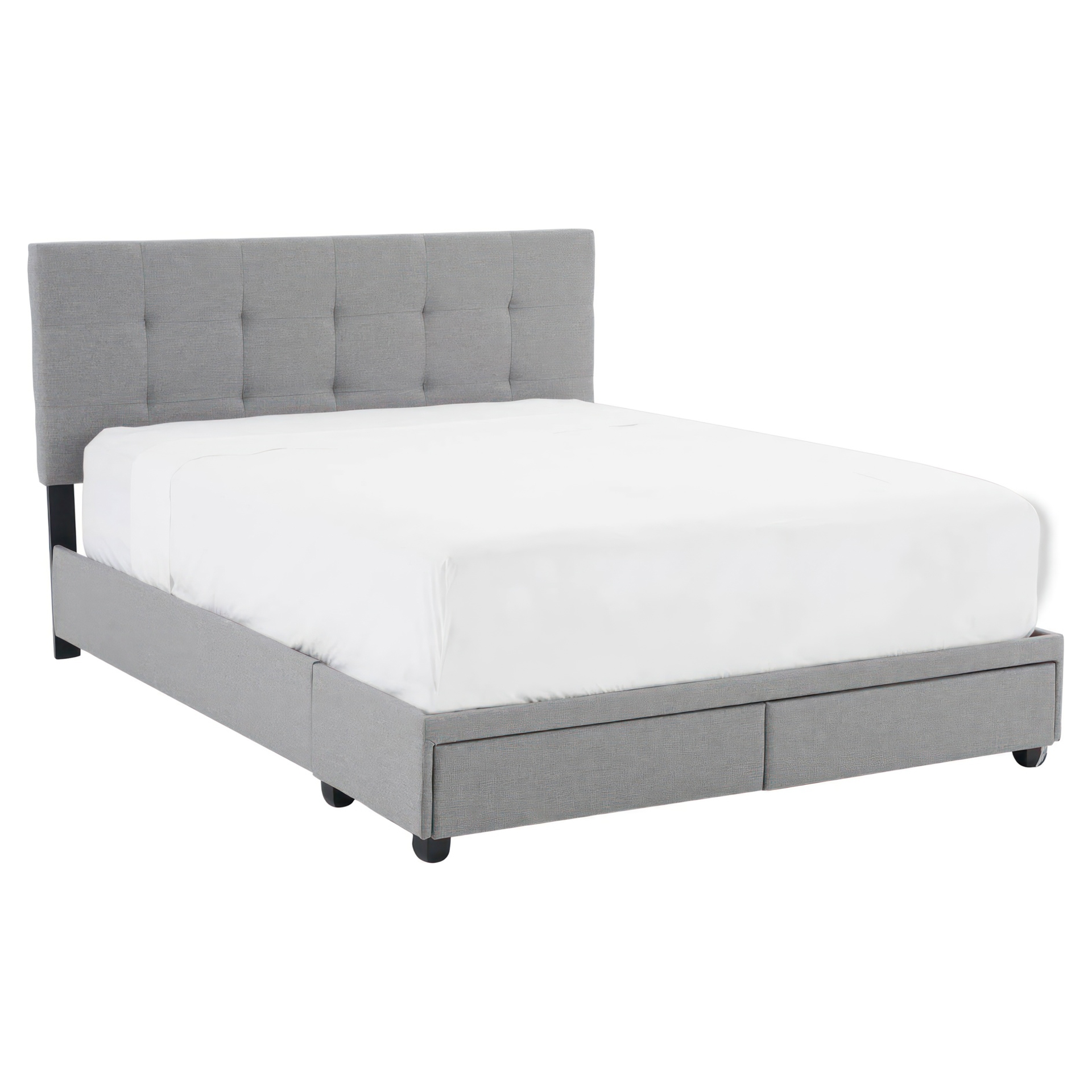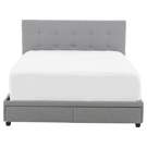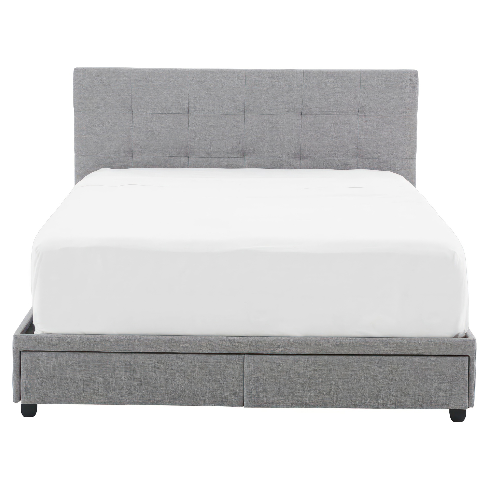 Comfort and convenience come together in this upholstered platform bed with 2 storage drawers. A grey linen-look fabric covers the bed frame and the tufted headboard, giving the bed a soft, comfortable feel all around. For a clean, modern look, the storage drawers are built into the foot of the bed and glide smoothly on drawer slides. With its contemporary style and practical design, this bed is an ideal solution for bedrooms in need of extra storage space.