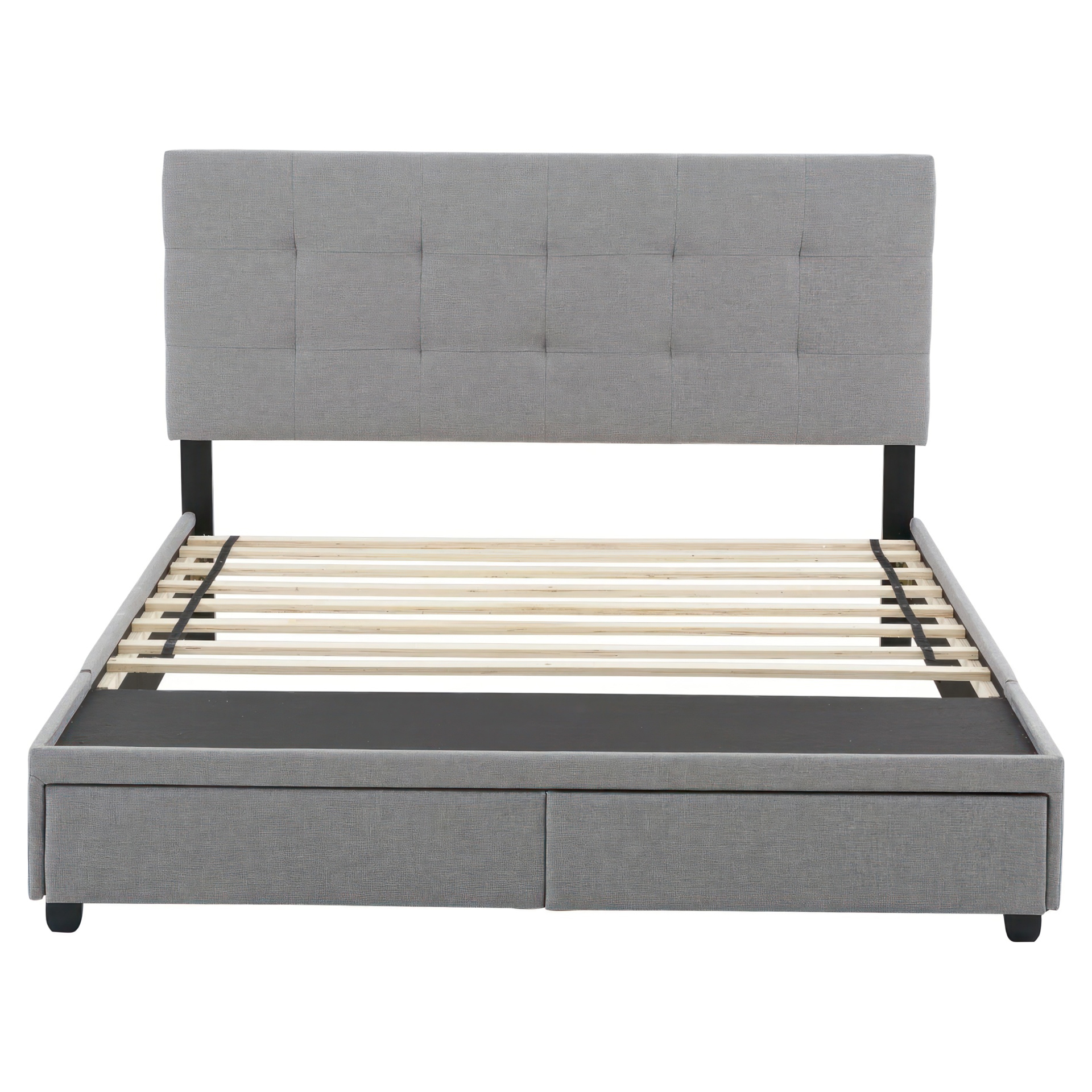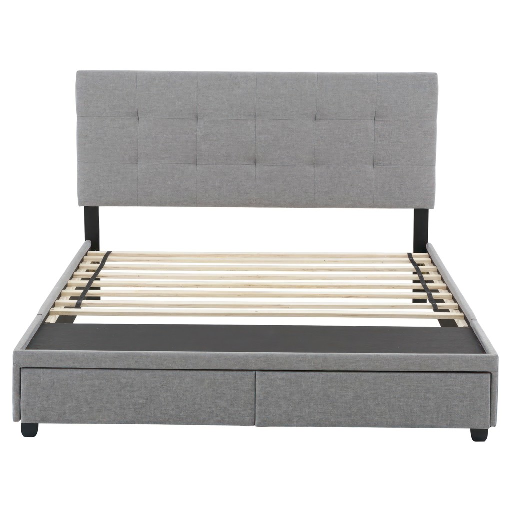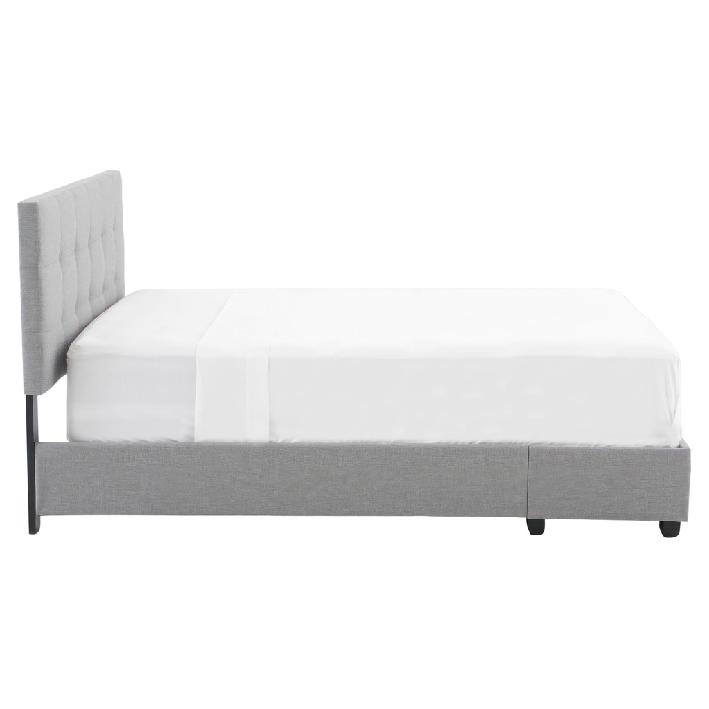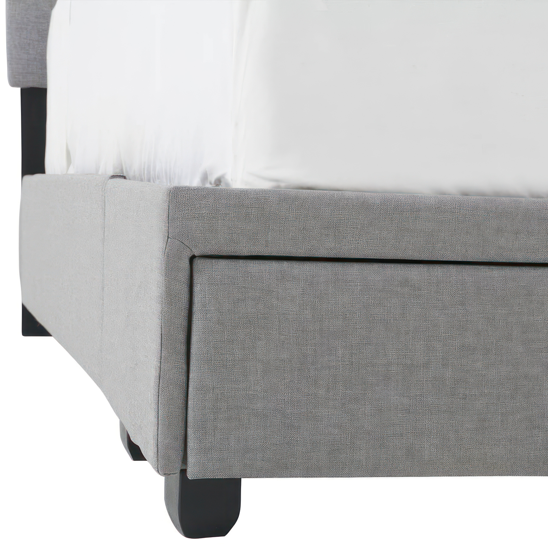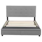Comfort and convenience come together in this upholstered platform bed with 2 storage drawers. A grey linen-look fabric covers the bed frame and the tufted headboard, giving the bed a soft, comfortable feel all around. For a clean, modern look, the storage drawers are built into the foot of the bed and glide smoothly on drawer slides. With its contemporary style and practical design, this bed is an ideal solution for bedrooms in need of extra storage space.