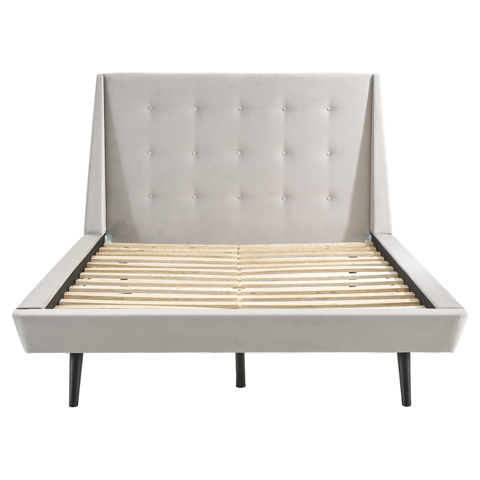 Combining contemporary angles with classic buttoning, this queen-size bed projects an aura of modern luxury, highlighted by the refinement of its light grey velvet upholstery. It brings a touch elegance to a trendy decor.