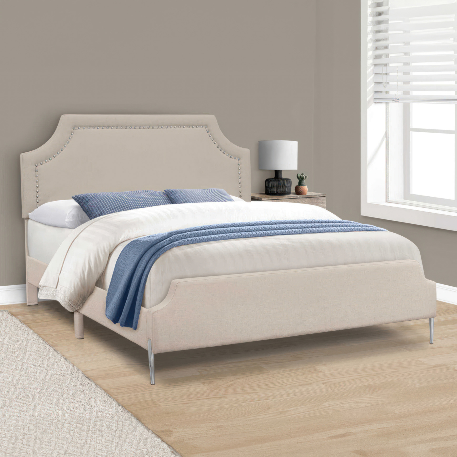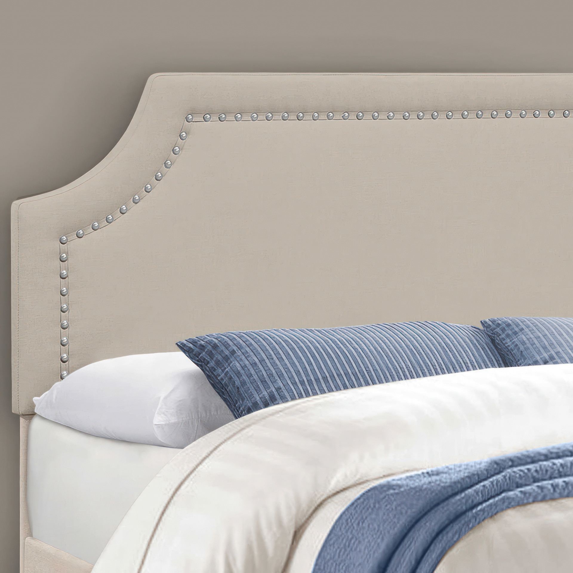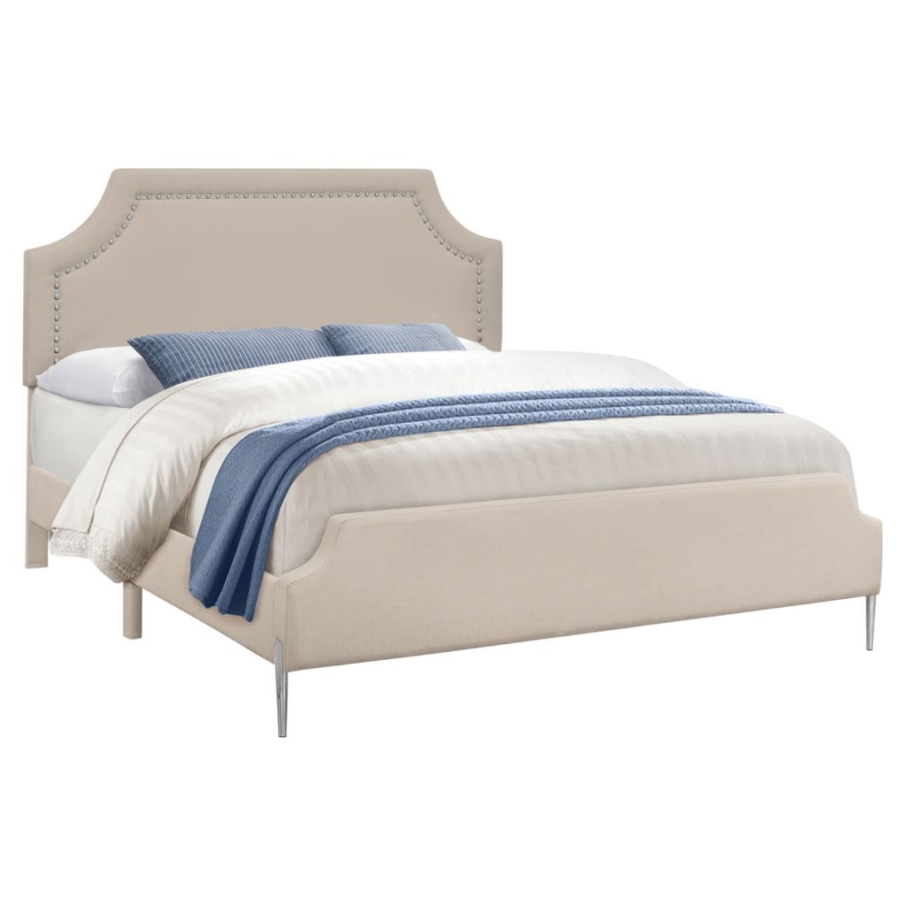 Wrapped in a neutral beige linen-look fabric on all sides over foam-padded cushioning, the chrome nail-head trim stylishly outlines the arch cut-out on the headboard for that subtle glam hit.