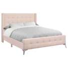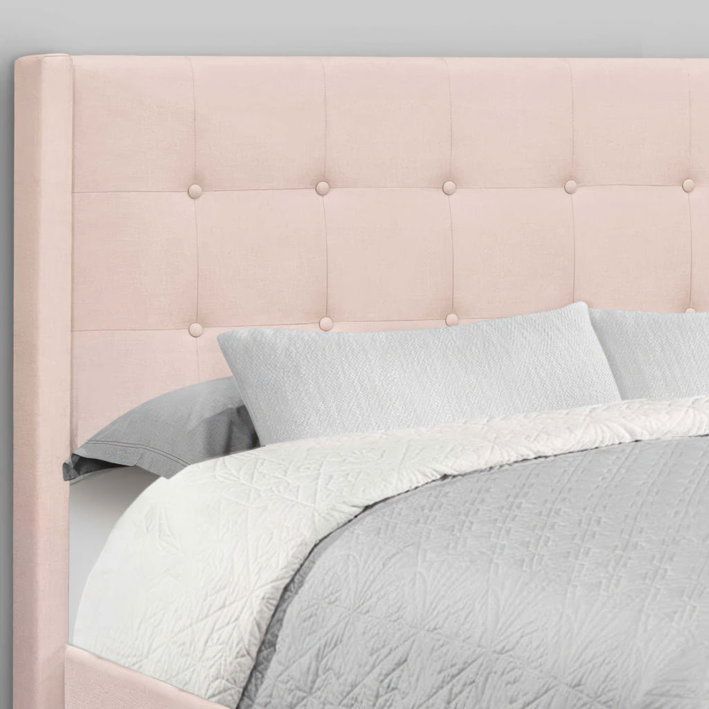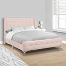 This queen-sized bed frame is covered in a soft pink velvet fabric over foam cushioning on all sides, with elegant button tufting on both the curved headboard and footboard for a full luxurious appeal.