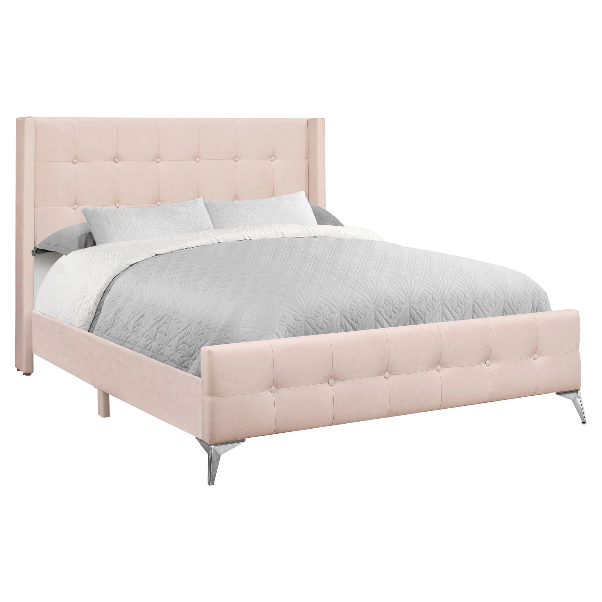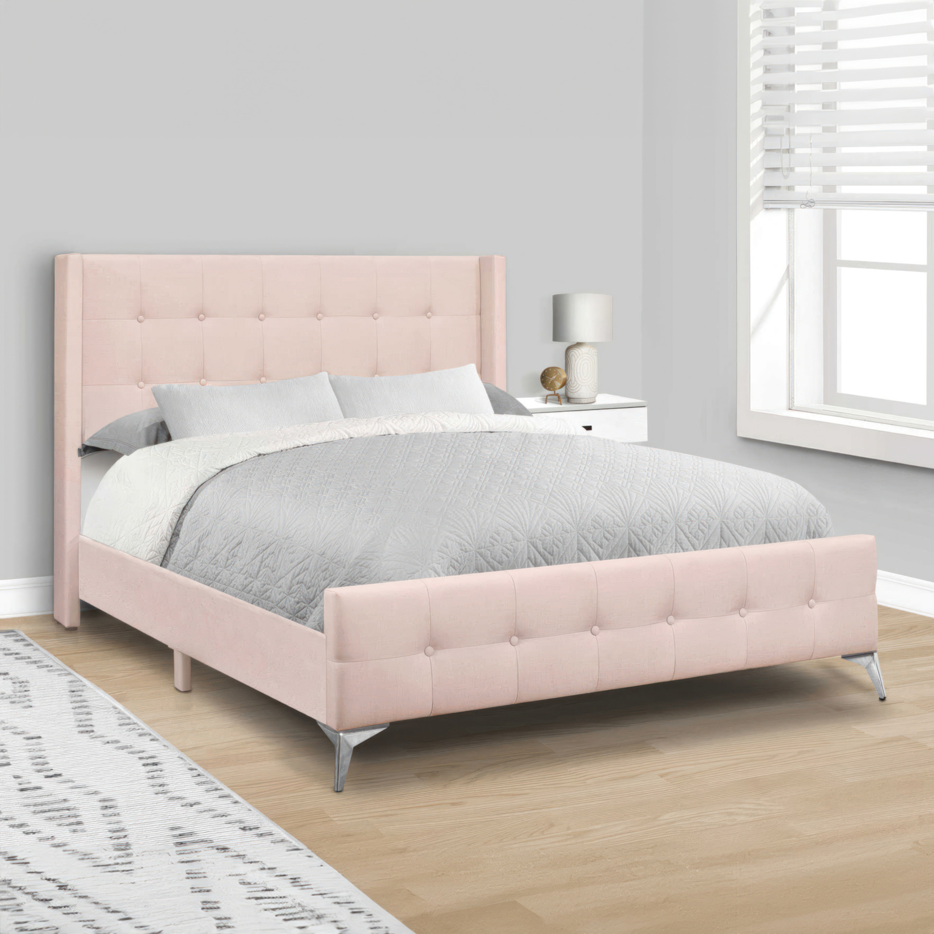 The support legs are covered with the same pink velvet material for an attractive finish, and the chrome metal slanted feet at the footboard gives the whole bed that hint of modernity and glam.