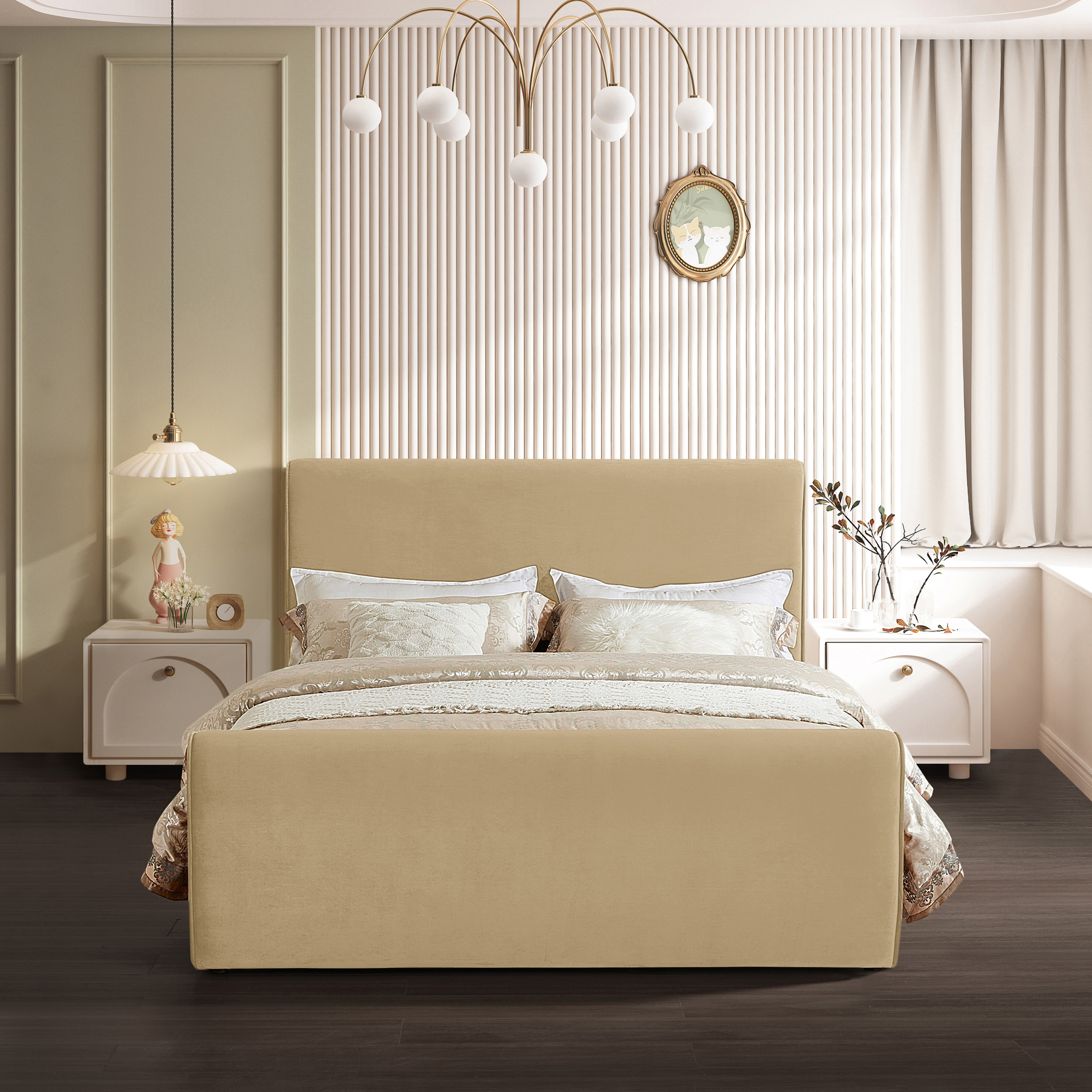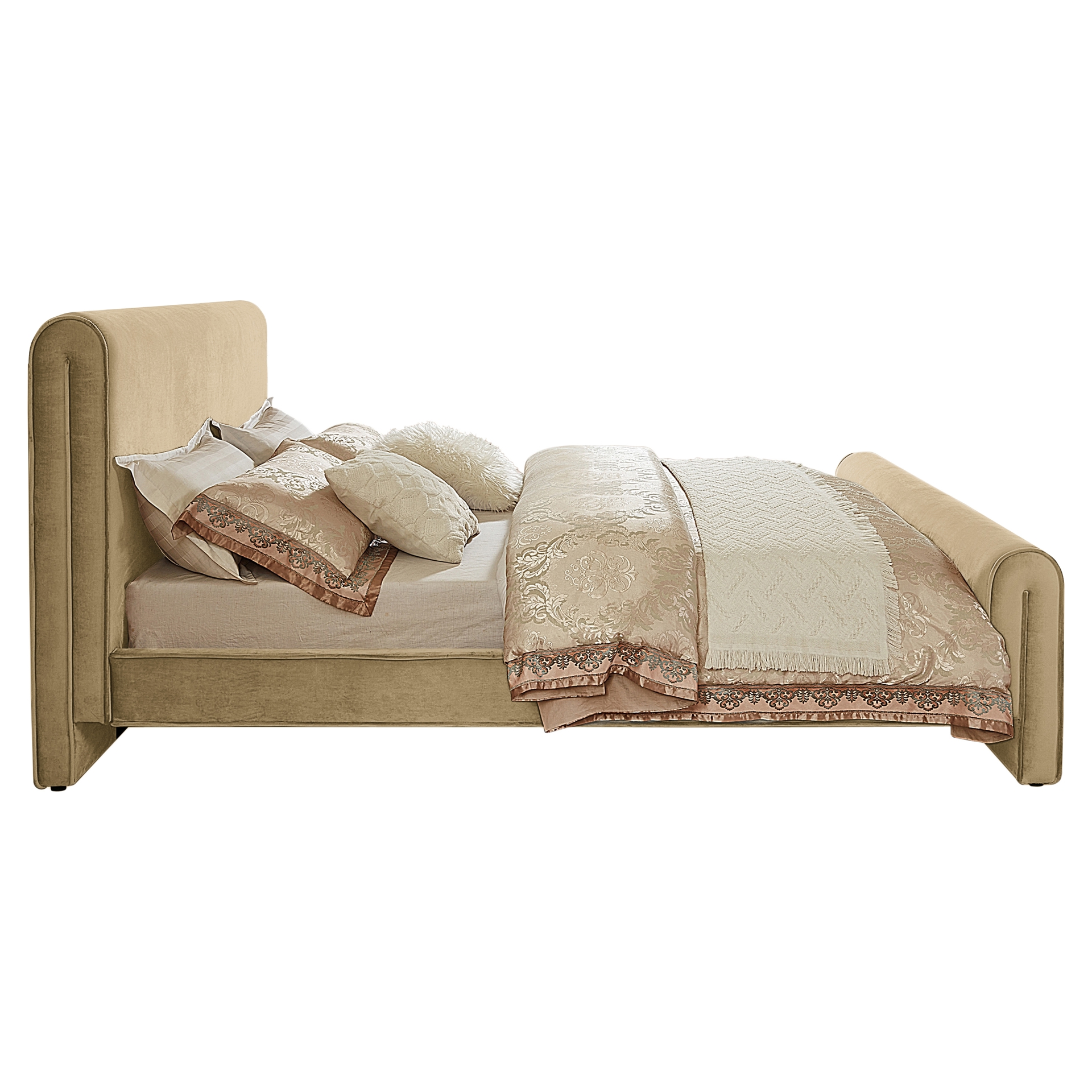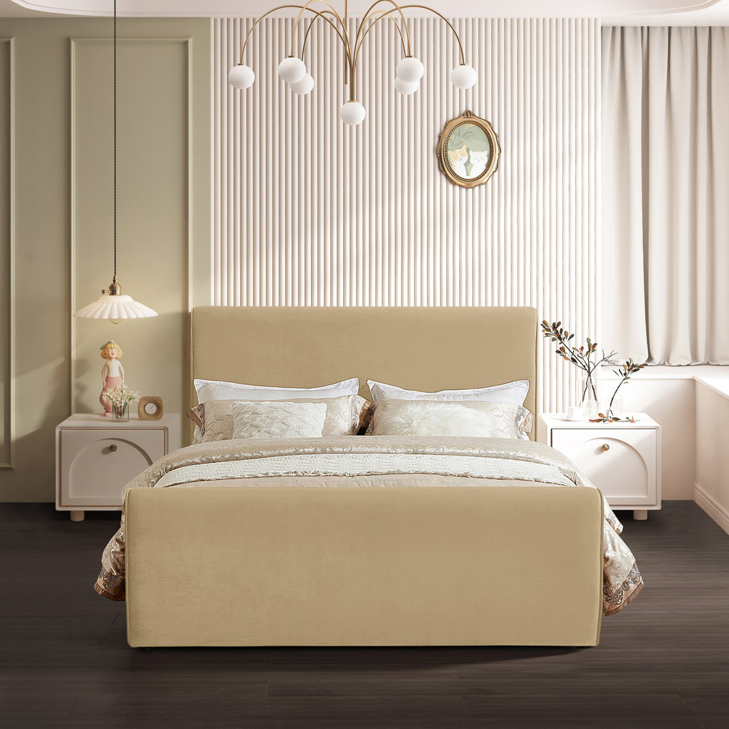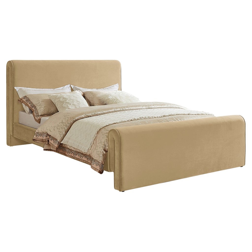 This stunningly beautiful bed is just the thing for a bedroom makeover that turns heads. The bed's headboard, footboard and sides are covered in the softest rich camel velvet for a striking look that is elegantly contemporary in your master bedroom suite or other space.