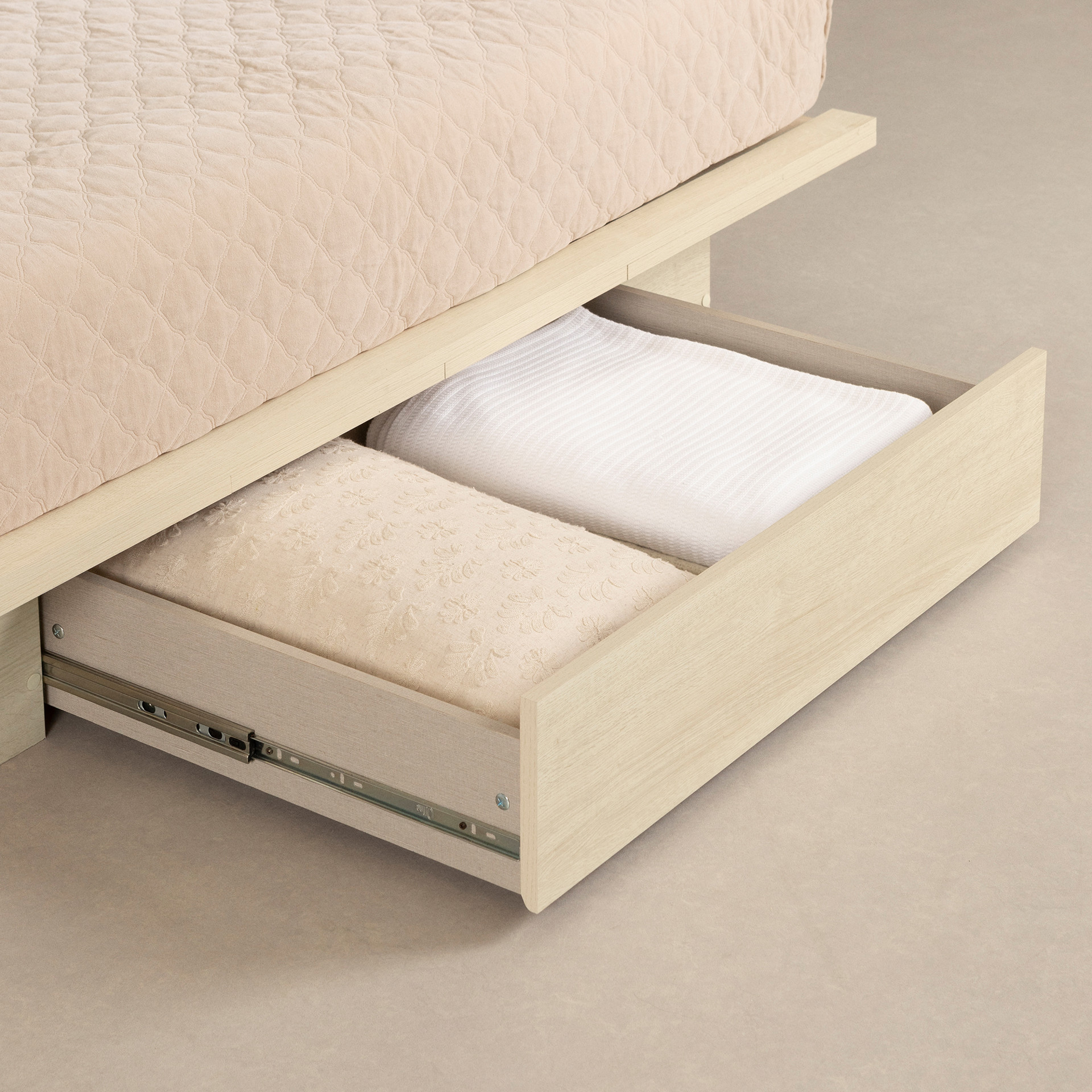 This bed is more than a sturdy platform; it's a smart storage solution. The integrated drawer is spacious yet discreet, with a smooth handle-less design for easy access. It helps keep your bedroom organized and your belongings within easy reach.