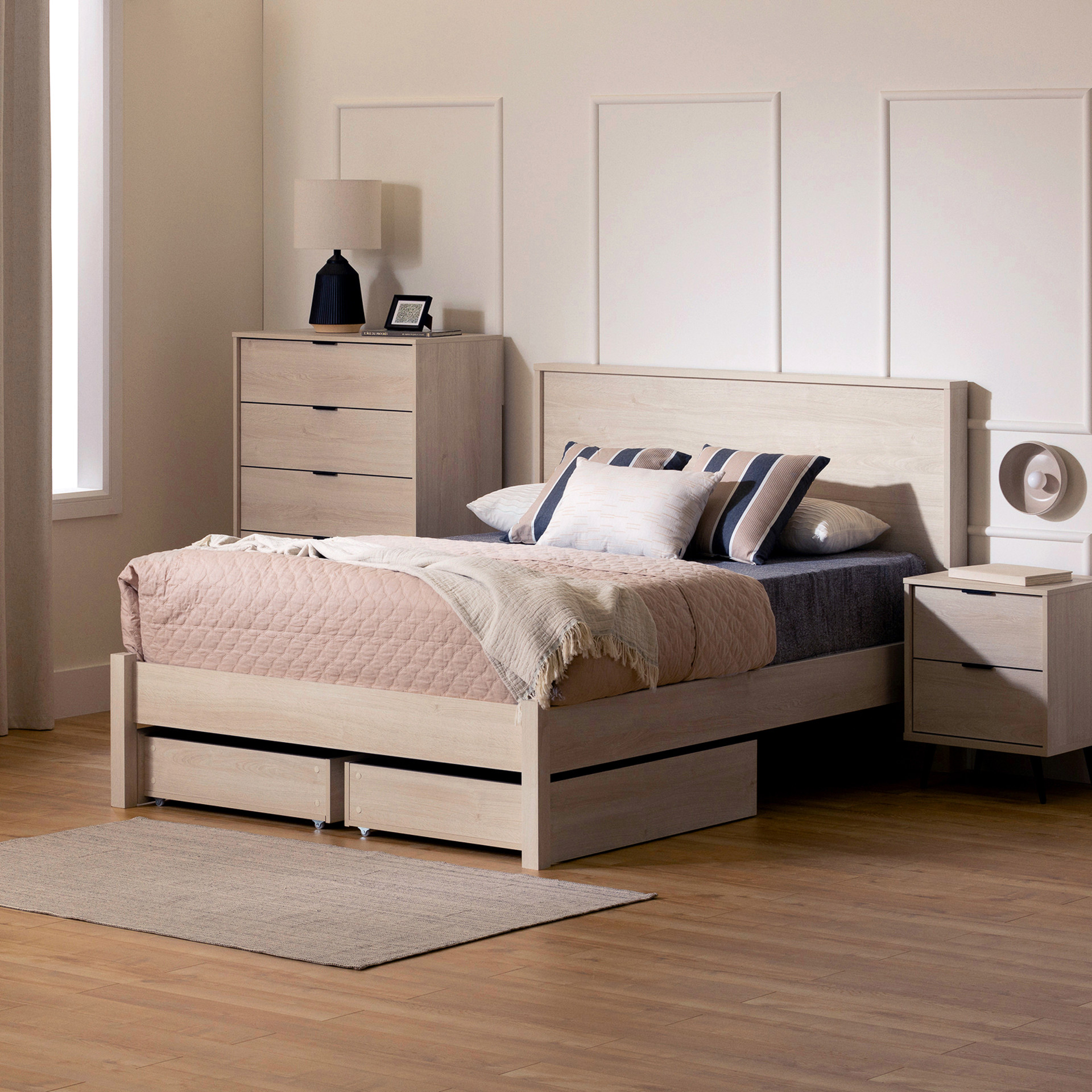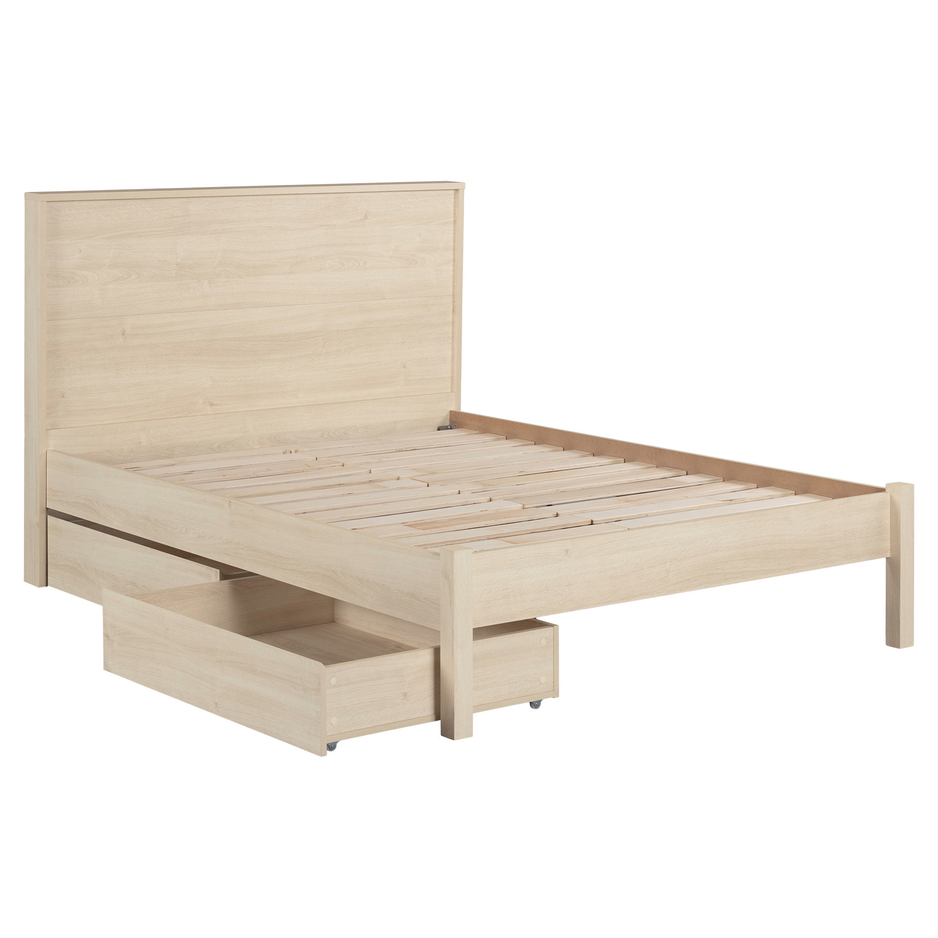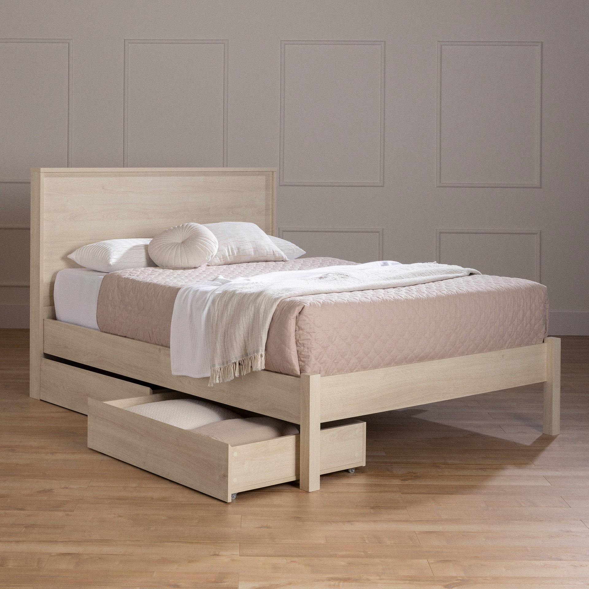 The two drawers on casters offer a flexible and easy-to-access storage solution, perfect for seasonal clothes or extra bedding. They can be placed on either side of the bed according to your needs, allowing you to keep a tidy room while optimizing available space.