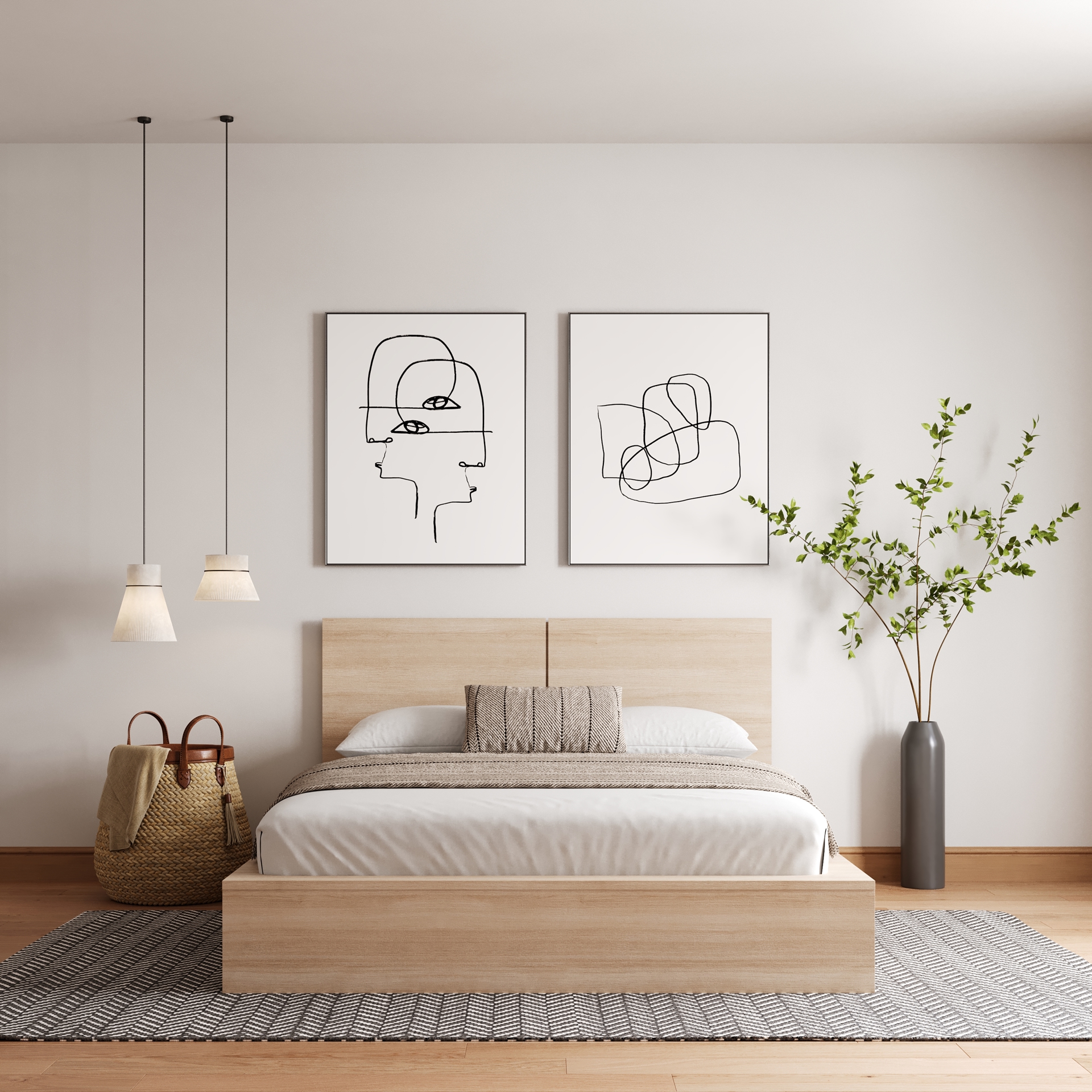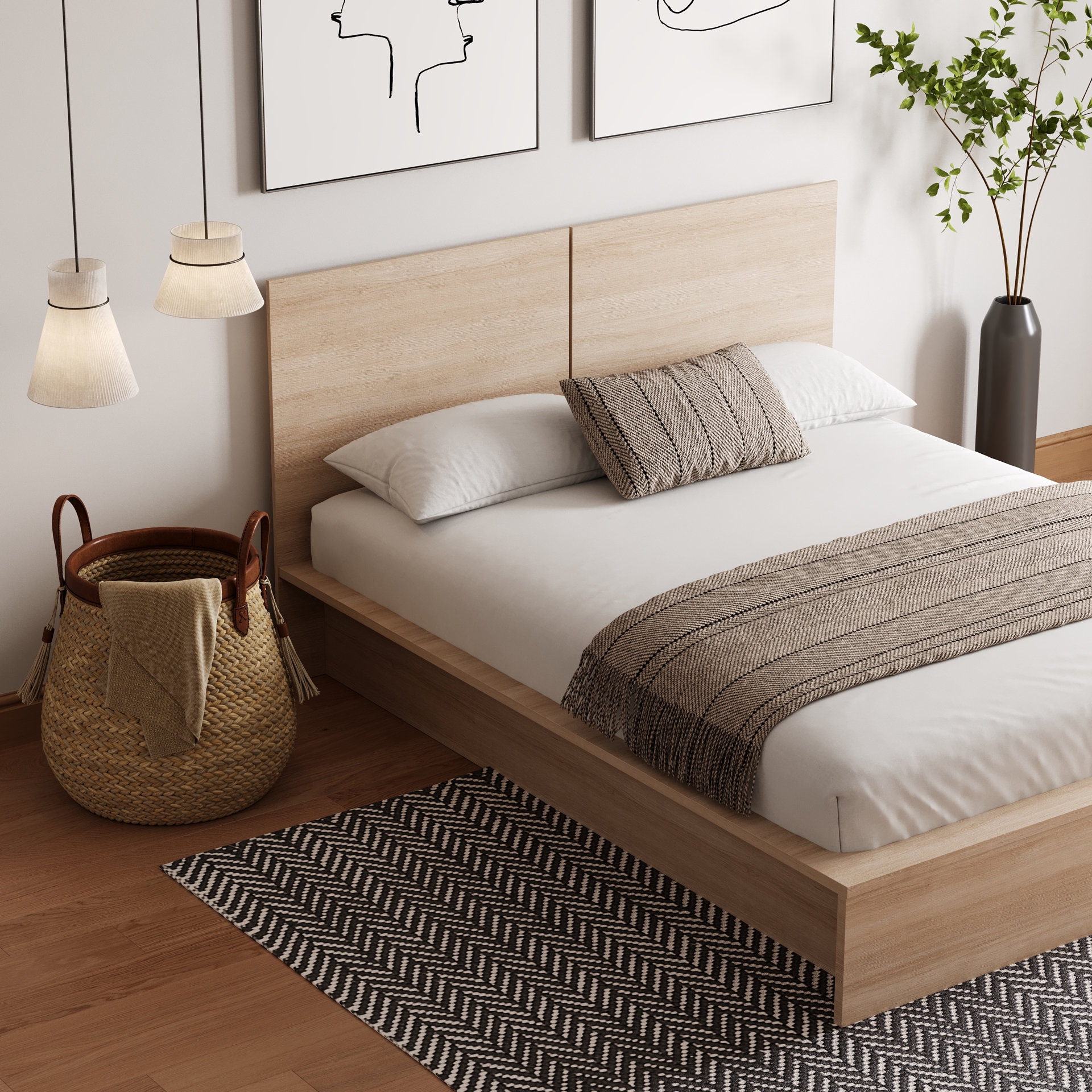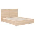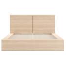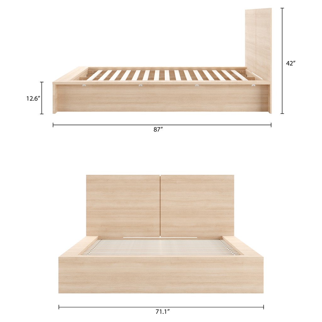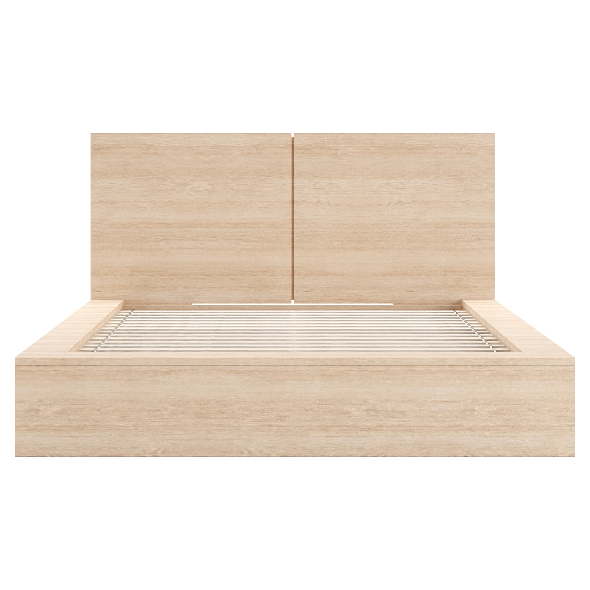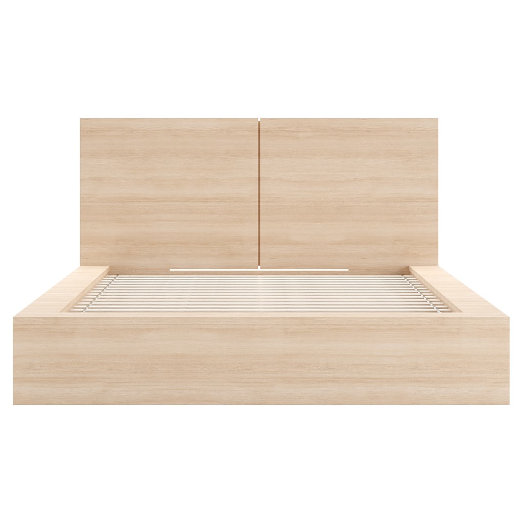 Natural oak platform bed with headboard. Made from high-quality engineered wood with an oak finish, this platform bed features a striking headboard that complements its clean, minimalist design, adding a touch of contemporary elegance to your space.