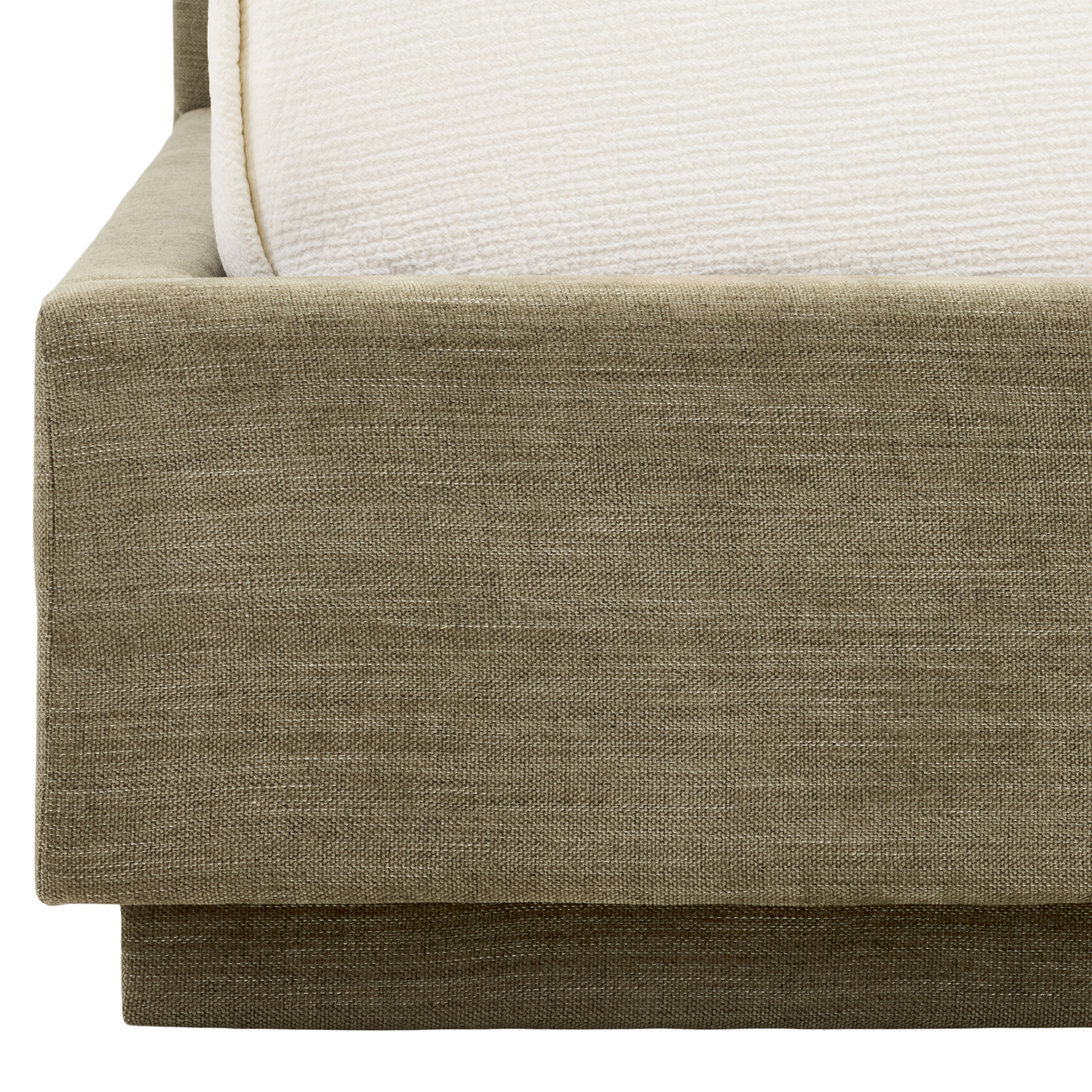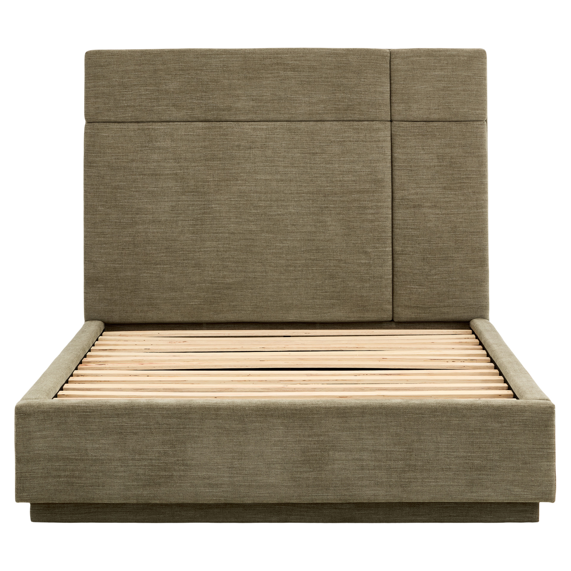 The Paola collection offers a refined and comfortable platform bed, upholstered in a textured grey-green fabric. The bed is built on a sturdy plywood frame, complemented by plush padding for enhanced comfort.