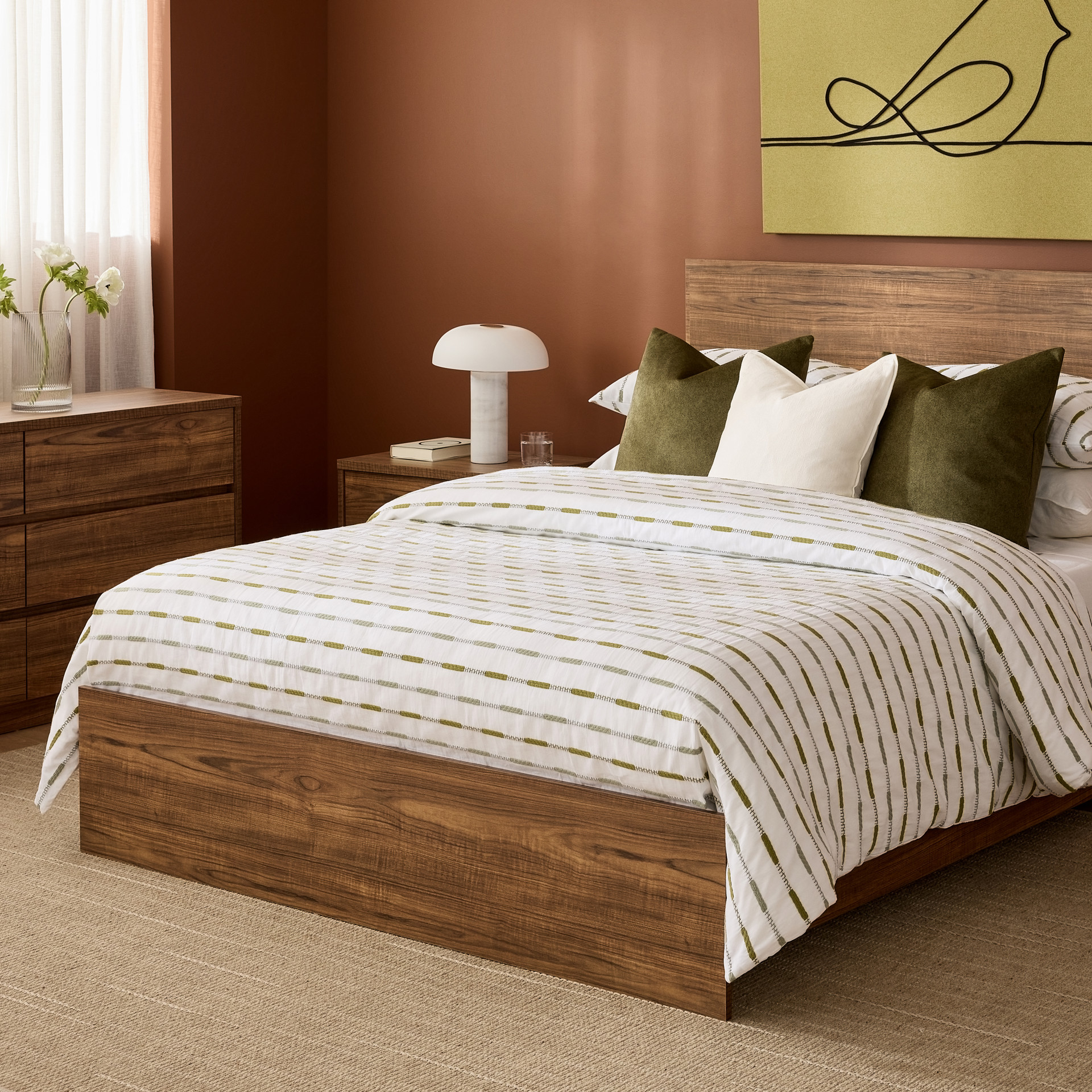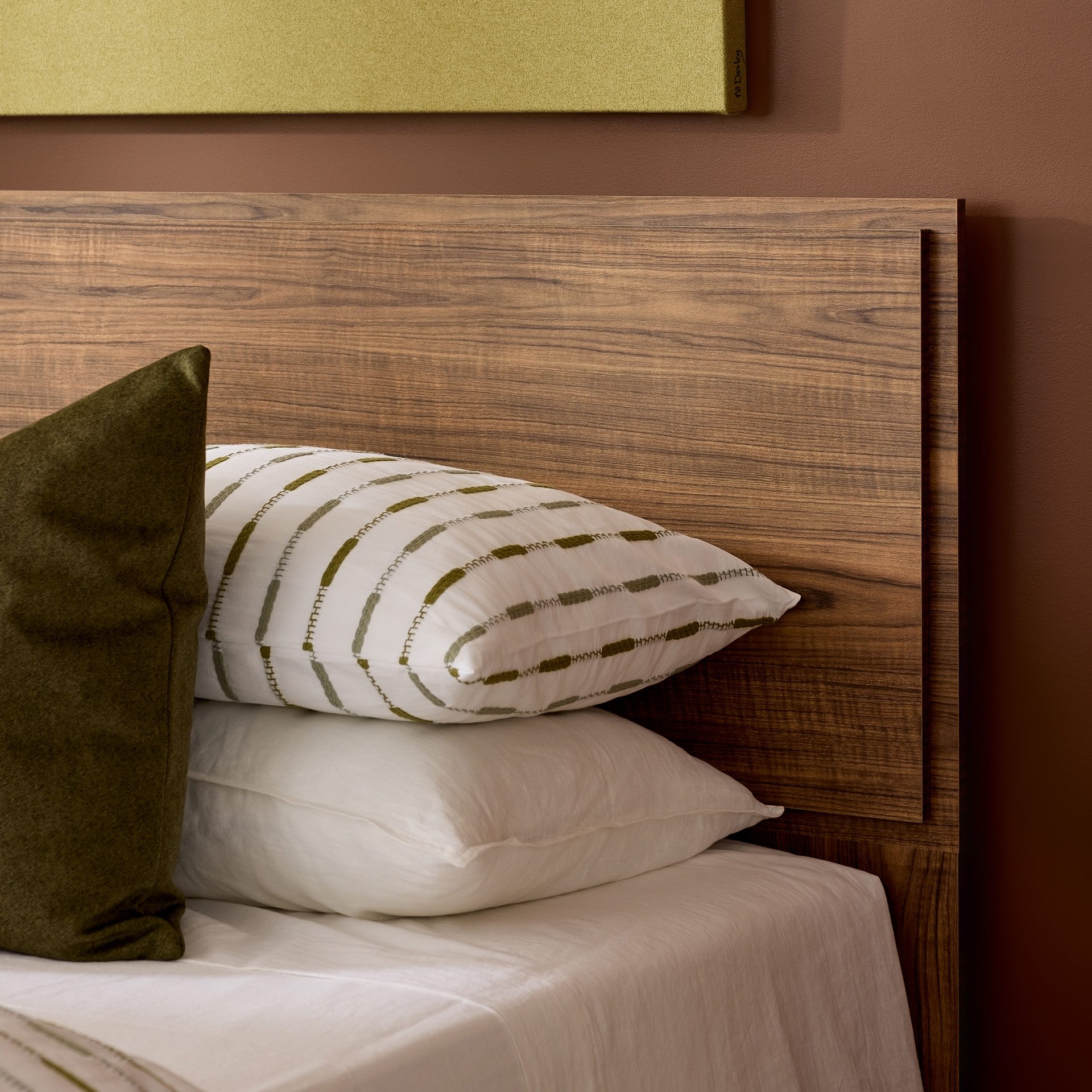 Its clean design and modern lines bring an elegant, timeless touch to the bedroom while highlighting the natural texture of the wood.