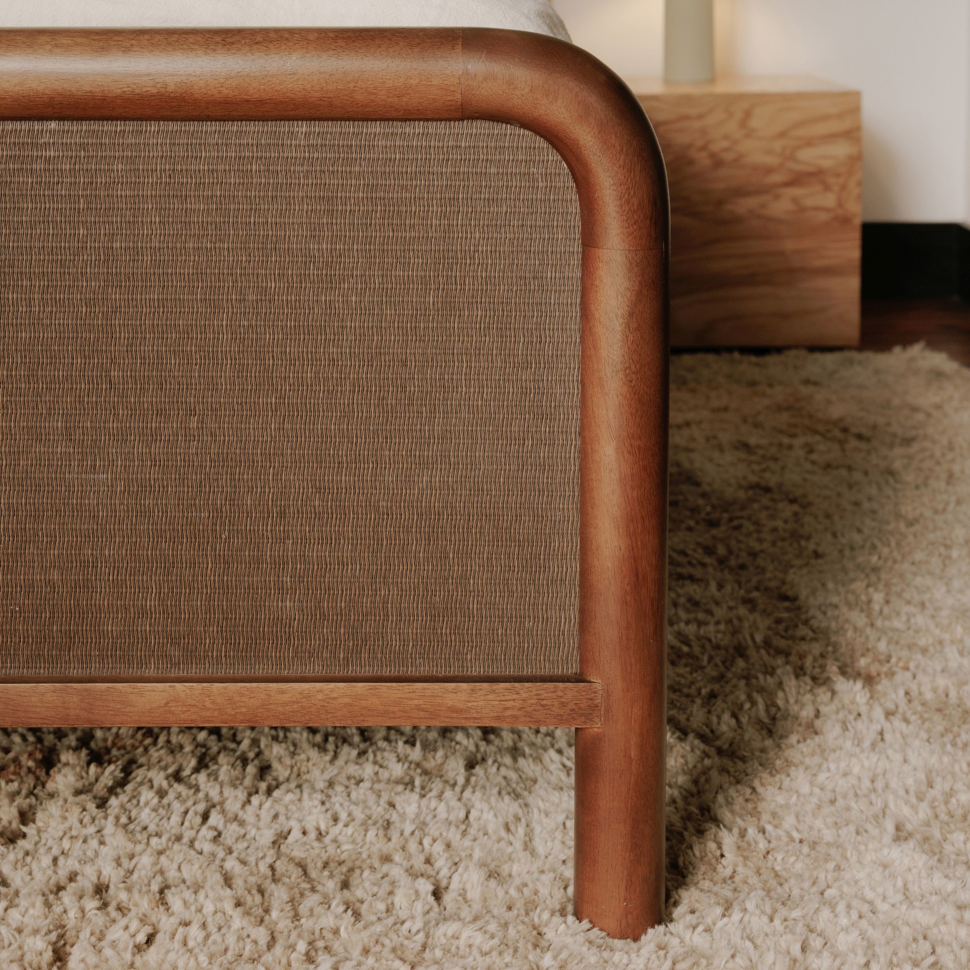 An inventive translation of piping detailing on traditional upholstery, the tonal woven soft rush headboard and footboard add texture while complementing the solid mango wood construction of the Rye collection.
