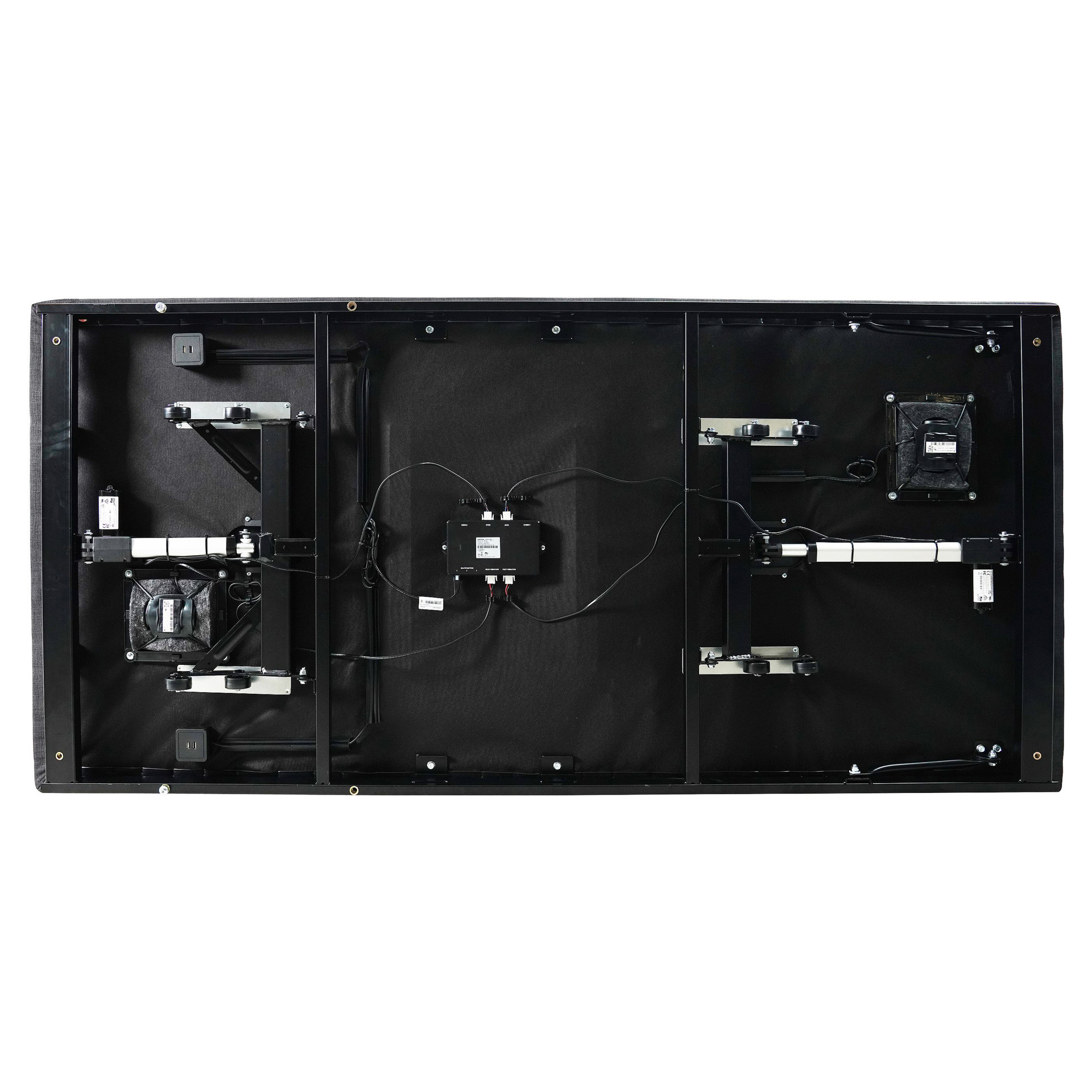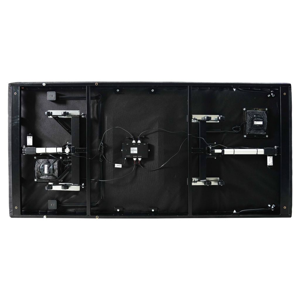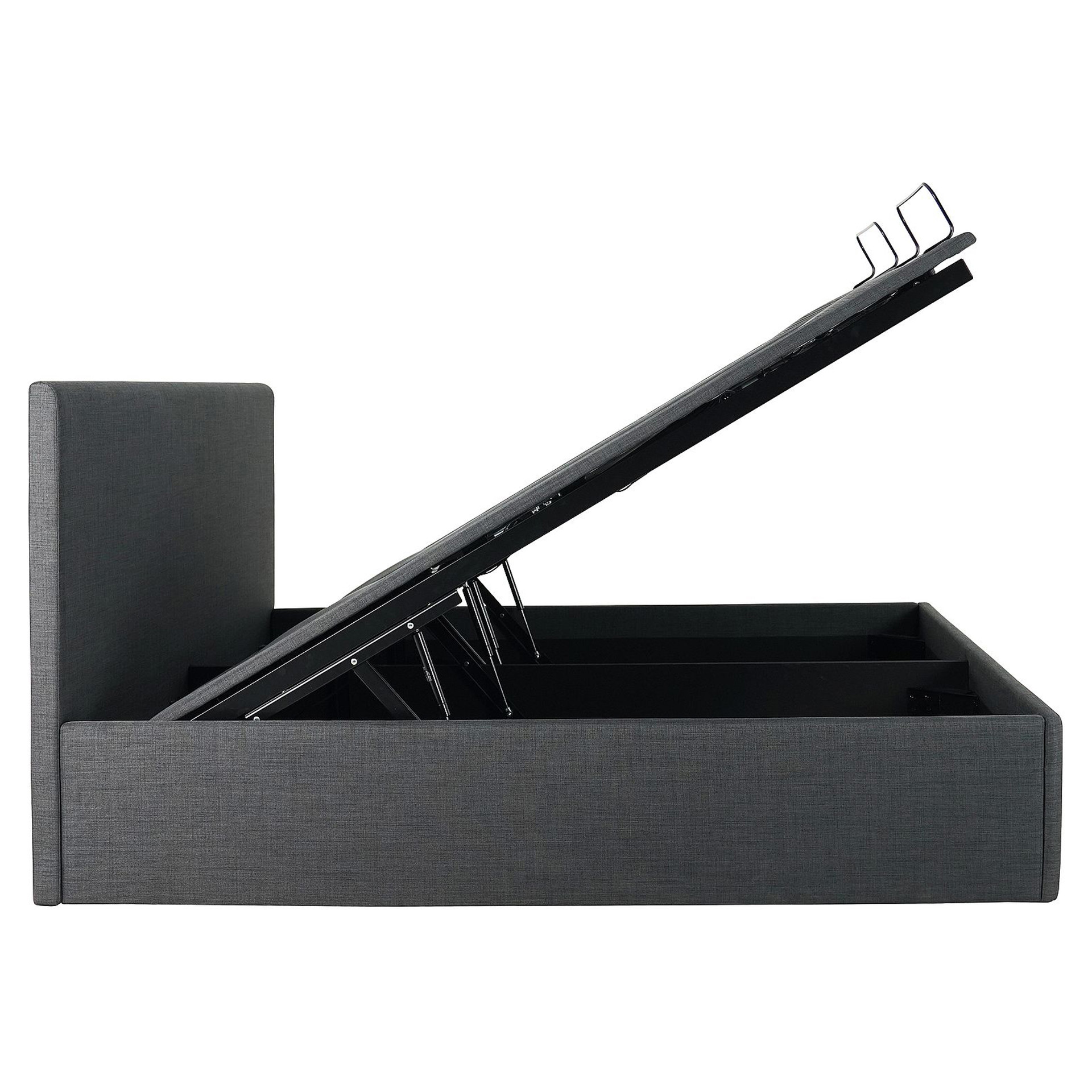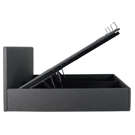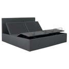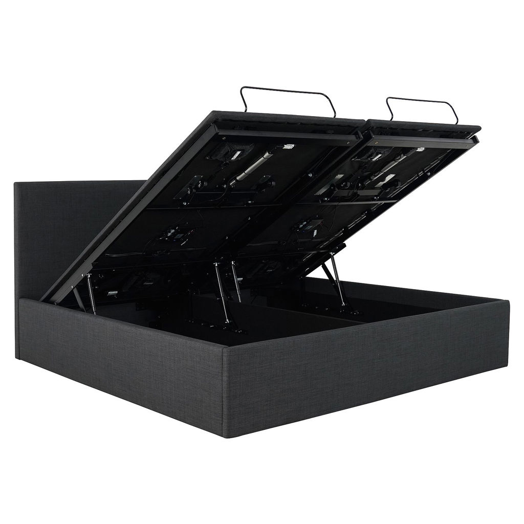 Upholstered bed complete with adjustable bed, 25 cubic feet of storage inside the bed, available in Queen and King sizes, vibration motors, 3 pre-programmed and adjustable positions, reset button, can be operated with one hand (raise and lower the bed).