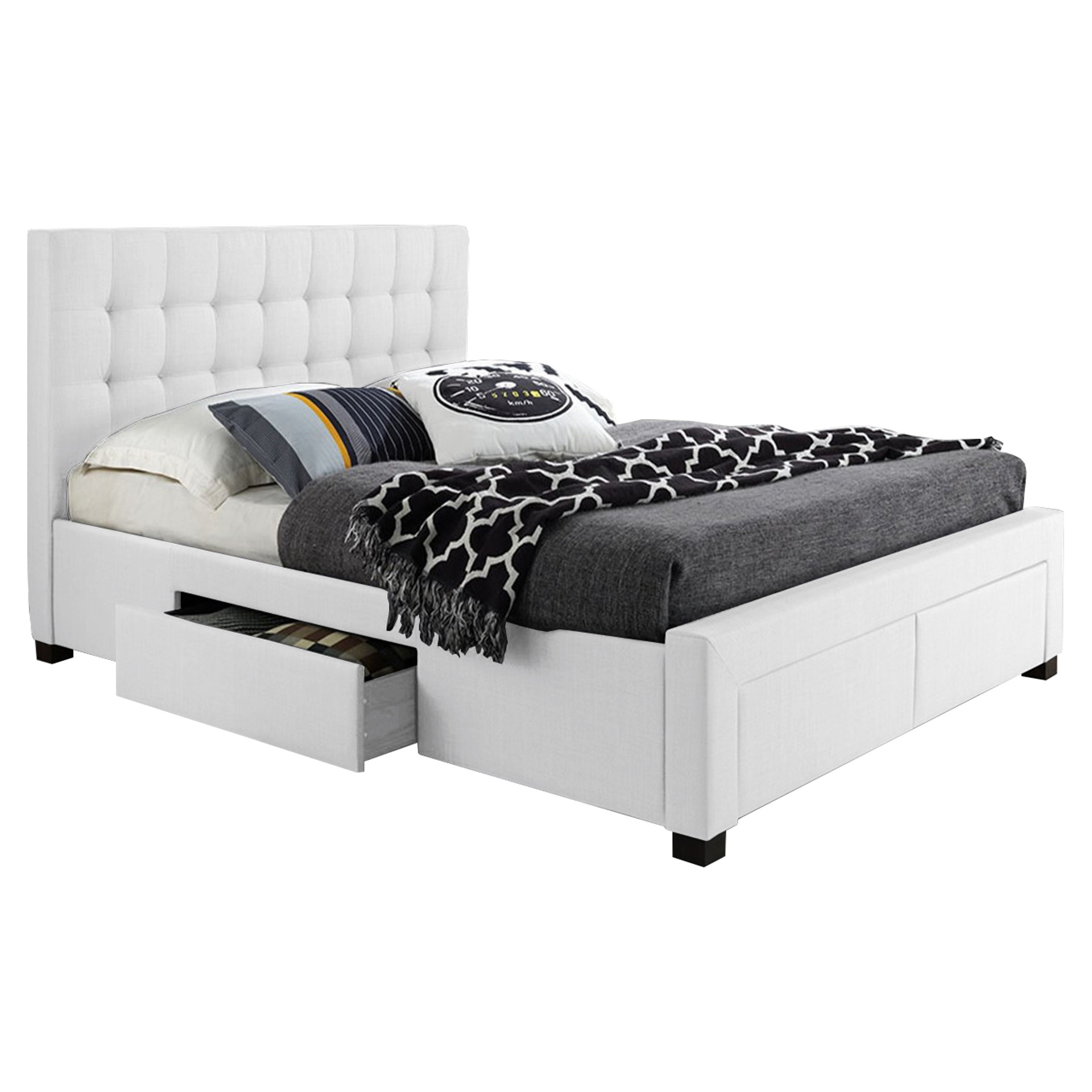 Ideal storage solution, this platform bed includes 2 step drawers and 2 side drawers. It is draped in a beautiful charcoal grey linen fabric. The contemporary design includes deep accents and clean lines. The drawers include full extension metal runners.