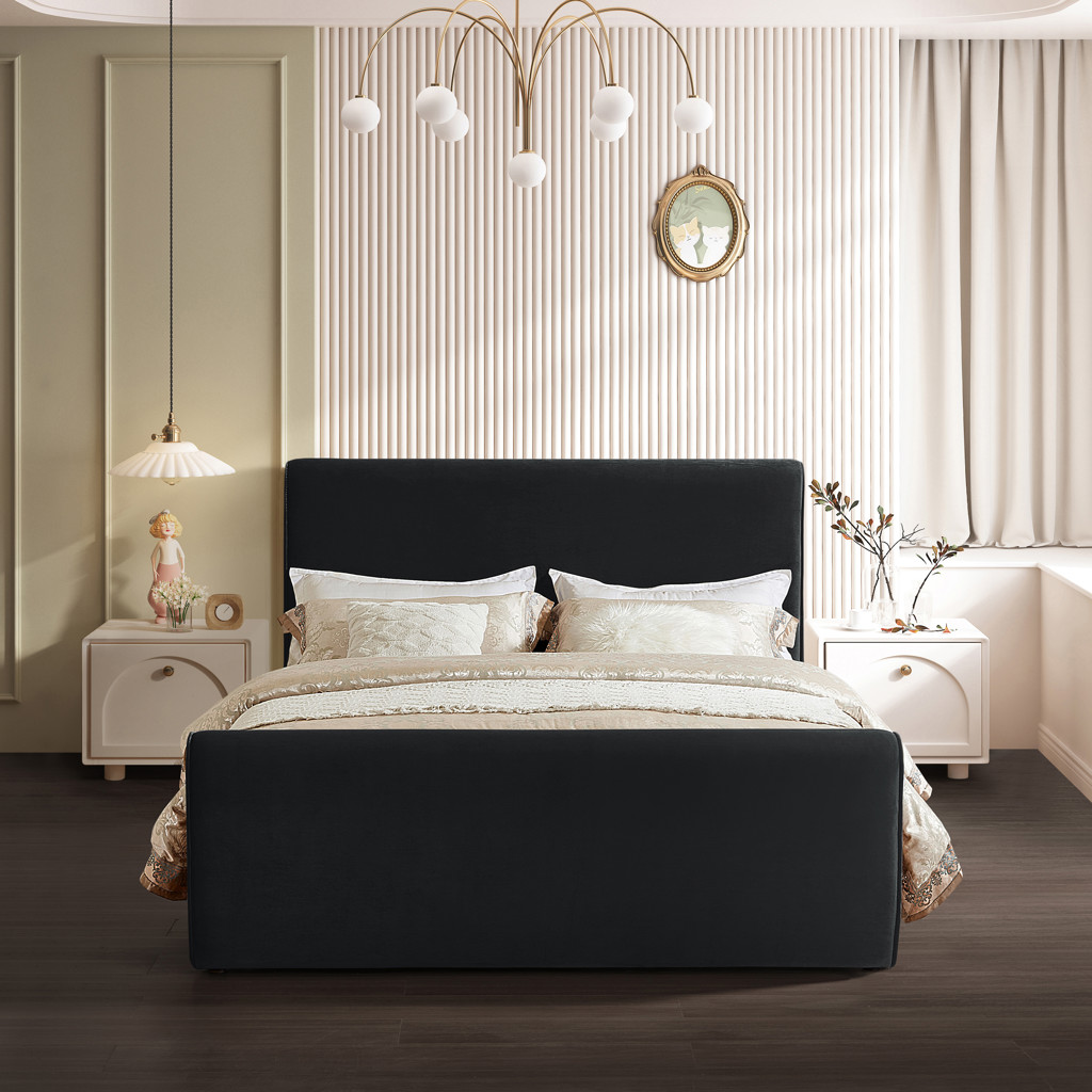 This stunningly beautiful bed is just the thing for a bedroom makeover that turns heads. The bed's headboard, footboard and sides are covered in the softest rich black velvet for a striking look that is elegantly contemporary in your master bedroom suite or other space.