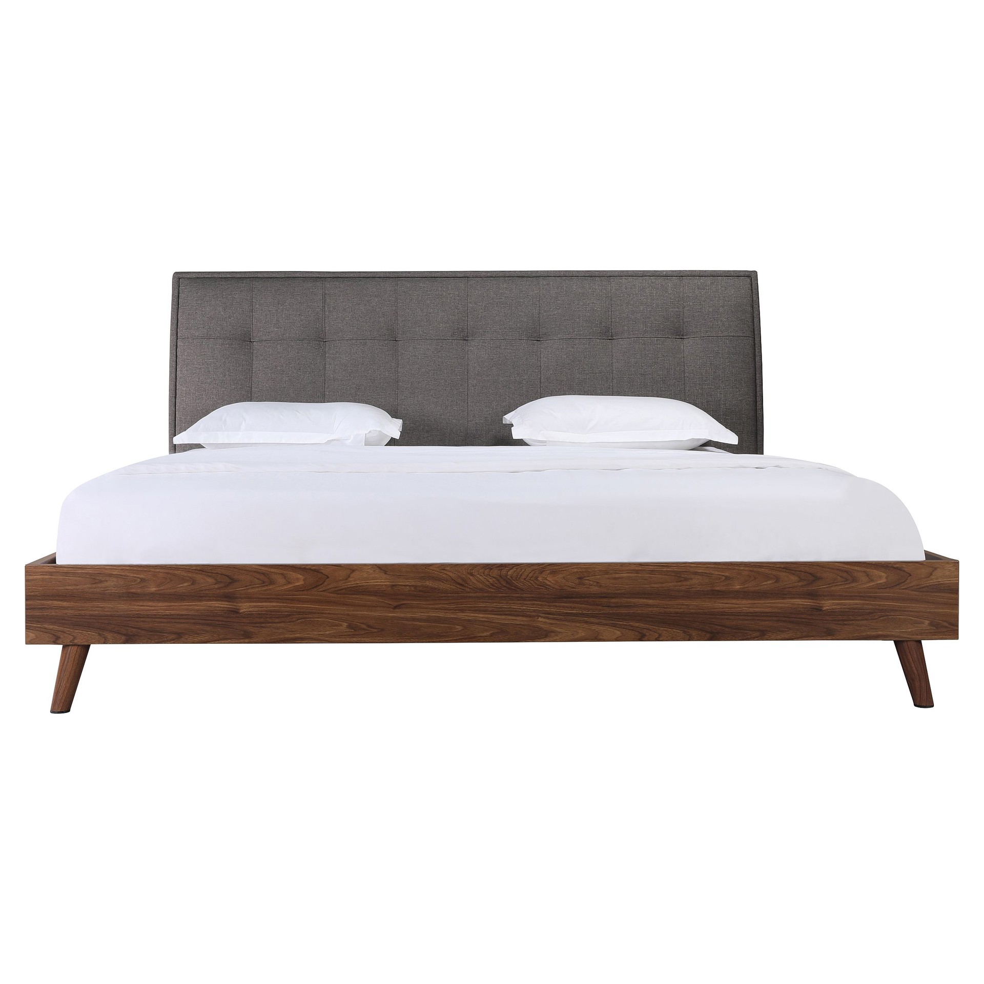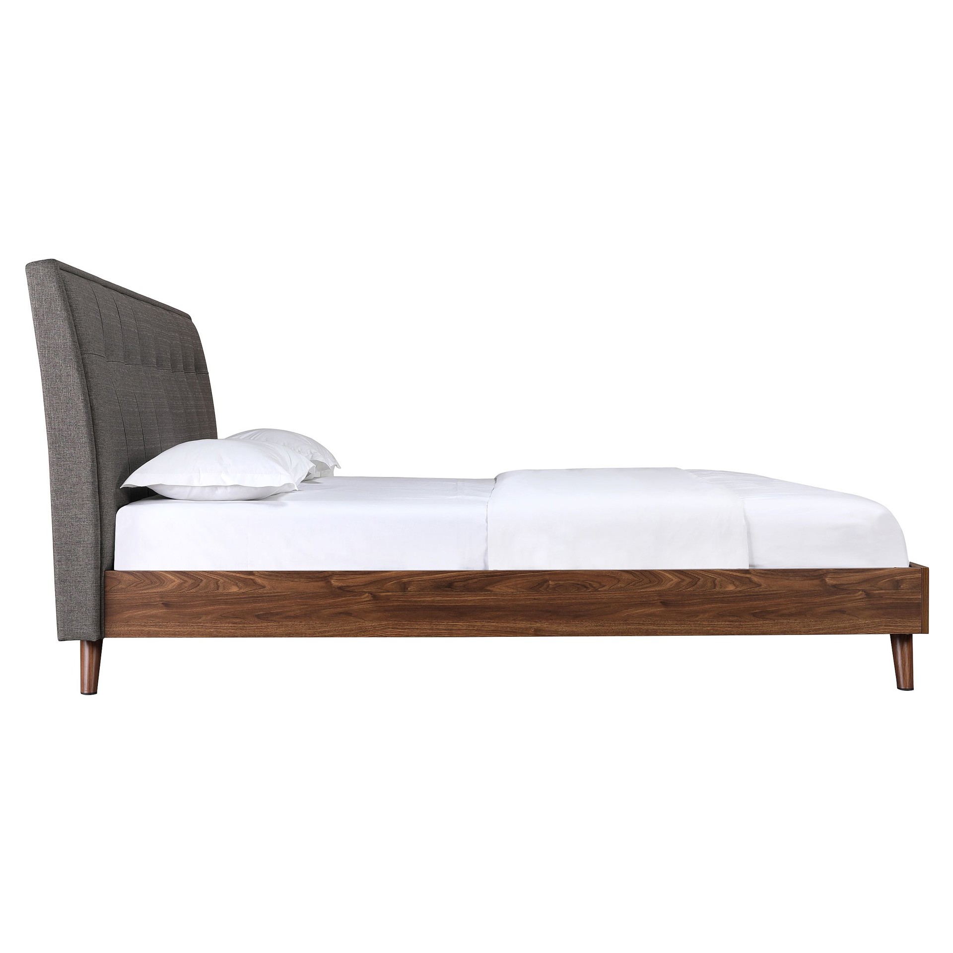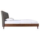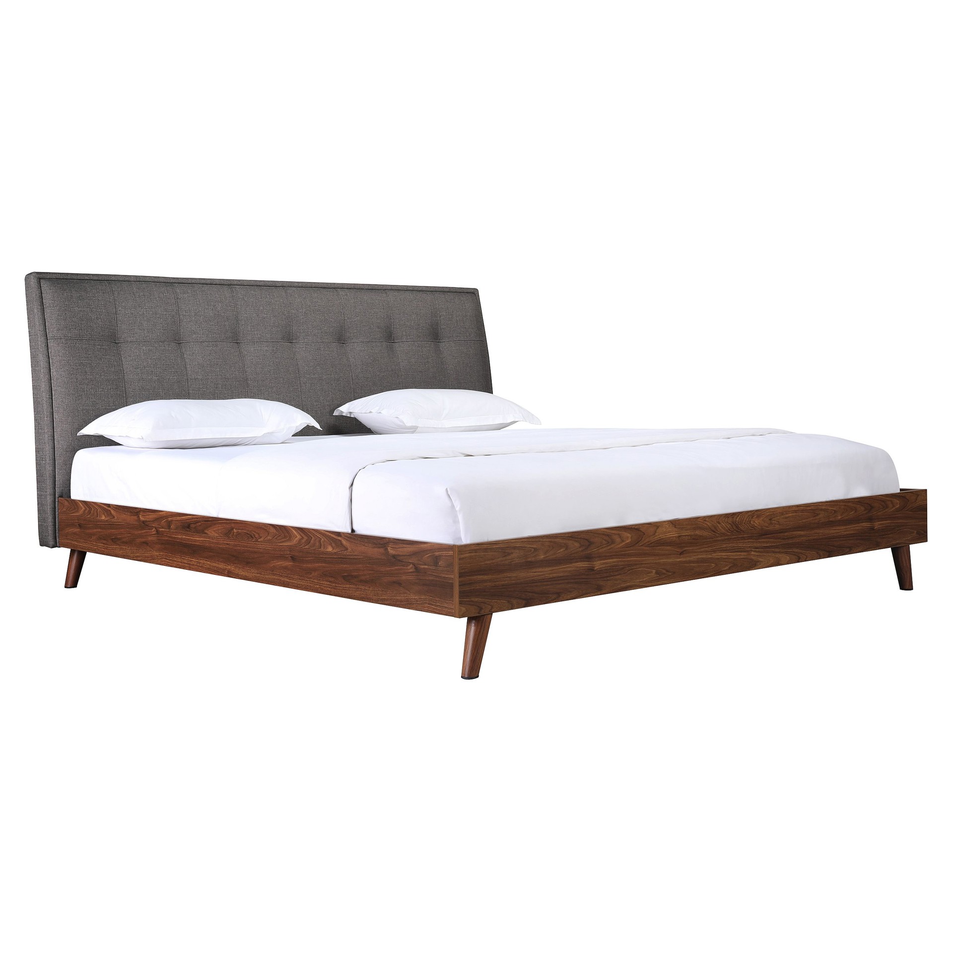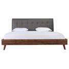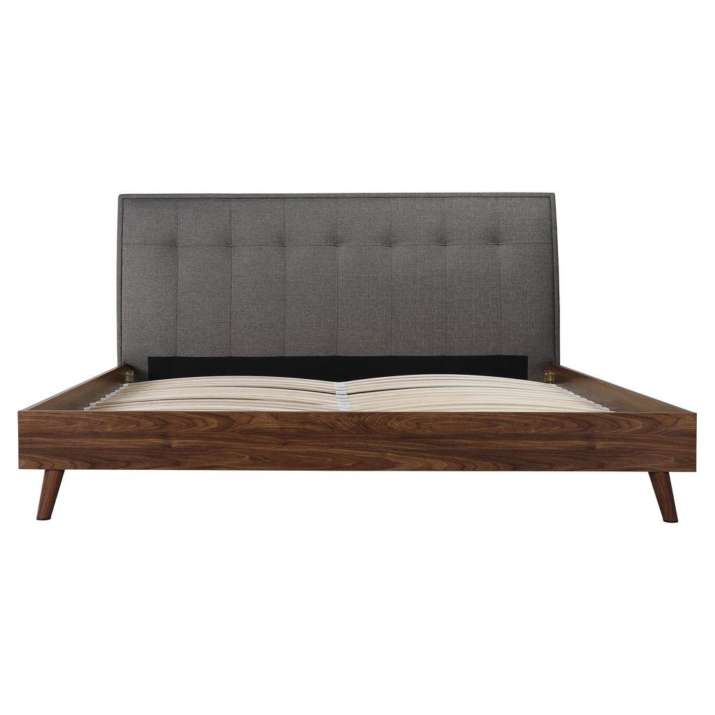 Designed for your contemporary bedroom, this bed is carefully crafted with great quality. Distinguished by its two-tone mixed look, a neutral grey linen upholstered headboard contrasts with great effect against the warm brown faux wood finish of the footboard.