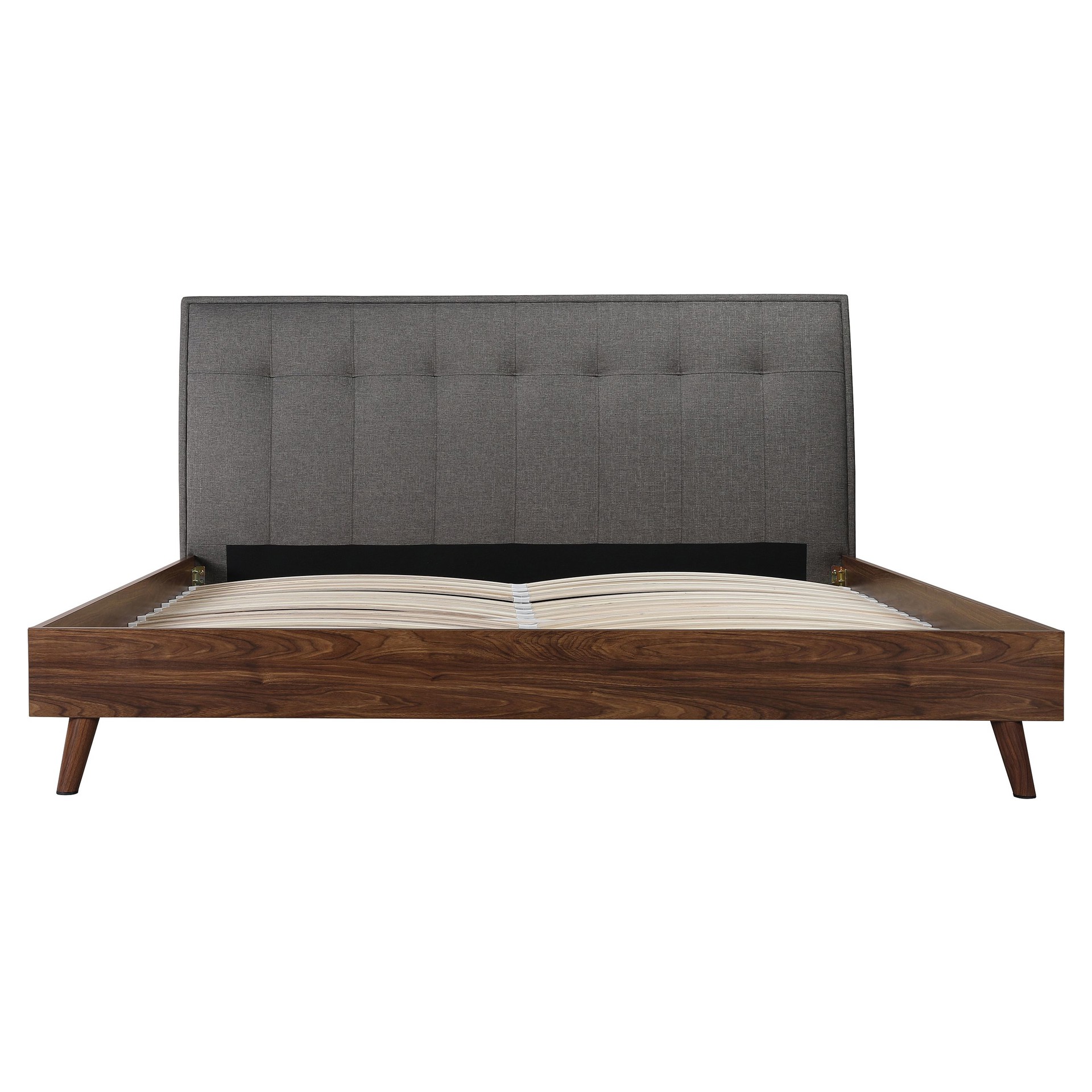 Resting on exposed sloping metal legs with the same brown wood finish, this low profile bed frame with platform design that allows you to skip the box spring and place your mattress directly on top.
