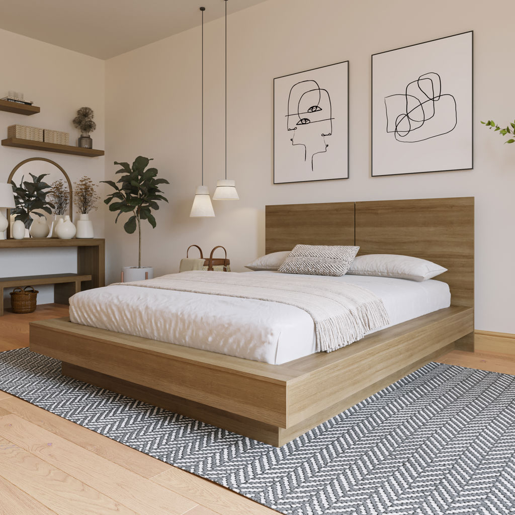 The central supports and concealed plinth base create a unique floating effect, giving your bedroom a distinctive look. This platform bed is compatible with your favorite mattress (sold separately), eliminating the need for a box spring thanks to reliable center supports. Easy assembly, and your new platform bed will be delivered straight to your door, ensuring ease at every step of the process.