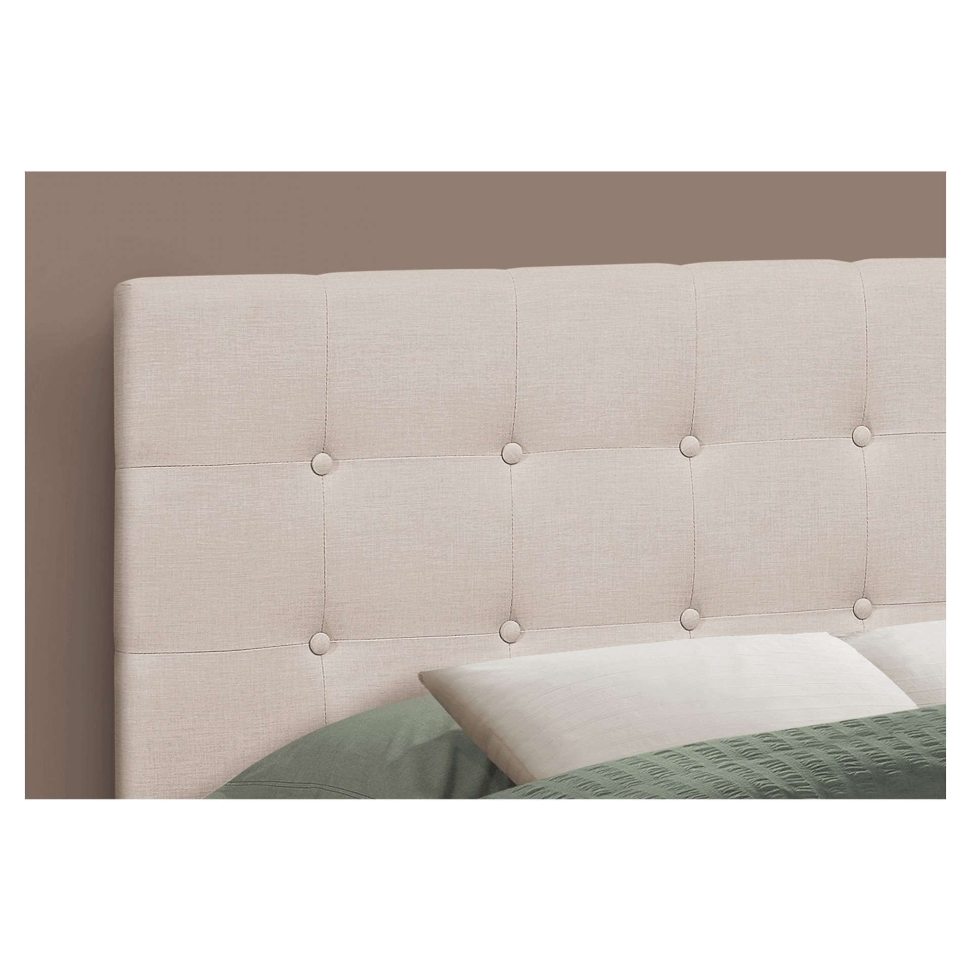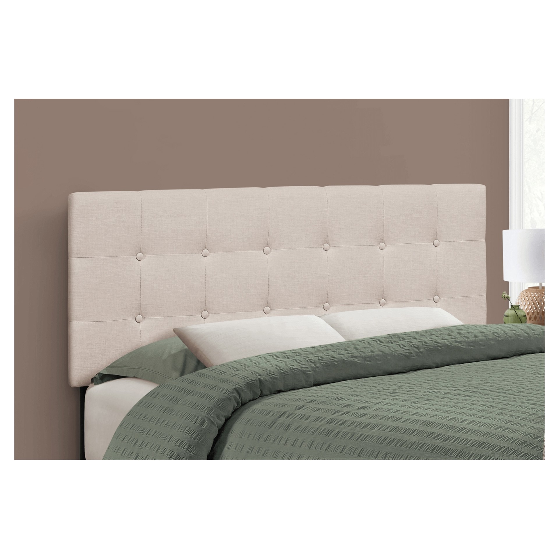 Bring sophisticated style to any bedroom with this upholstered headboard panel in a beige linen-look fabric. Button tufted with extra padding for an ultra-soft feel, it will let you drift off to sleep in ultimate comfort.