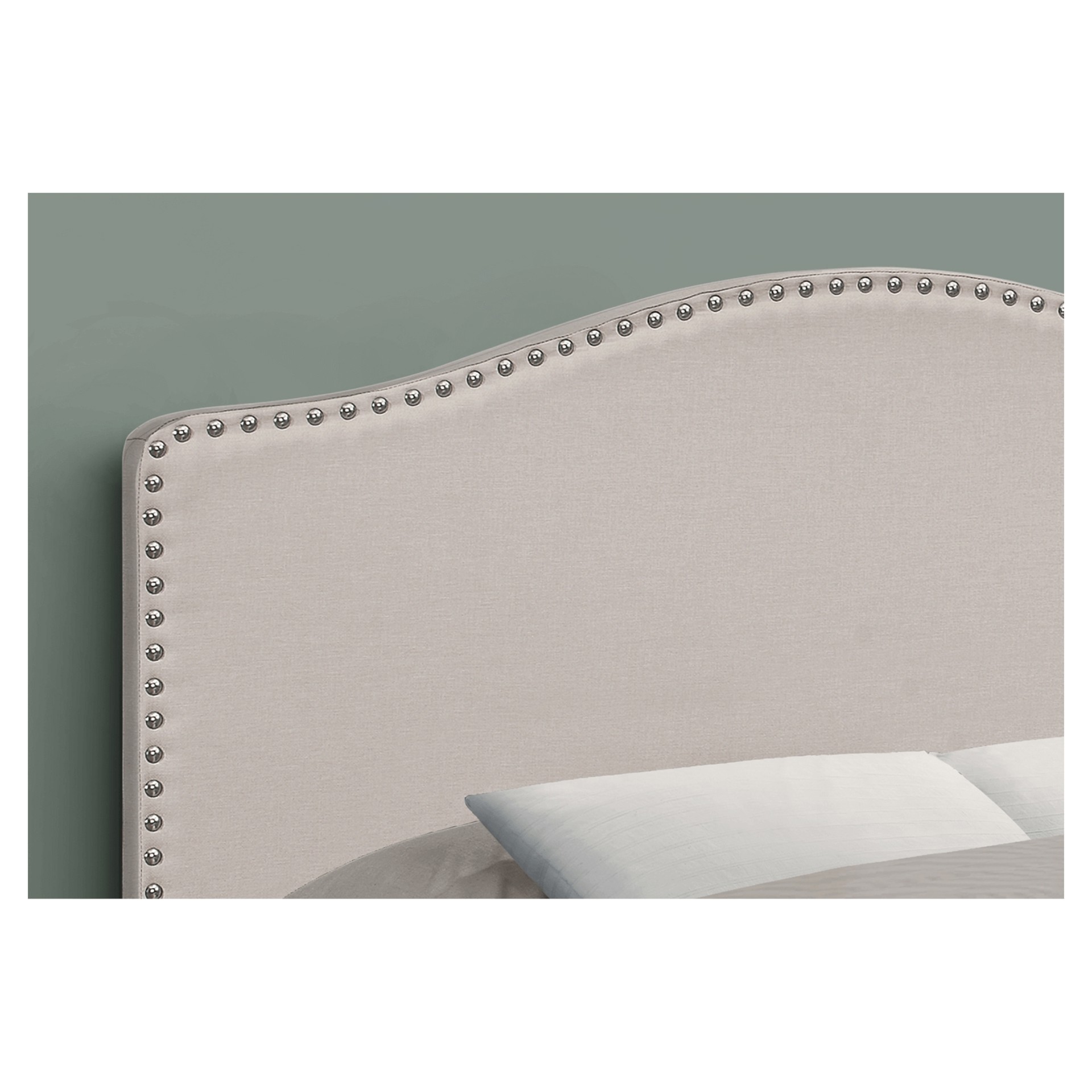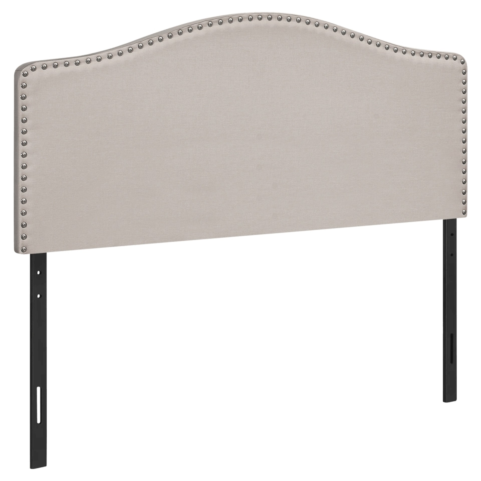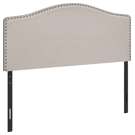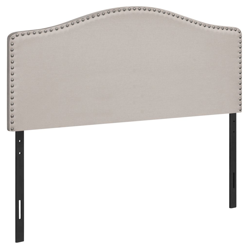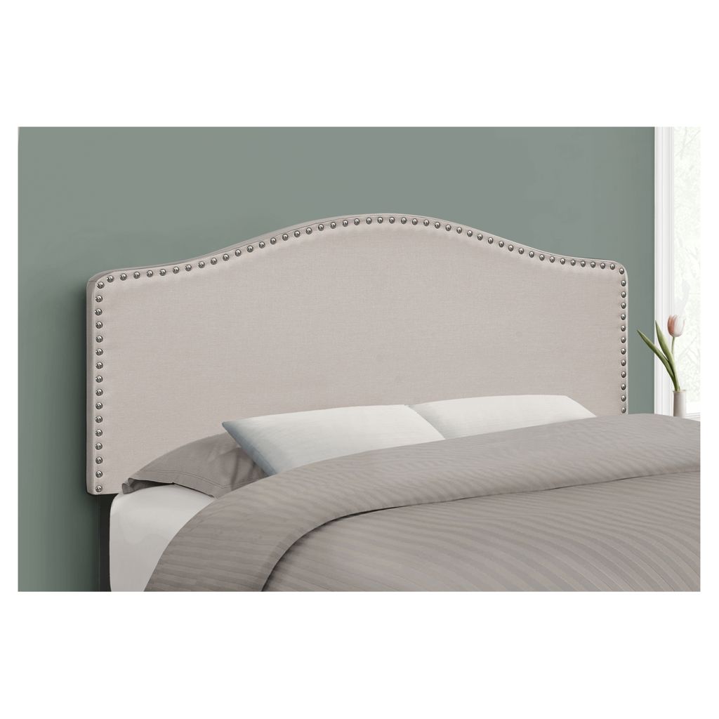 This arched top headboard is upholstered in a beige linen-look fabric and finished with chromed nailhead trim. Made with a wooden frame for durability and stability, it is designed to be used with a double-size box spring and mattress (not included).