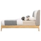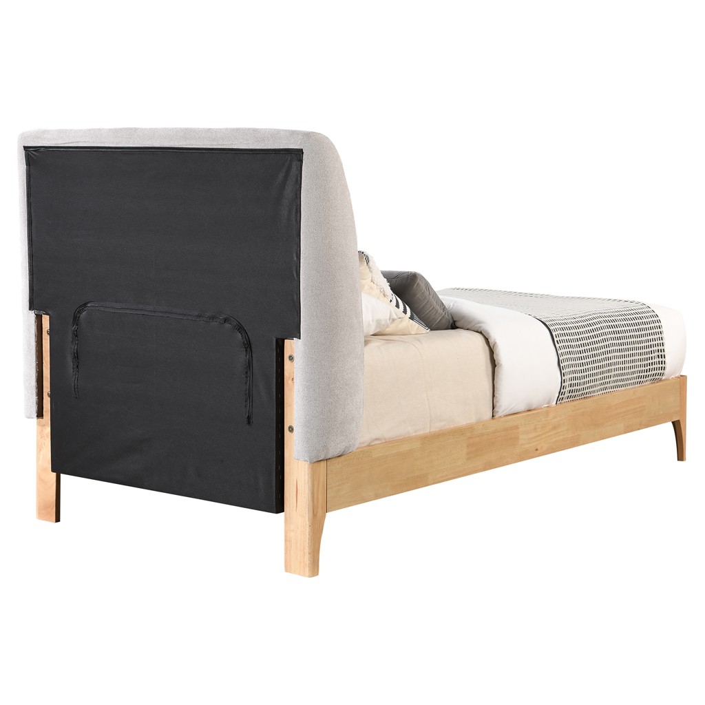Solid wood legs in a natural finish form a contrast that enhances the bed's overall aesthetic.