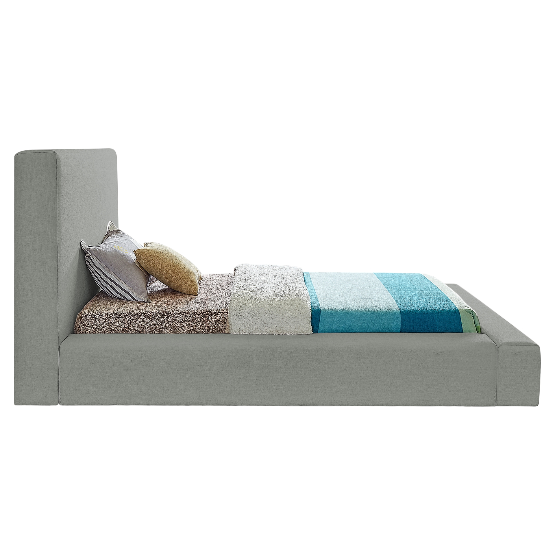 This handsome bed has a distinctive upscale look, with its luxe grey linen textured fabric covering every square inch, from headboard to side rails and footboard, which are 8 inches thick for a luxuriously soft feel and comfort against your body while you relax and unwind before catching some Zs.