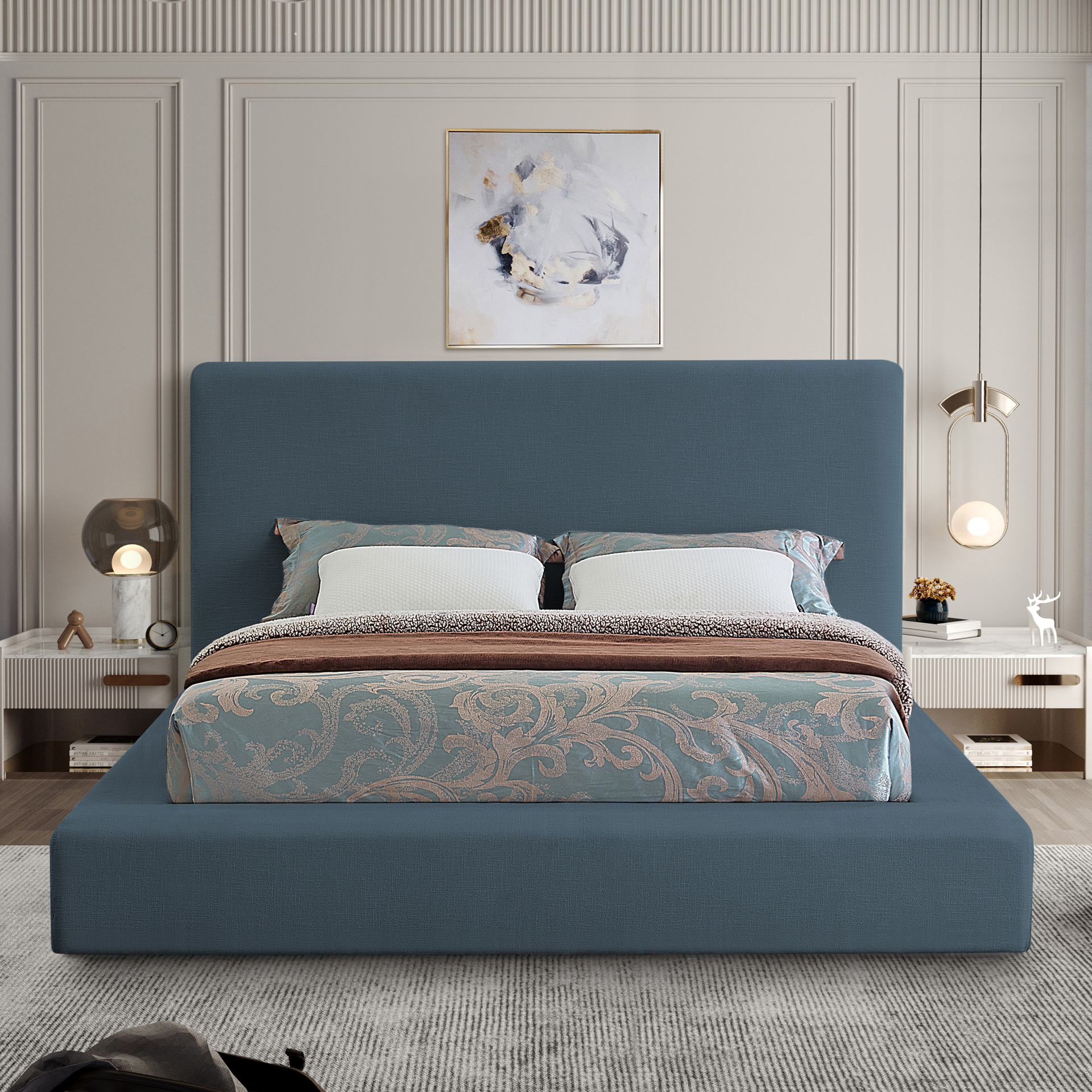 This handsome bed has a distinctive upscale look, with its luxe navy linen textured fabric covering every square inch, from headboard to side rails and footboard, which are 8 inches thick for a luxuriously soft feel and comfort against your body while you relax and unwind before catching some Zs.