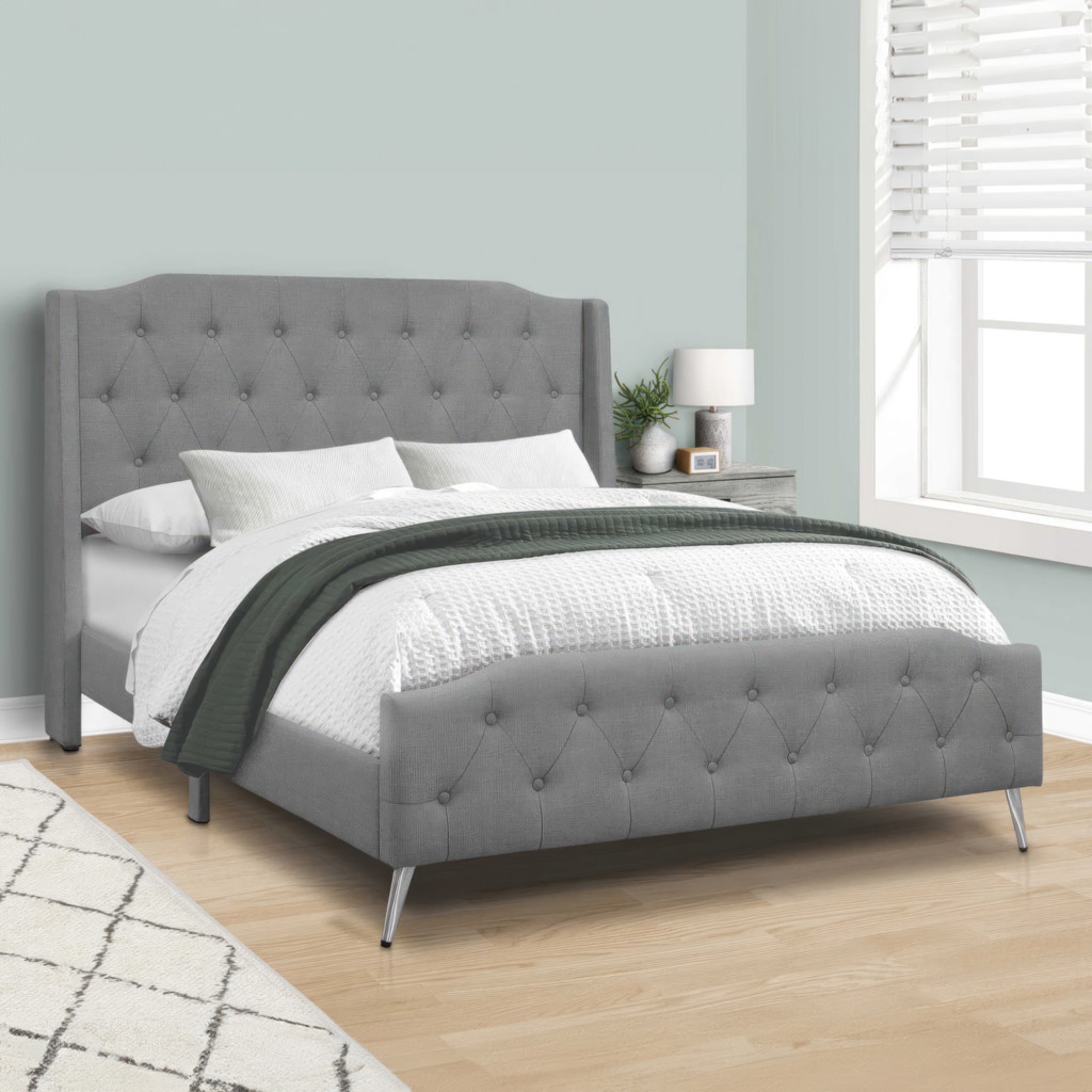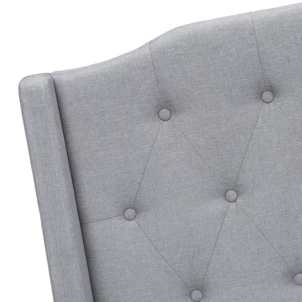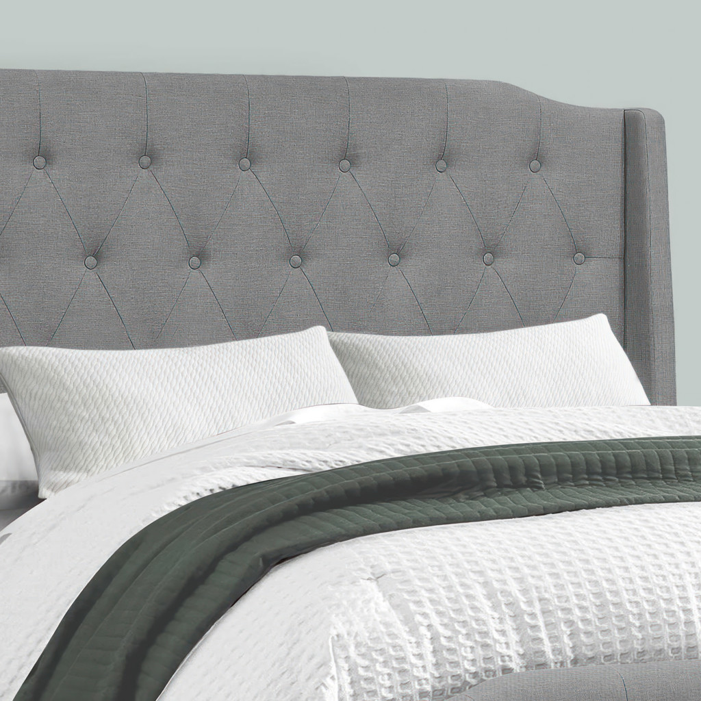 Bring a luxurious feel to your bedroom with the updated classic styling of this queen-size, upholstered bedframe with a wingback headboard. Covered in an elegant grey linen-look fabric over foam cushioning on all sides, this bed is embellished with button tufting on both the gently arched headboard and footboard for an opulent appeal.